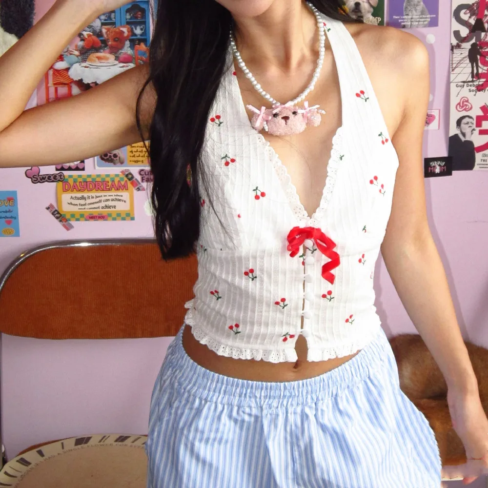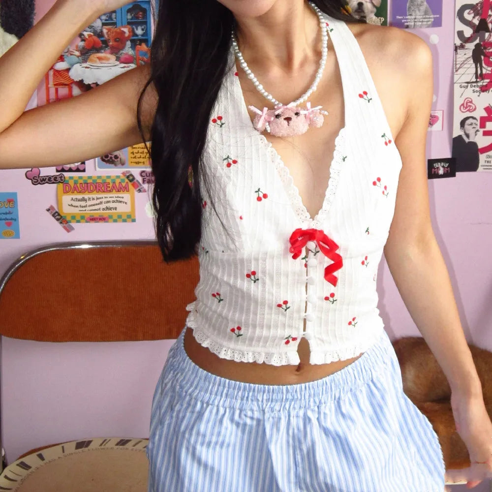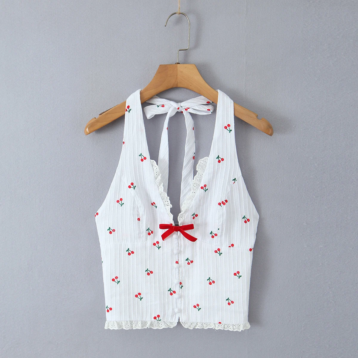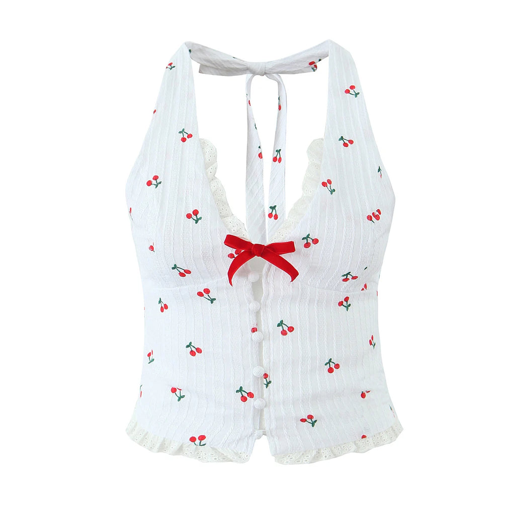 Purpdrank Sexy White Red Fruit Tie Bow Halter V neck Open Buttons Slim Tank Top Women Spliced Lace Hem Sleeveless Backless Tee Summer Vest