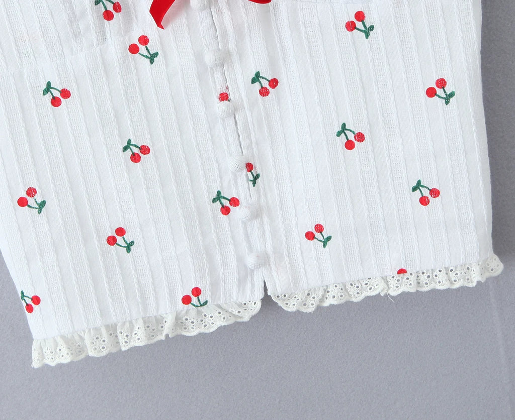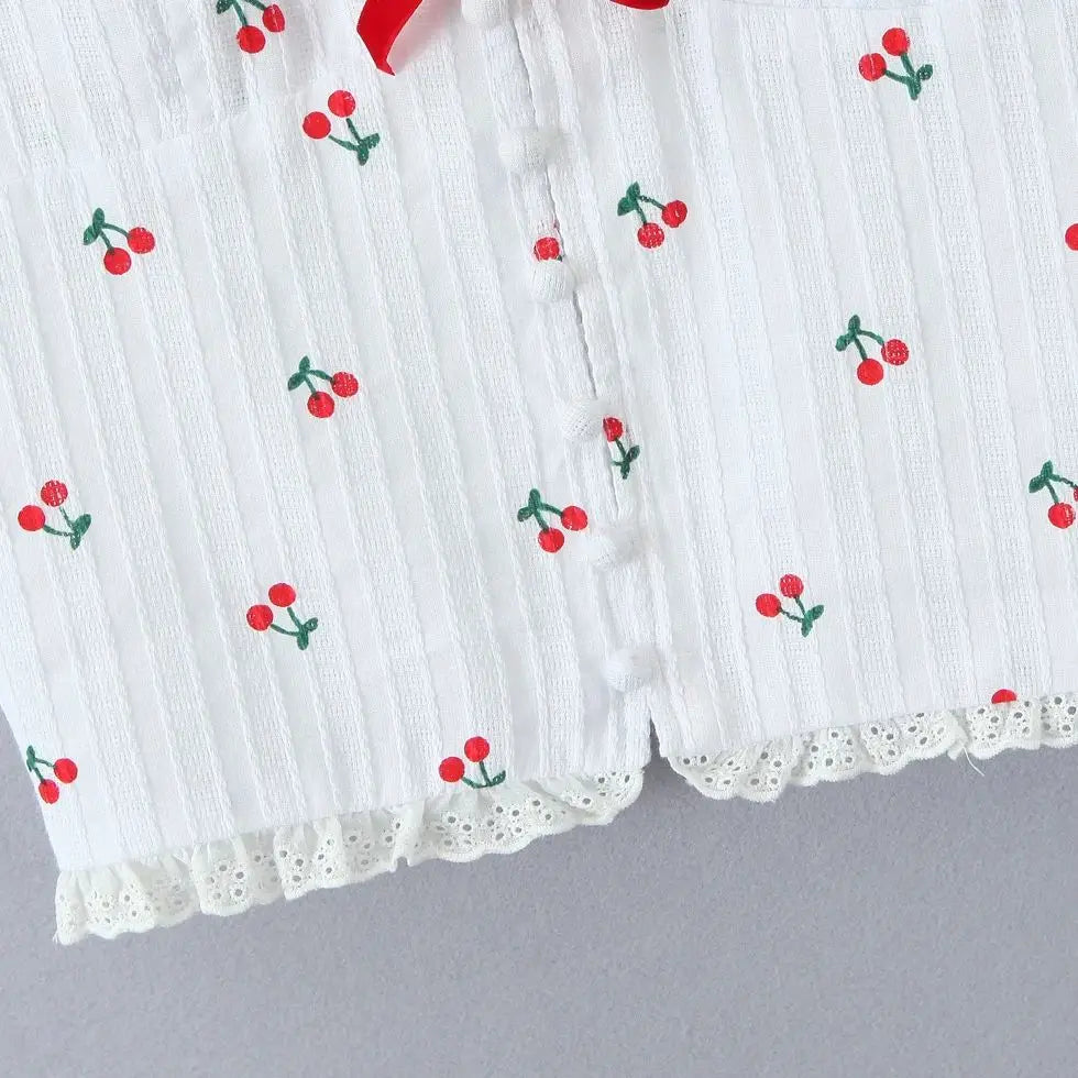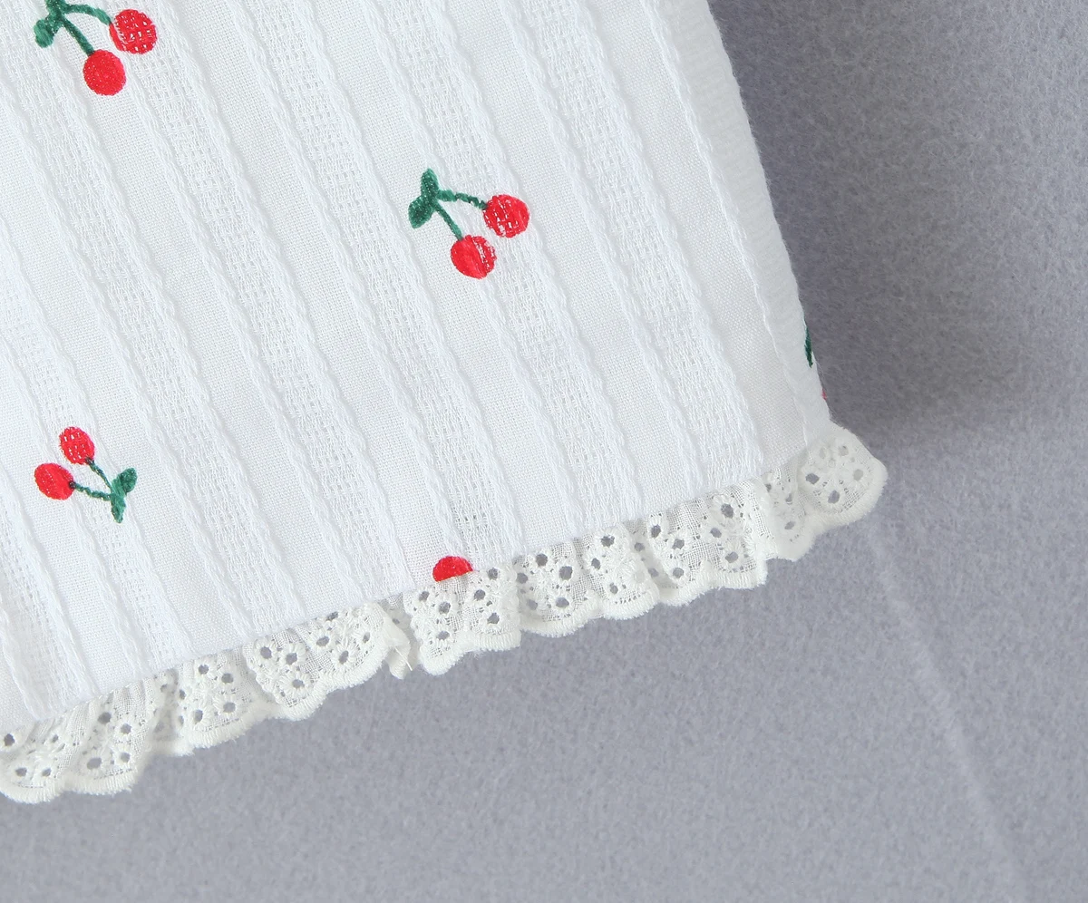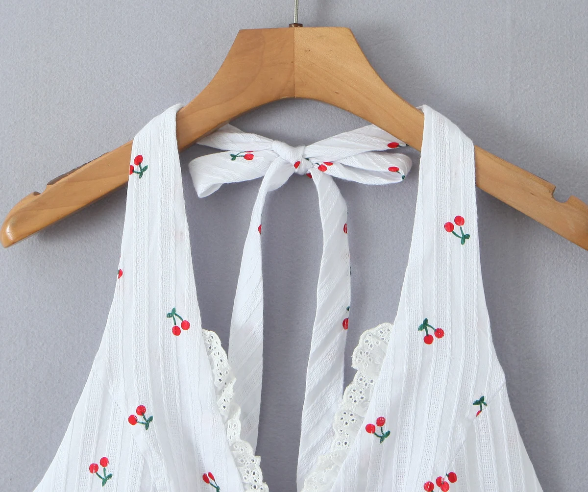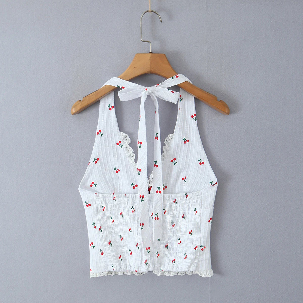 Purpdrank Sexy White Red Fruit Tie Bow Halter V neck Open Buttons Slim Tank Top Women Spliced Lace Hem Sleeveless Backless Tee Summer Vest