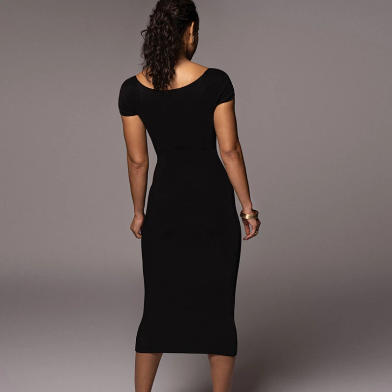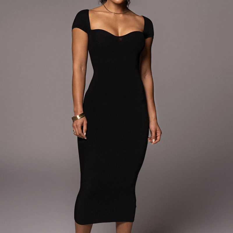 Purpdrank Sexy Women Solid Square Collar Bodycon Dress Summer Short Sleeve Long Ribbed Dress Elegant Party Club Overalls
