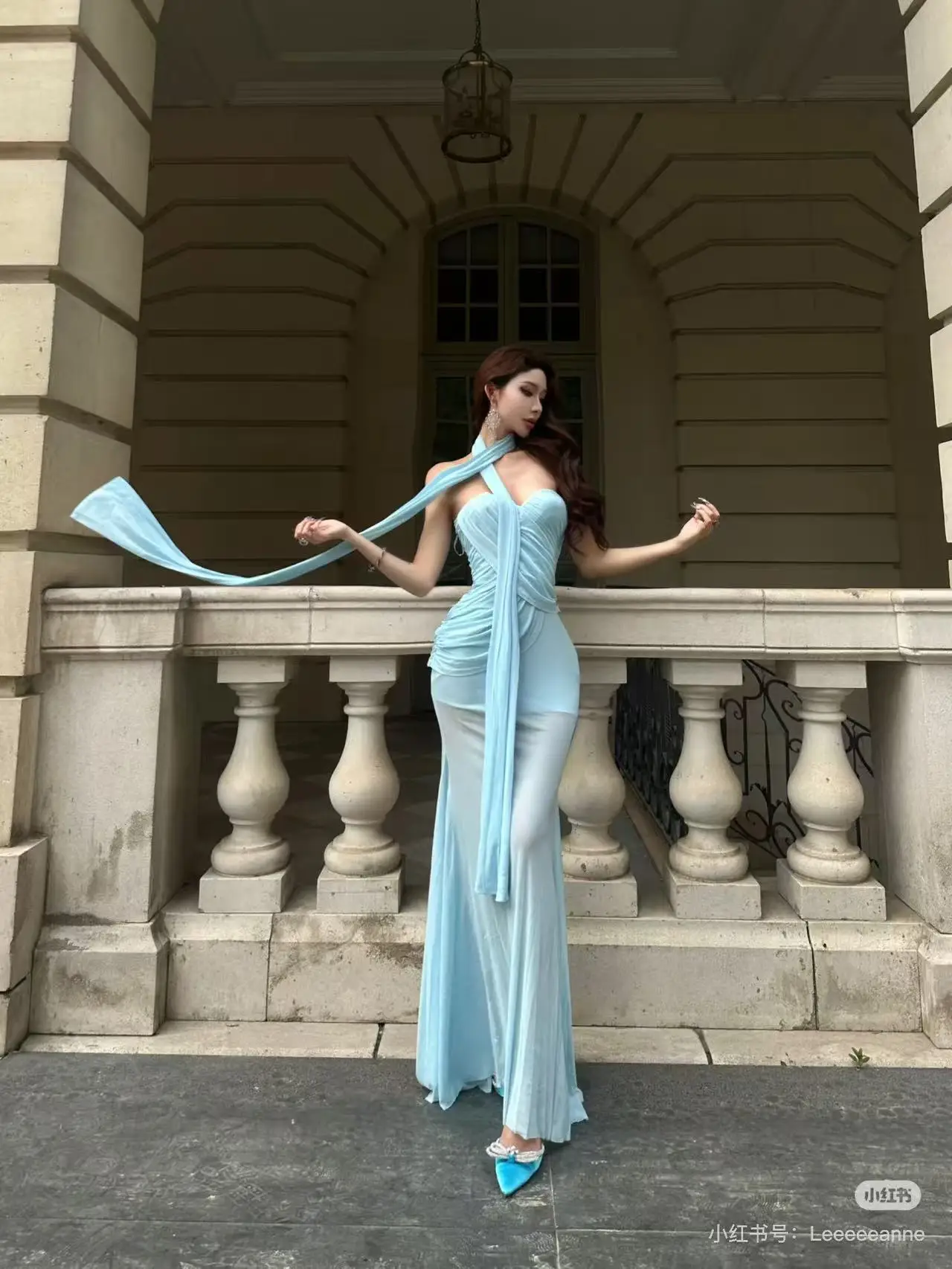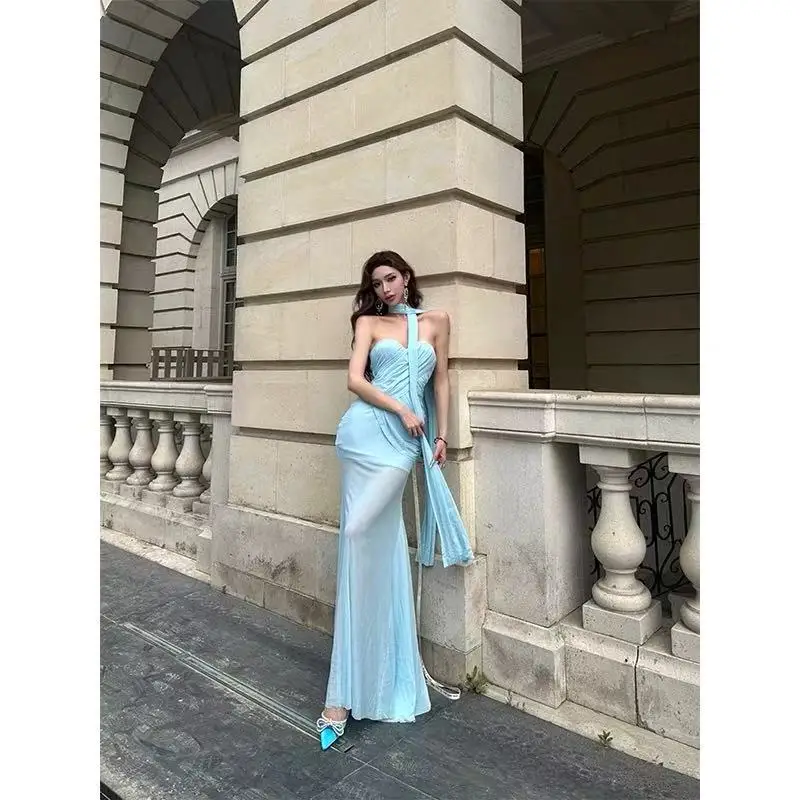 Purpdrank Sheer Luck KiraSheer Mesh Ribbon Slim Fit Ruched Asymmetric Mermaid Long Dress
