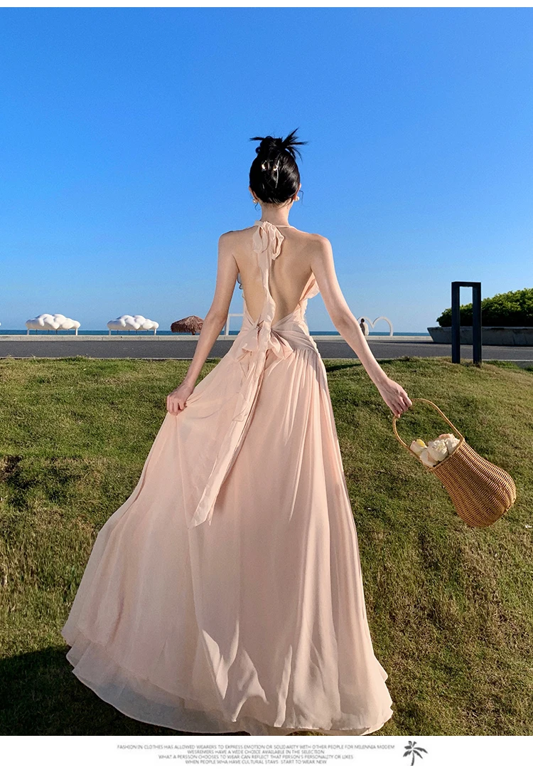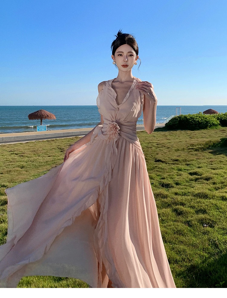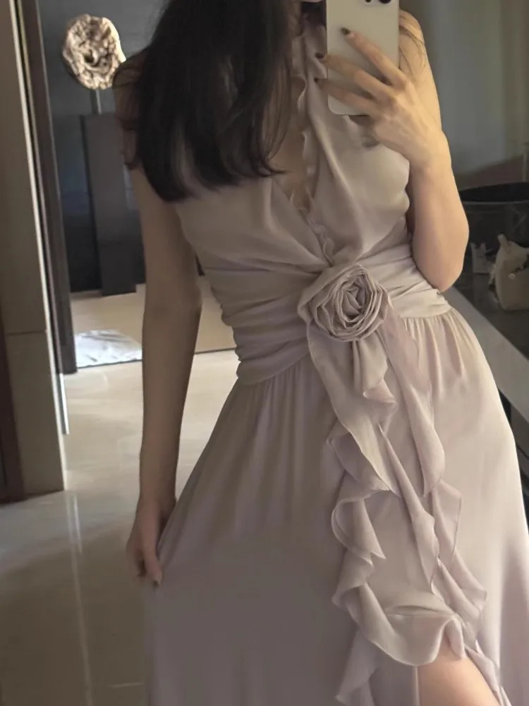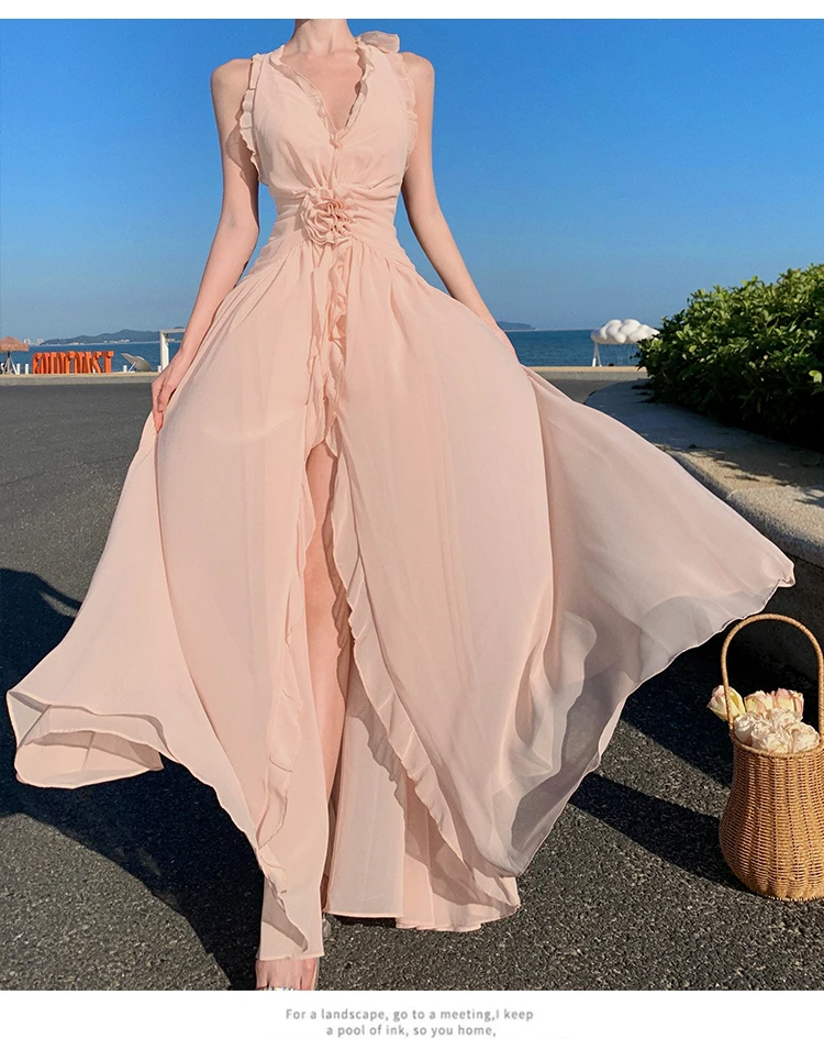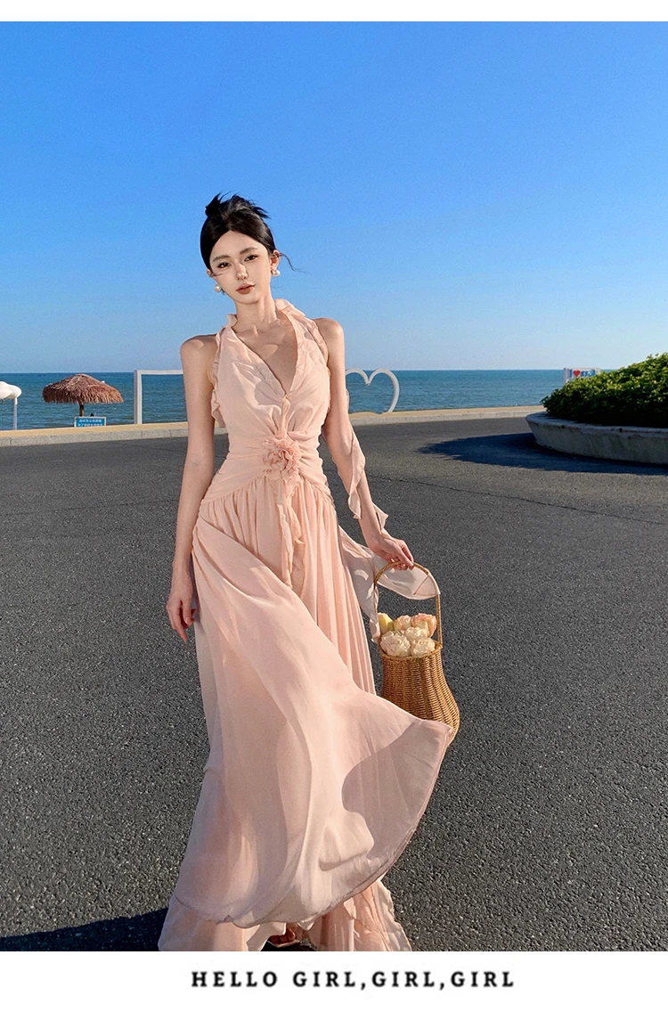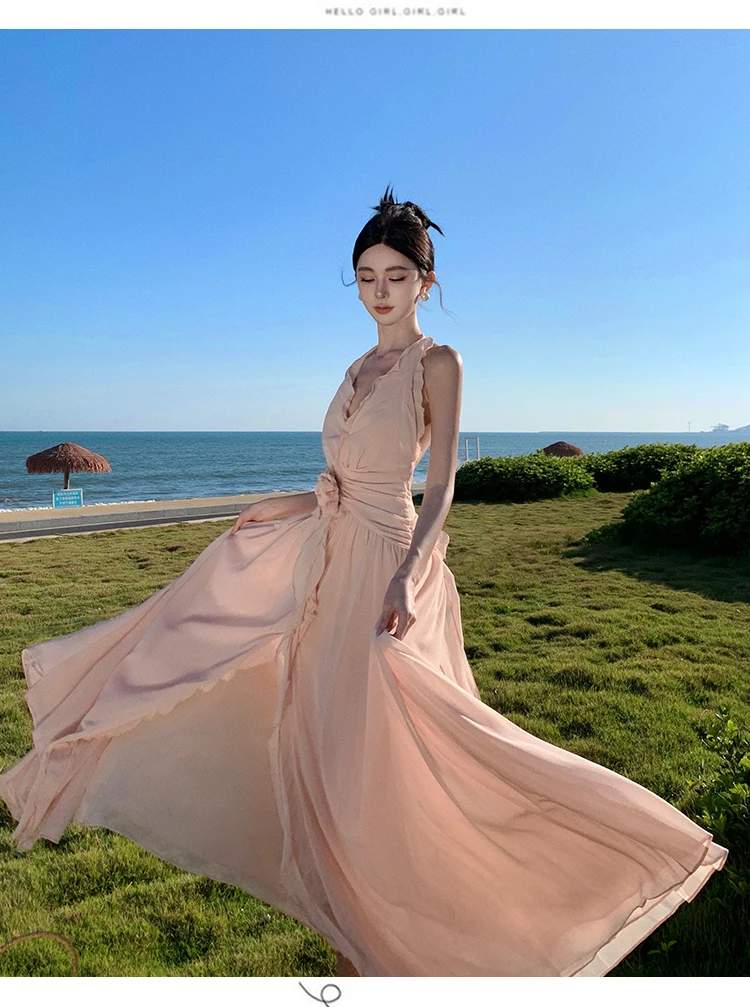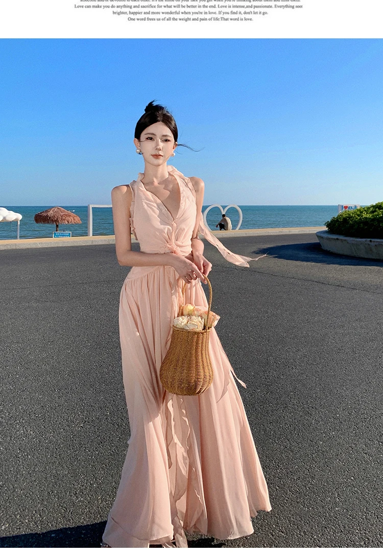 Purpdrank Sleeveless V-neck Halter Dress Gentle Ruffle Edge Backless Long Beach Dress Flowing Long Dress