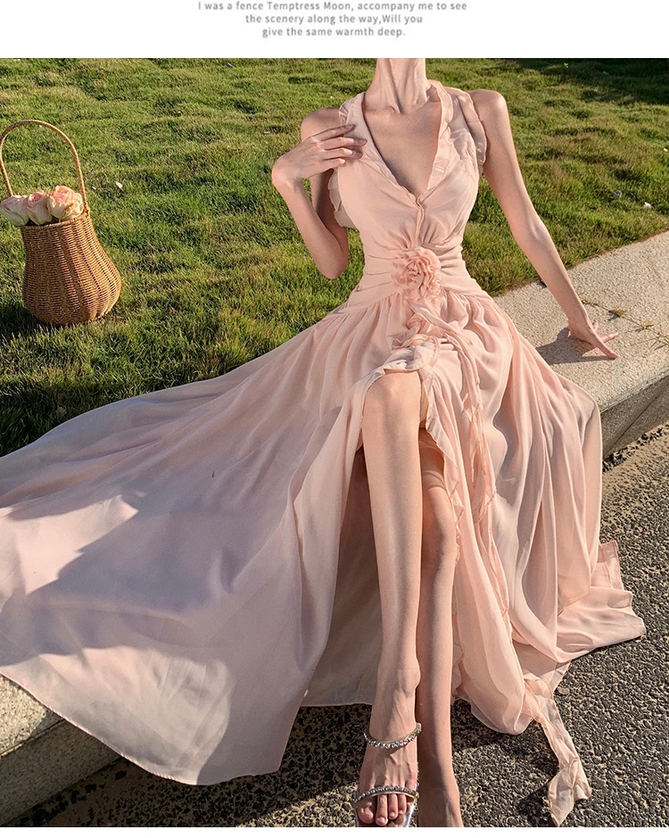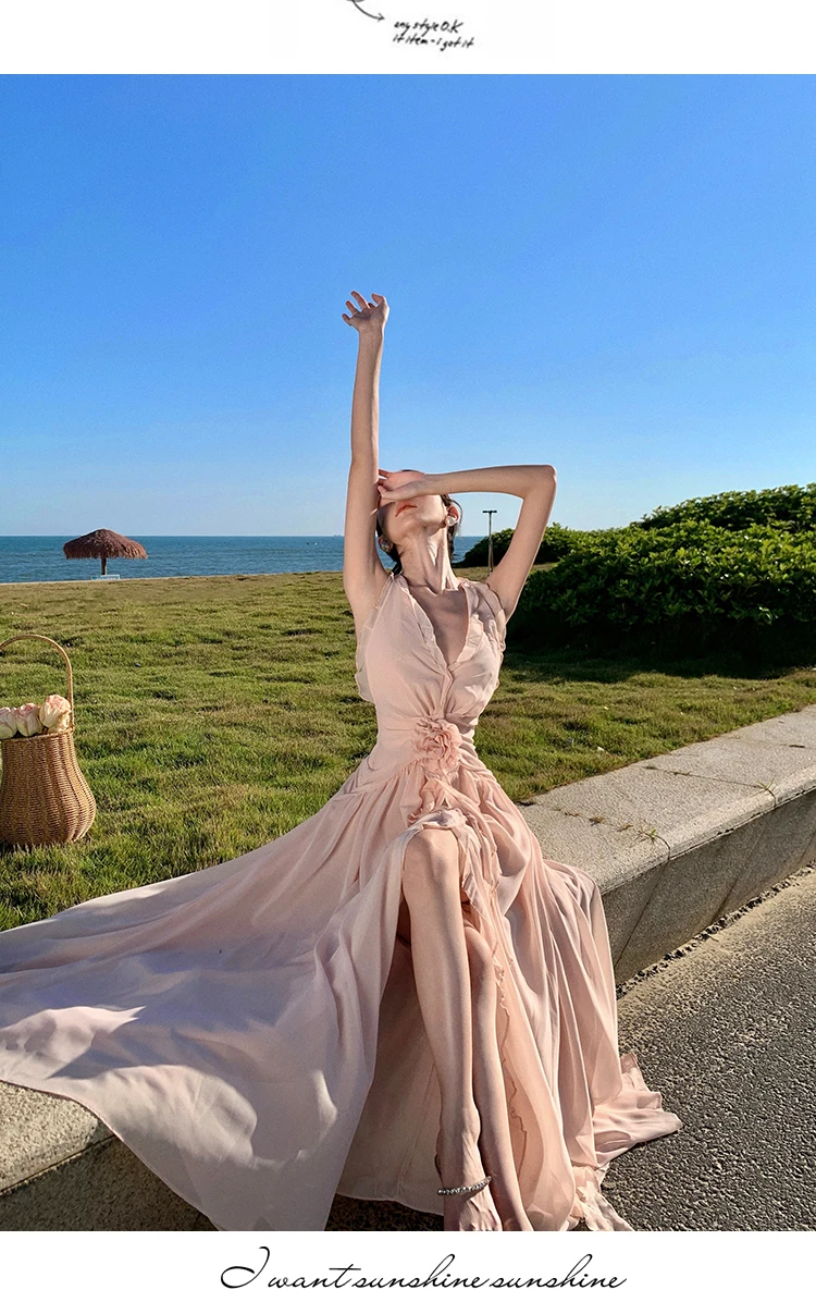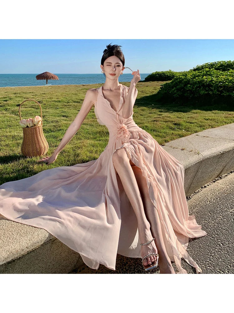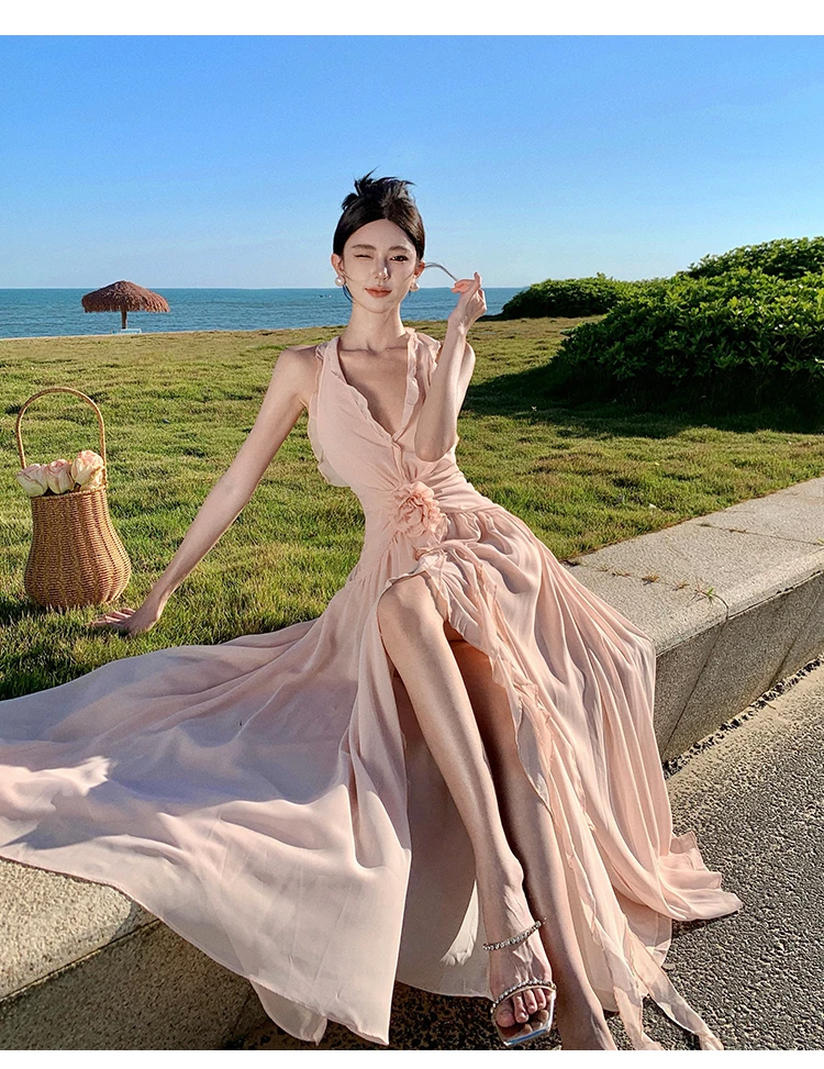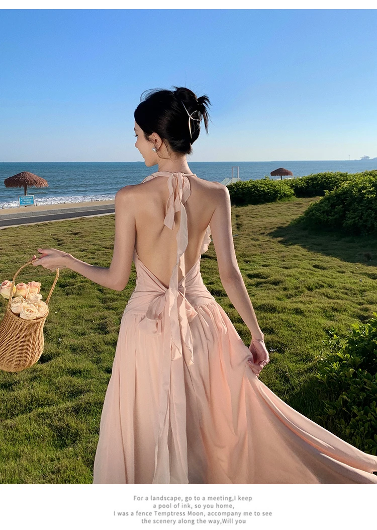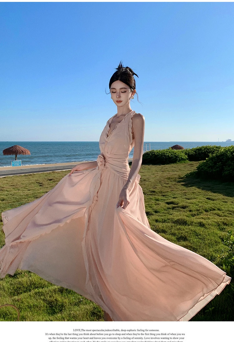Purpdrank Sleeveless V-neck Halter Dress Gentle Ruffle Edge Backless Long Beach Dress Flowing Long Dress