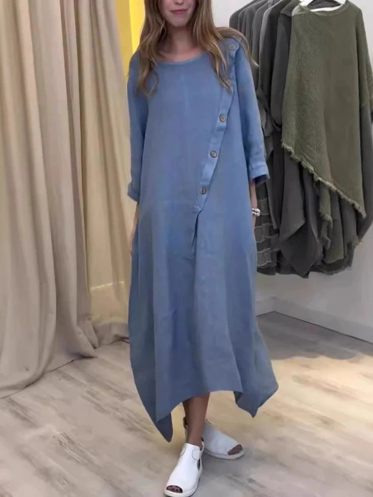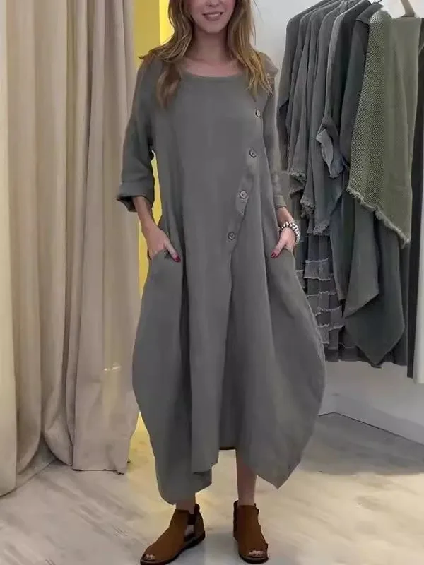 Purpdrank Summer Fashion New Women's Elegant Loose Cotton Hemp Dress Round Neck Solid Color Half Sleeve Long Dress