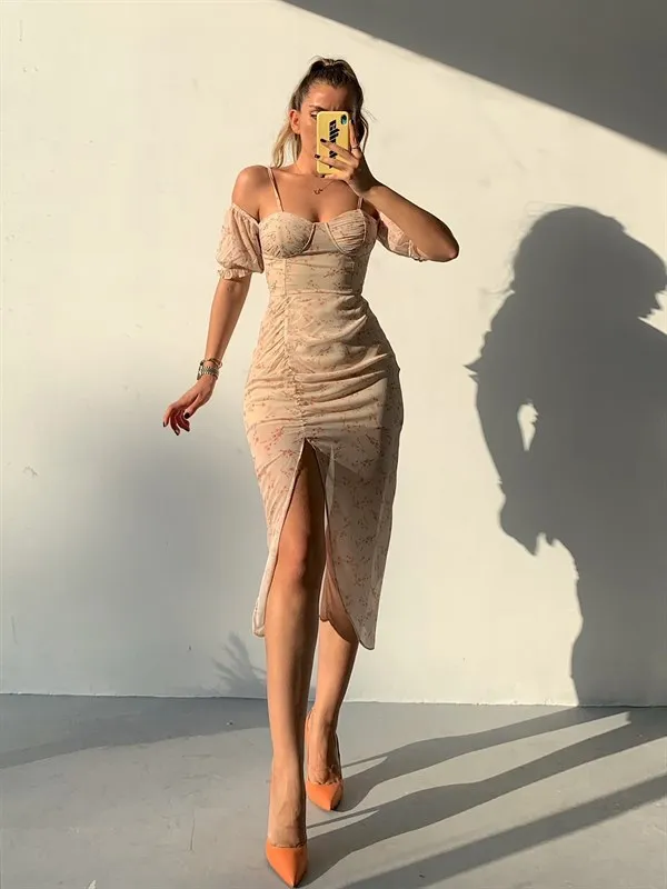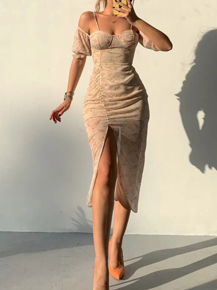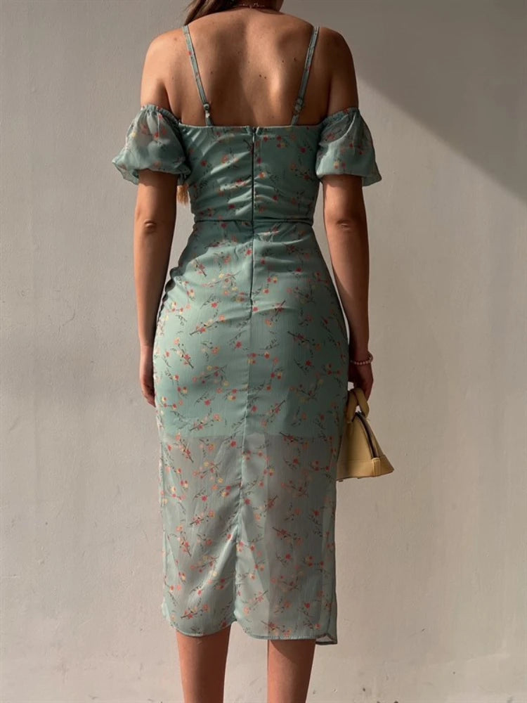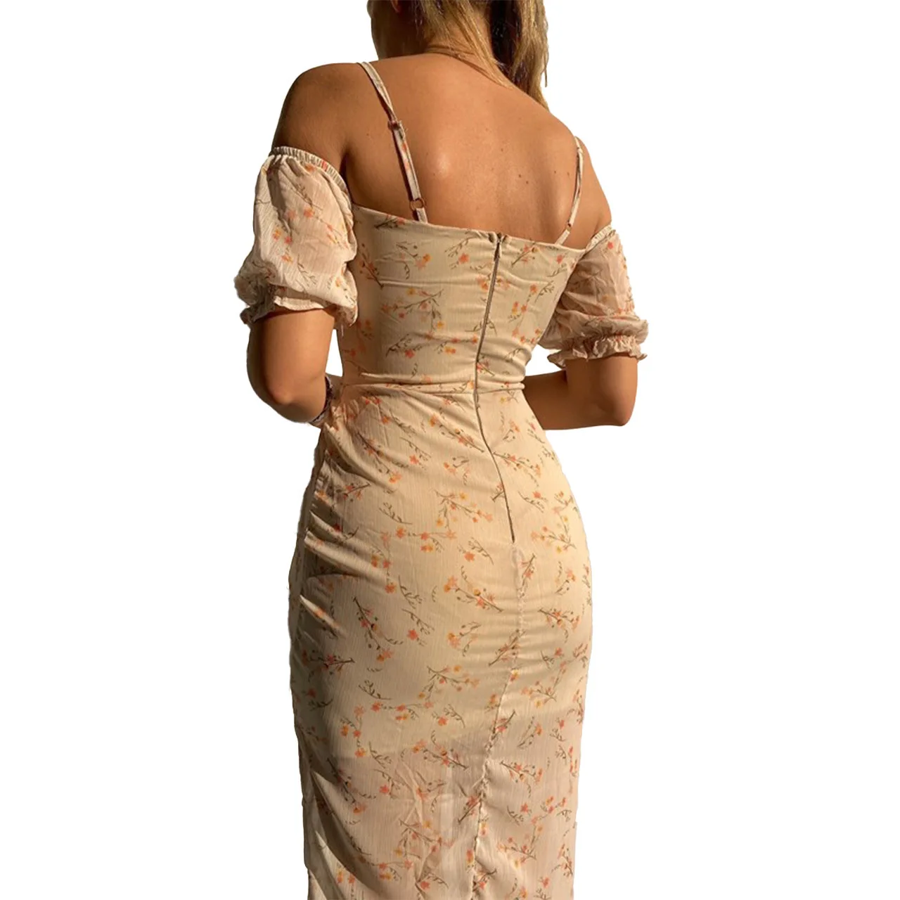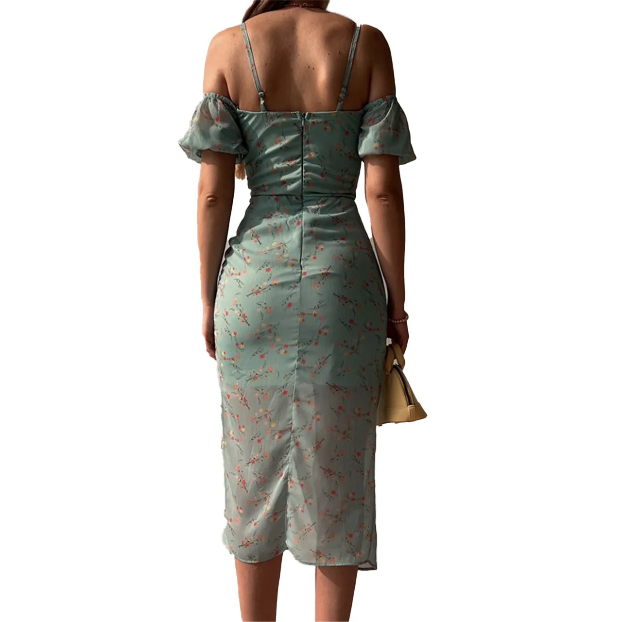 Purpdrank Summer Fashion New Women's Elegant Printed Temperament Dress Clear Thin Wrinkle Small Floral Irregular Long Dress