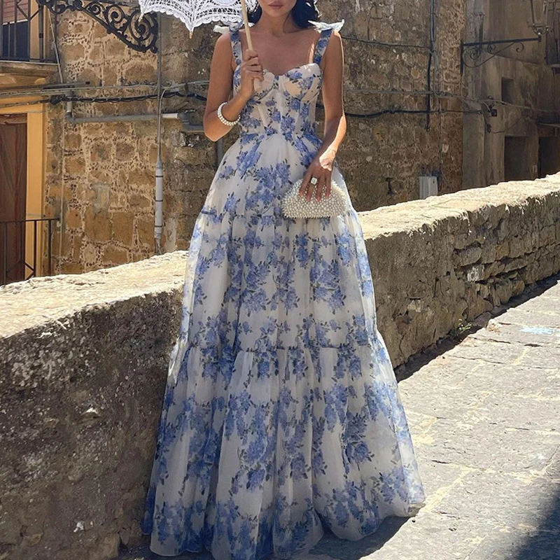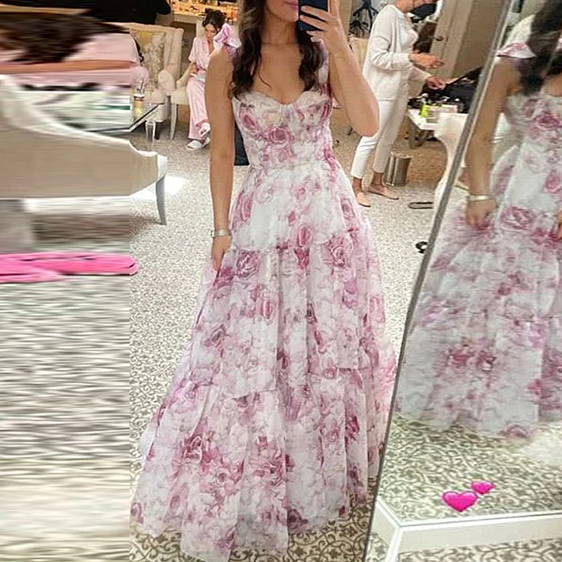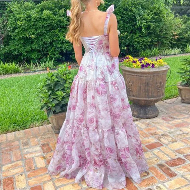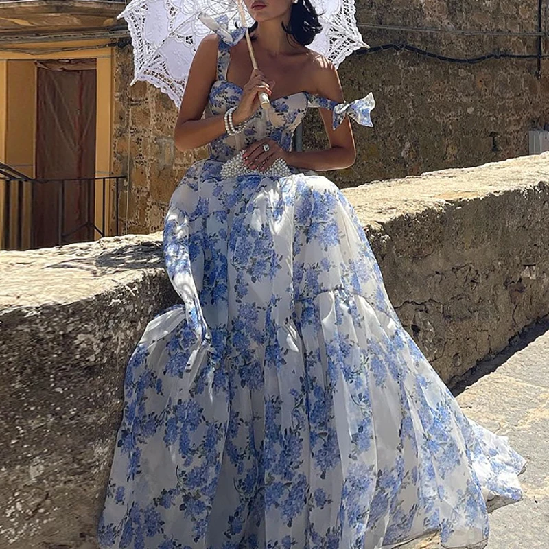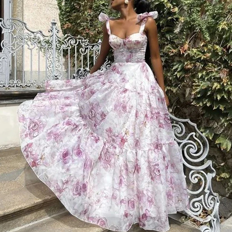 Purpdrank Summer Floral Print Pleats Beach Dress Fashion Off Shoulder Lace Up Mesh Long Dress Bow Suspender High Waist Women Evening Dress