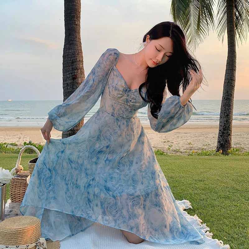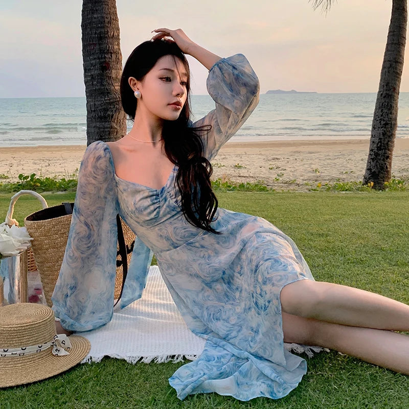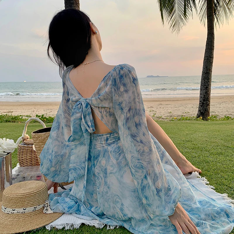 Purpdrank Summer French Style Puff Sleeve V-Neck Backless Tie-Dye Printed Long Sleeve Puff Ball Holiday Dress for Women