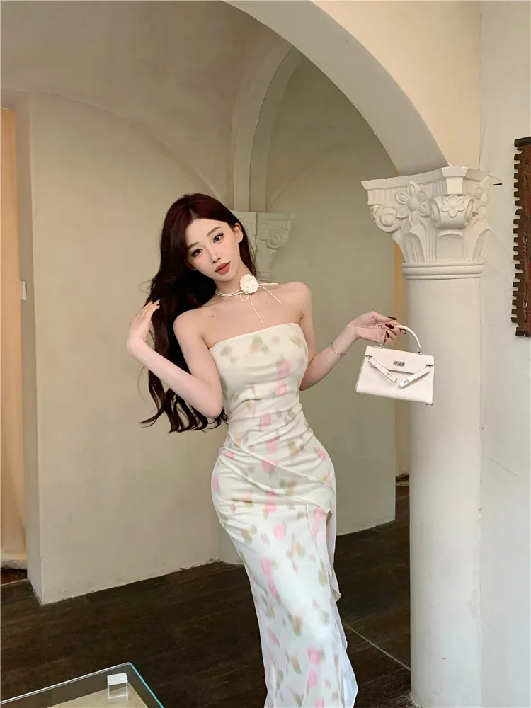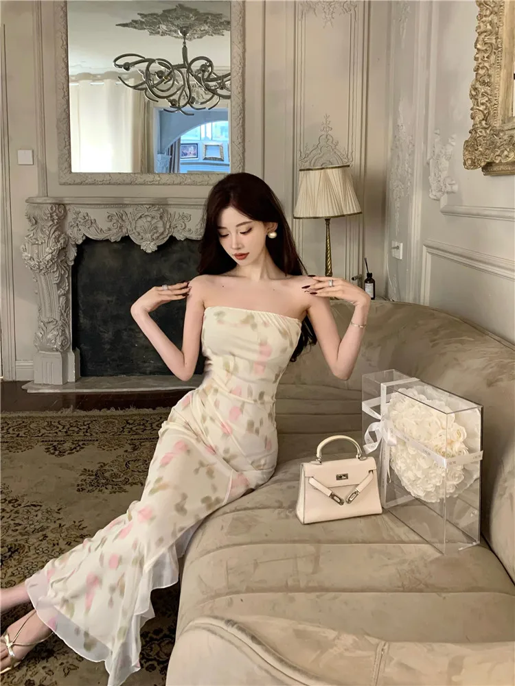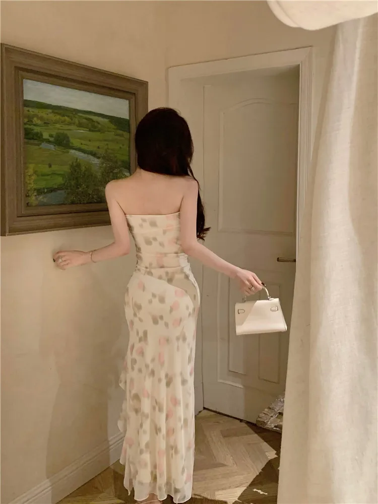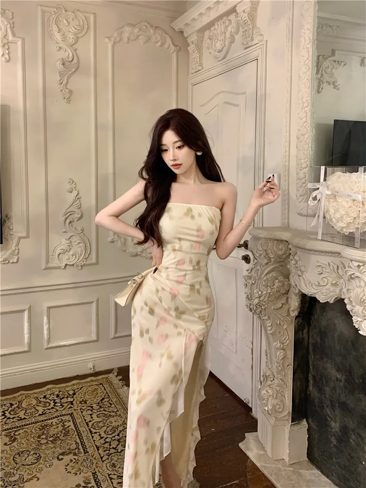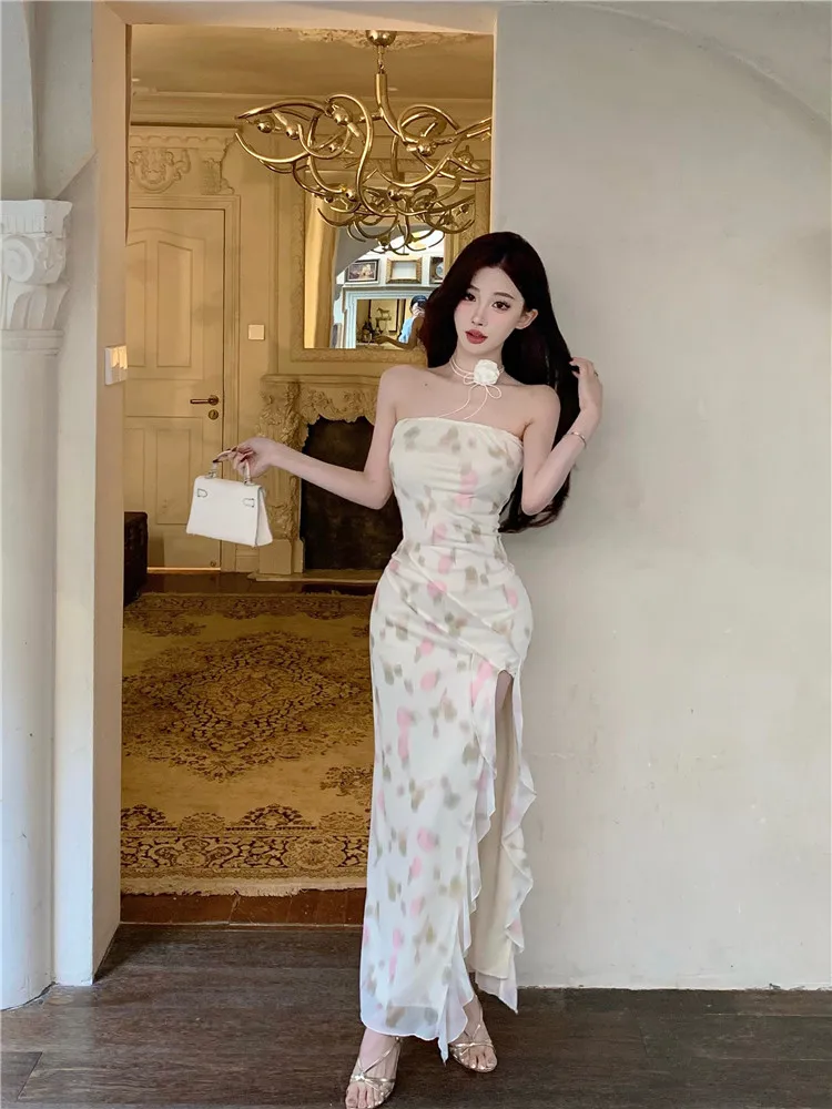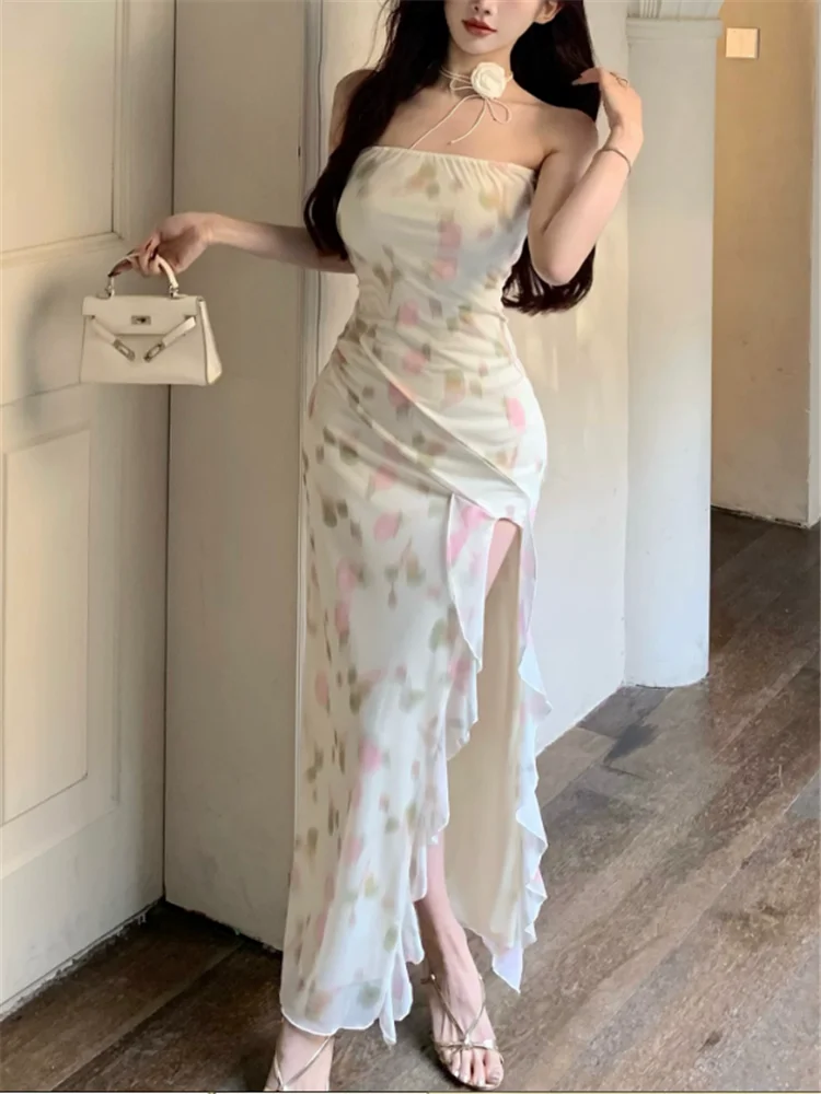 Purpdrank Summer Holiday Women Floral Print Ruffles High Split Long Dress Sexy Strapless Slash Neck Irregular Seaside Beach Dress Vestidos