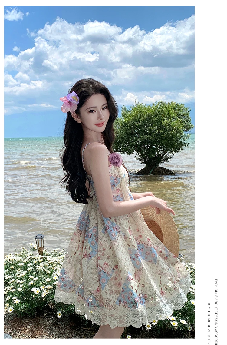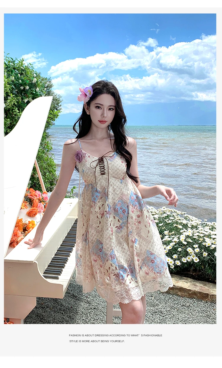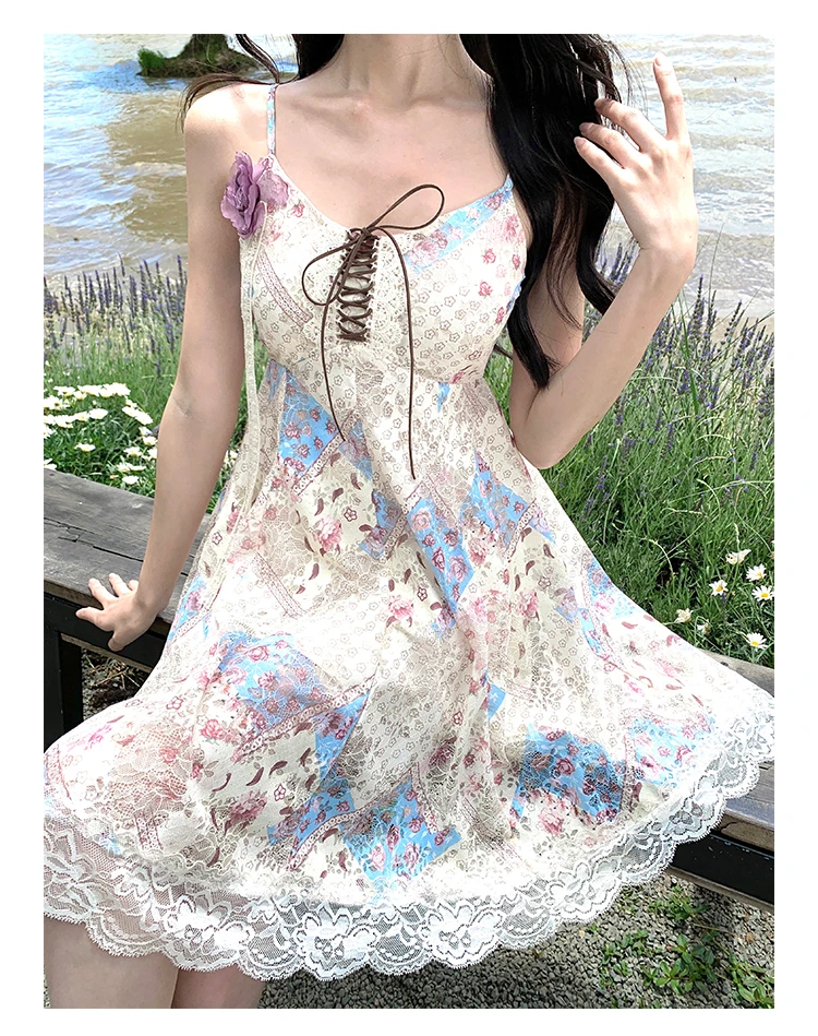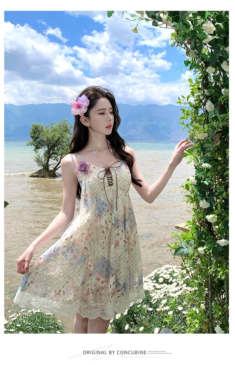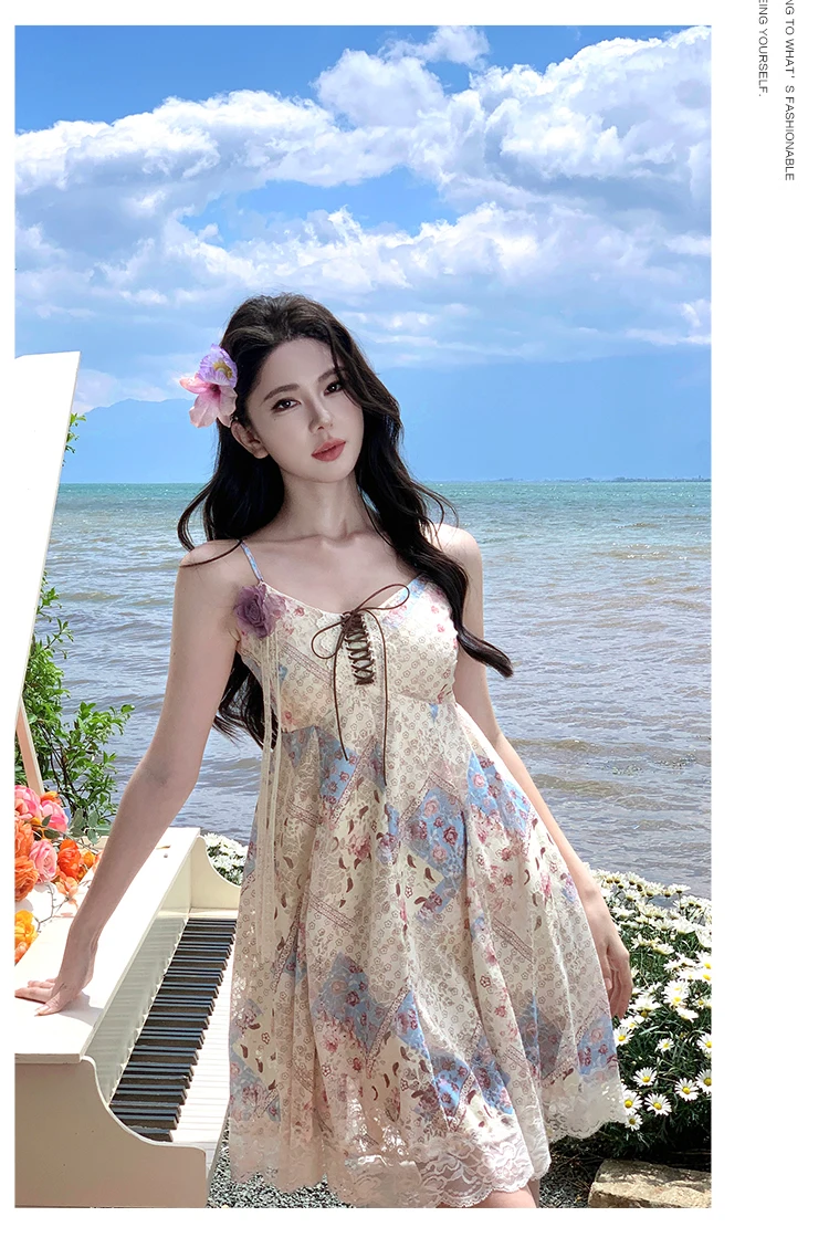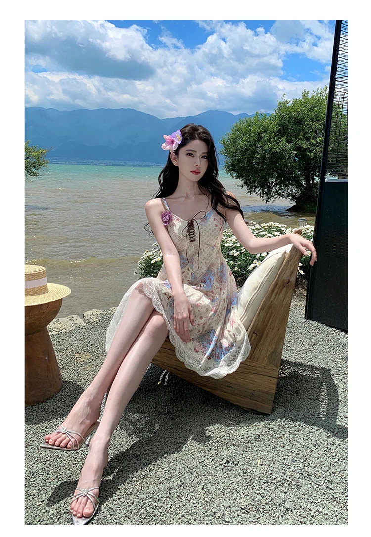 Purpdrank Summer New Niche Retro Floral Lace Rose Tie Strap Dress for Women