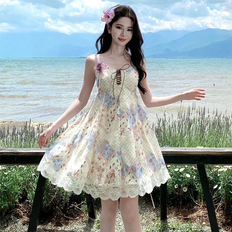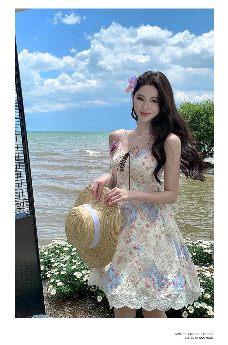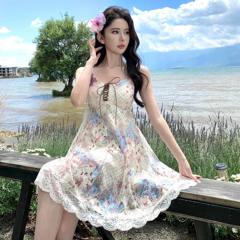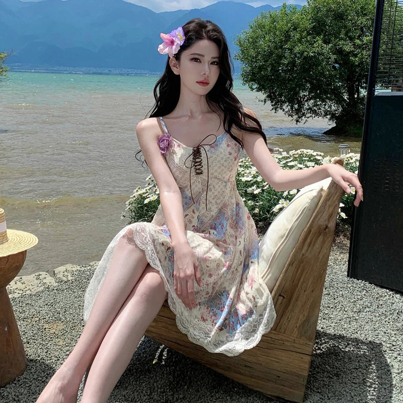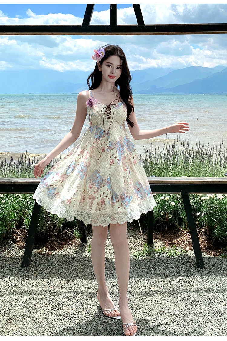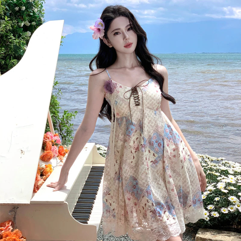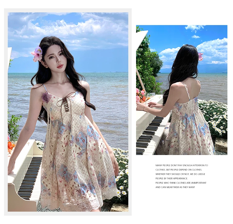 Purpdrank Summer New Niche Retro Floral Lace Rose Tie Strap Dress for Women