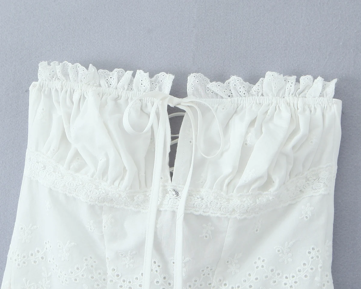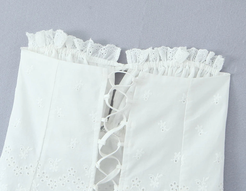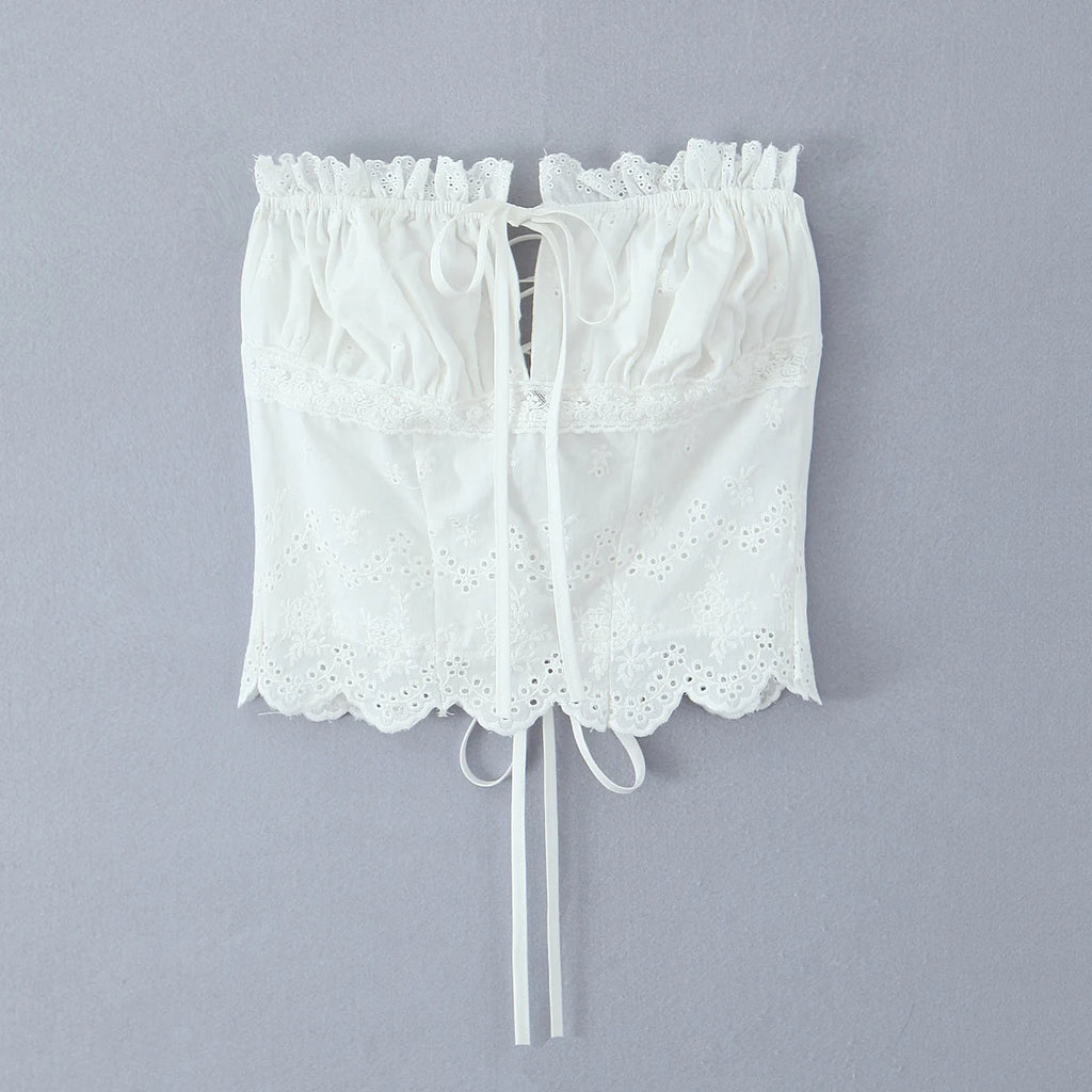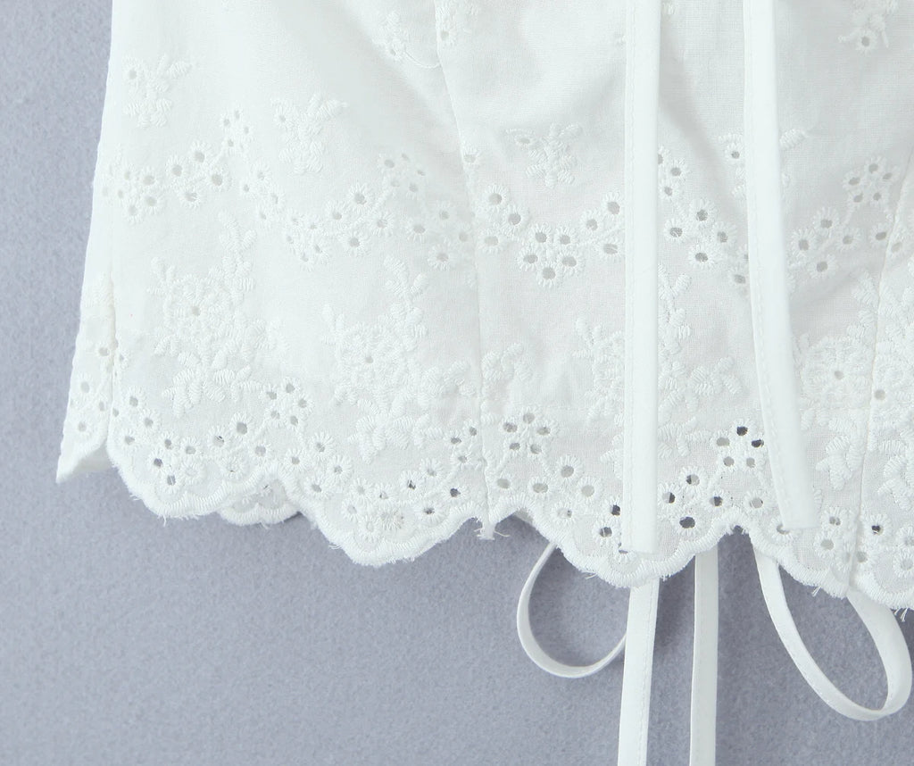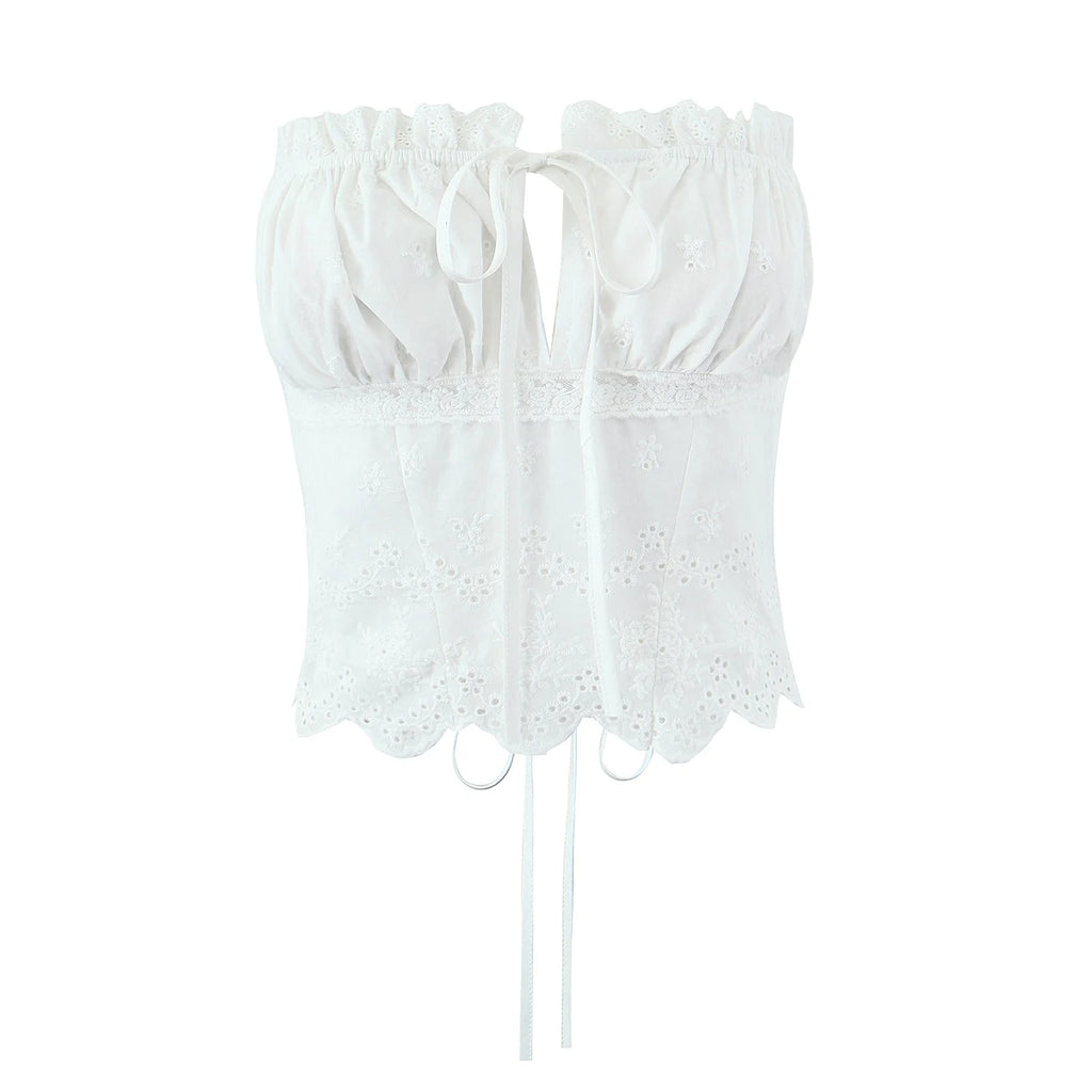 Purpdrank Summer White Embroidery Hollow Out Hole Wood ears Bow Ruched Chest Corset Camisole Women Cross Lacing up Bow Back Tank Top