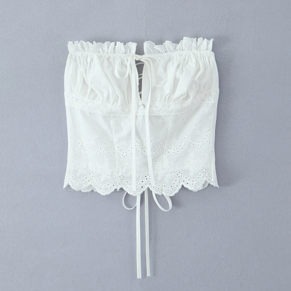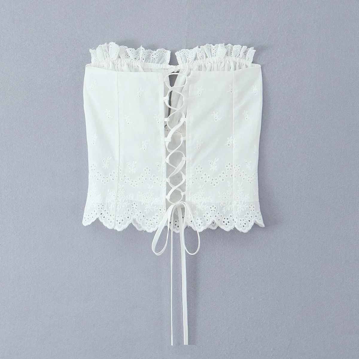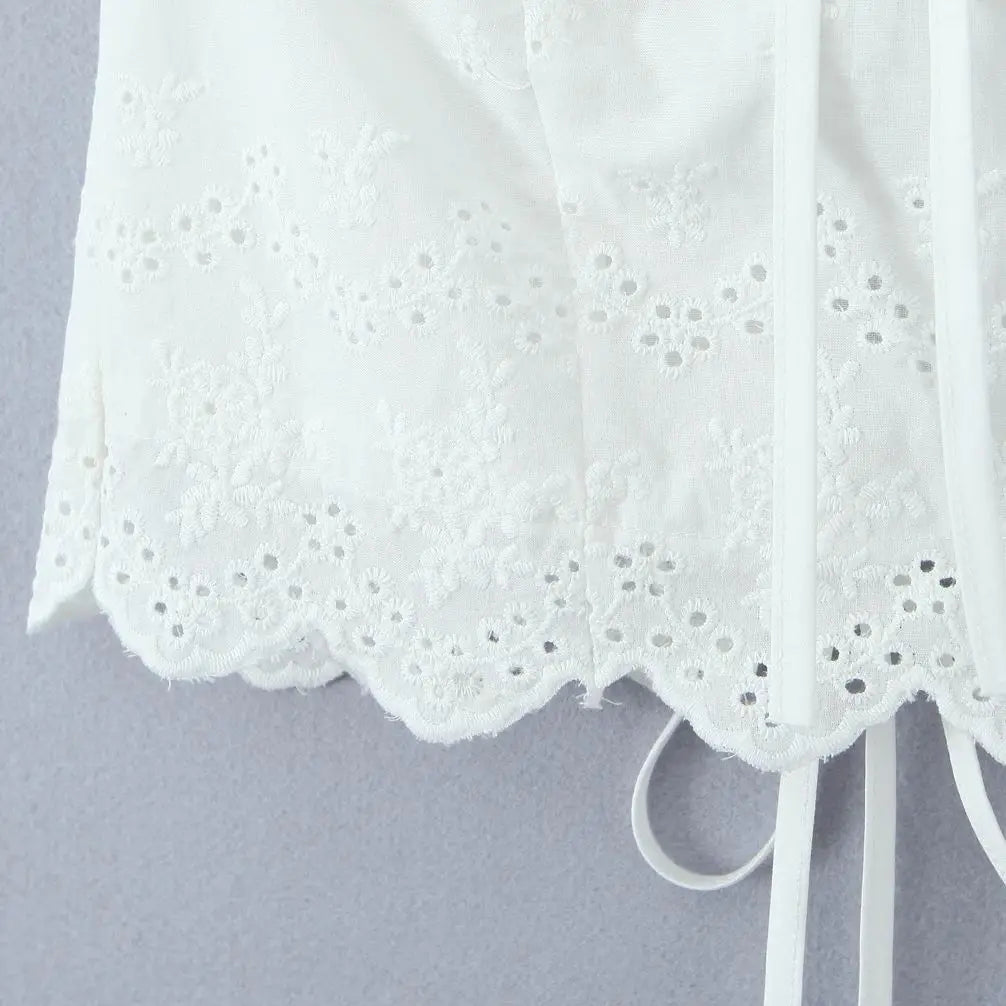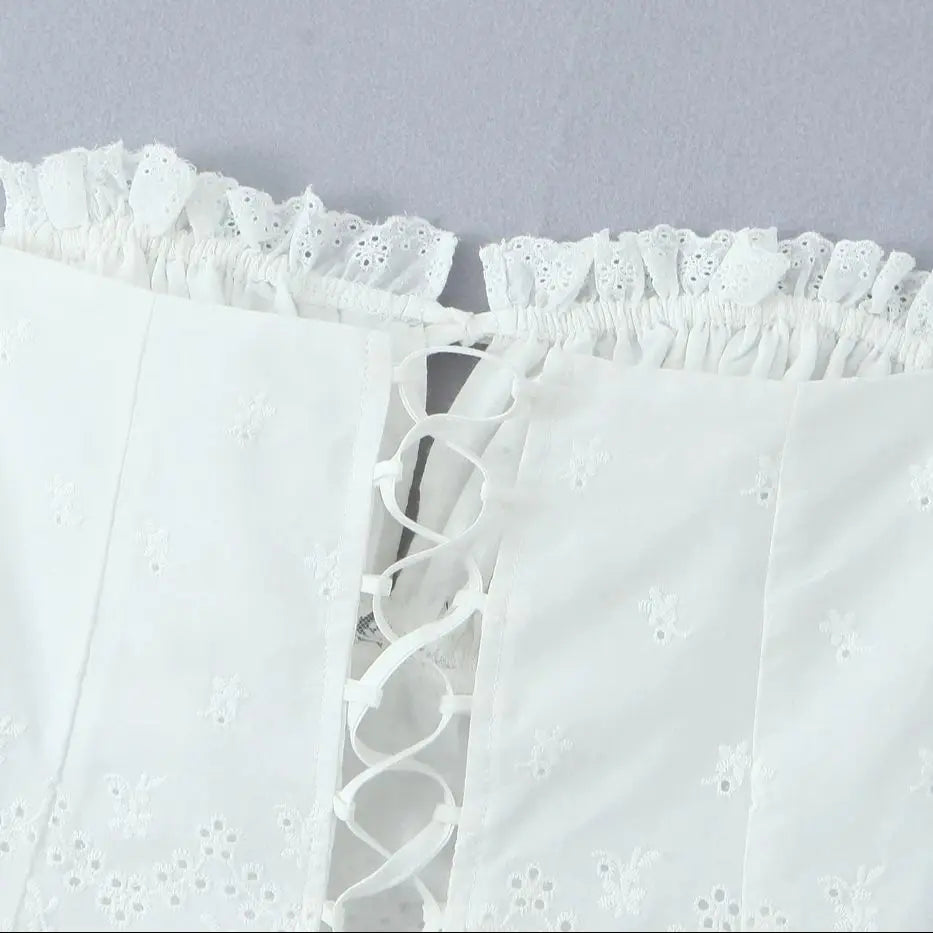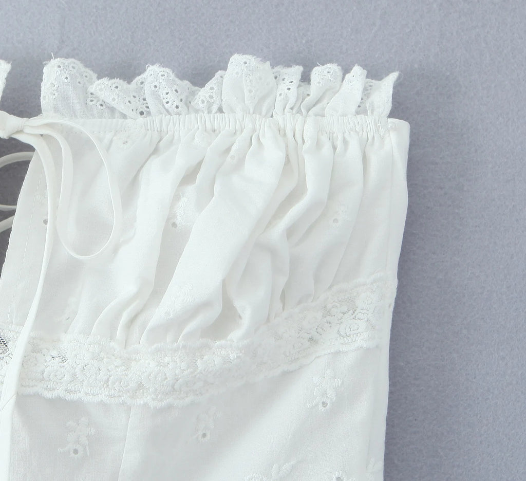 Purpdrank Summer White Embroidery Hollow Out Hole Wood ears Bow Ruched Chest Corset Camisole Women Cross Lacing up Bow Back Tank Top