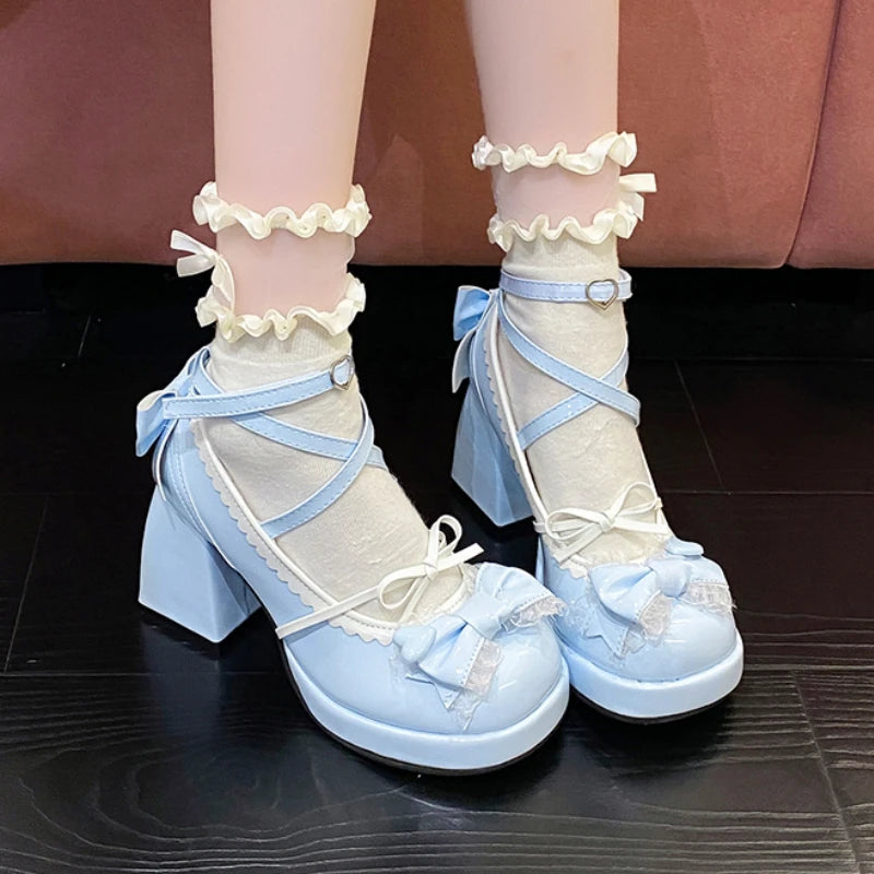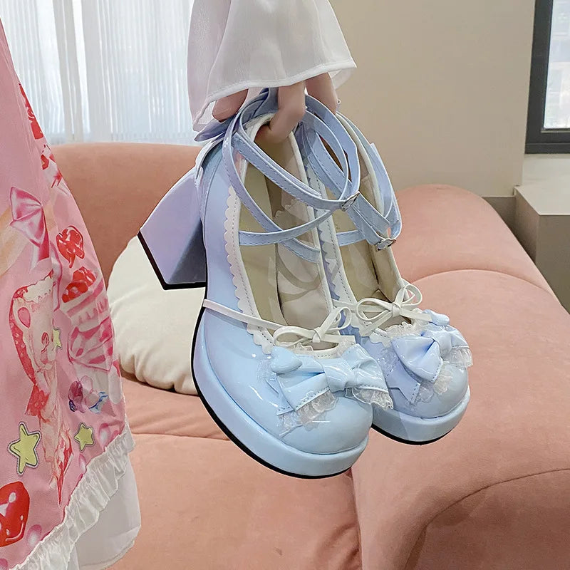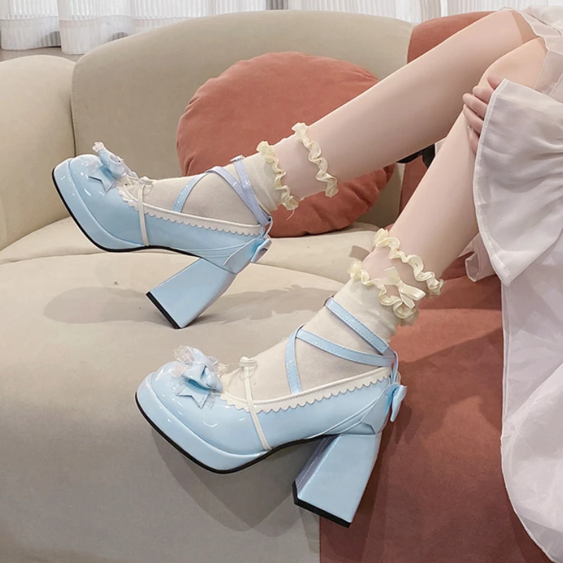 Purpdrank Sweet Cute High Heel Design Single Shoe Thick Bottom Waterproof Platform Bow Decoration Lolita Casual Women's Vulcanized Shoes