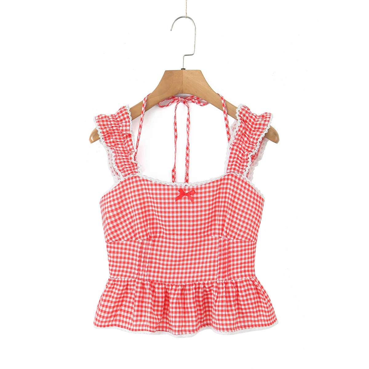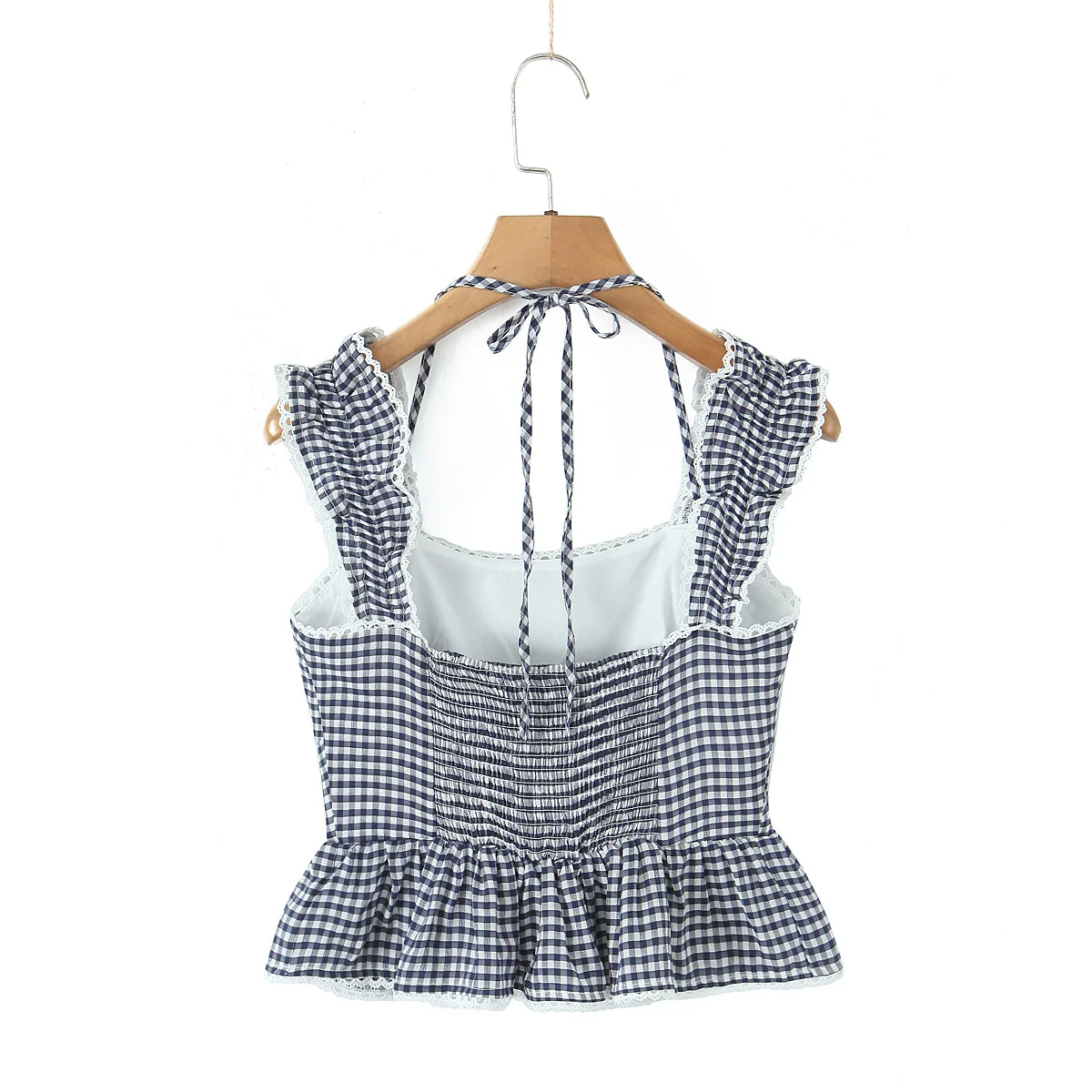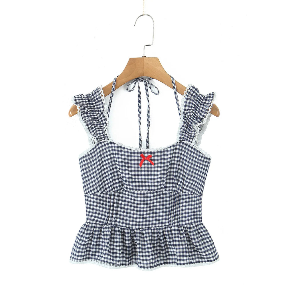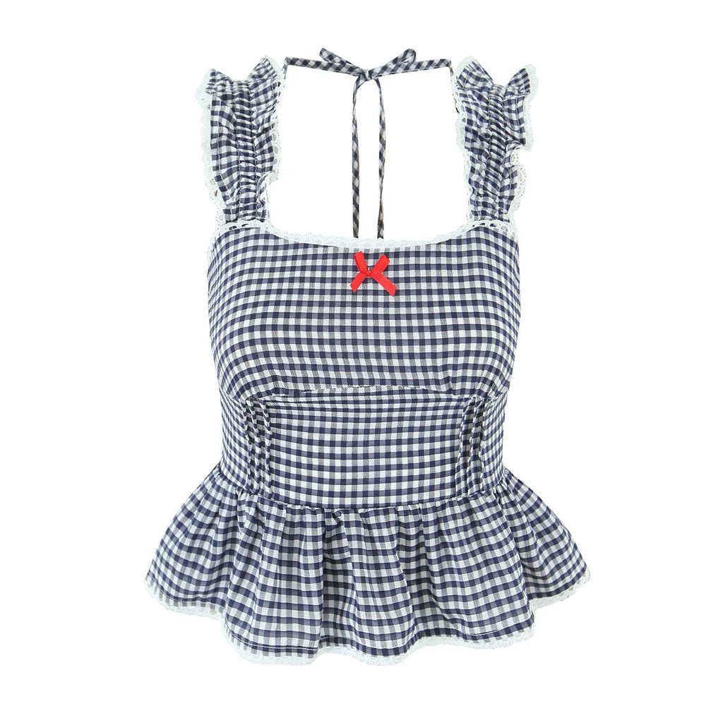 Purpdrank Tie Bow Halter Plaid Spliced Lace Wood ears Strap Sexy Corset Women Tank Top Slim Waist Elastic Back Crop Top