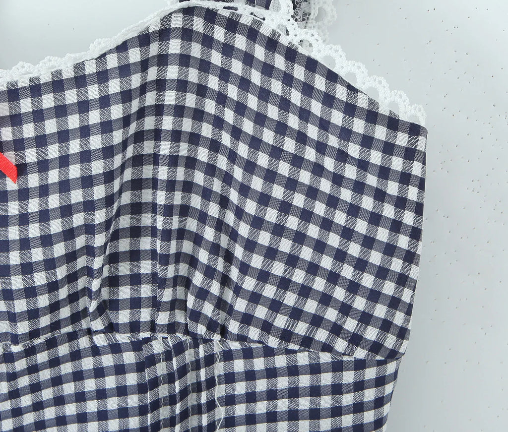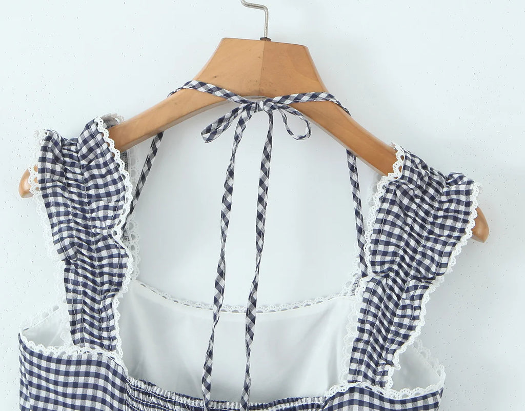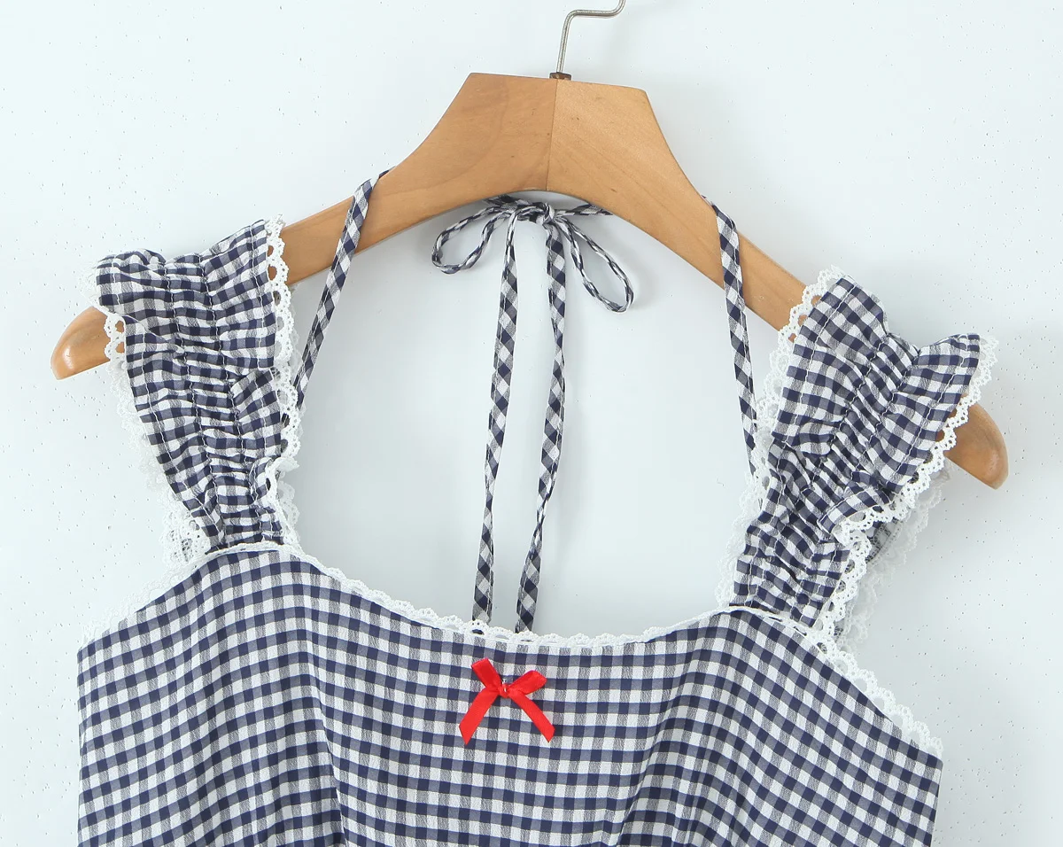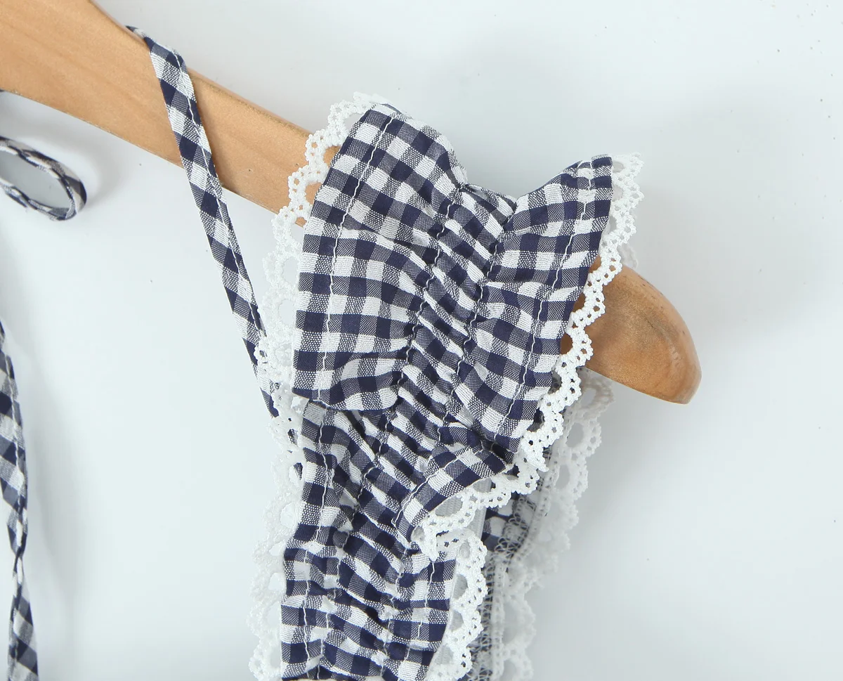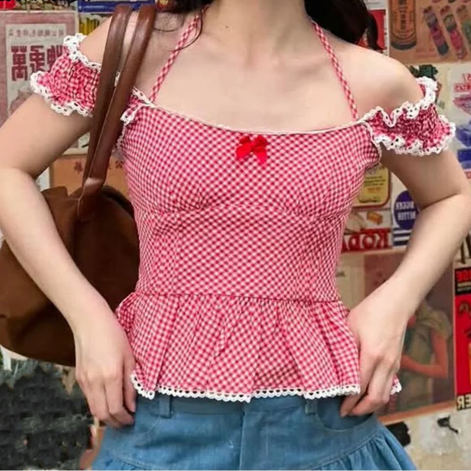 Purpdrank Tie Bow Halter Plaid Spliced Lace Wood ears Strap Sexy Corset Women Tank Top Slim Waist Elastic Back Crop Top