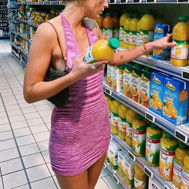 Purpdrank V Neck Knitted Dress Bodycon Blue Women Halter Neck Backless Bandage Summer Beach Sleeveless Sexy Mini Dresses