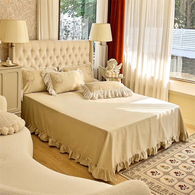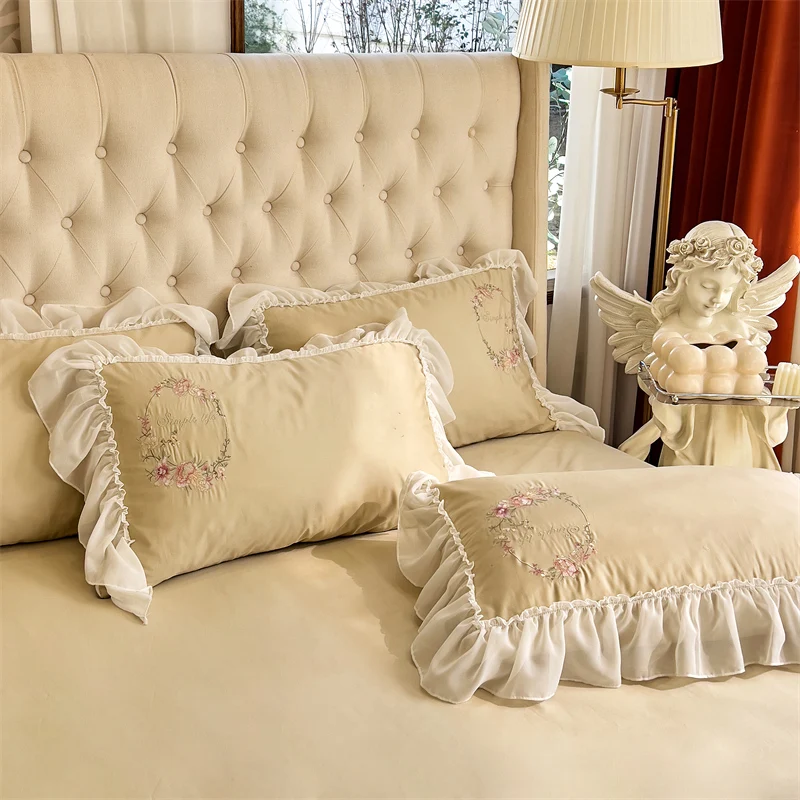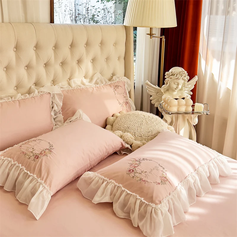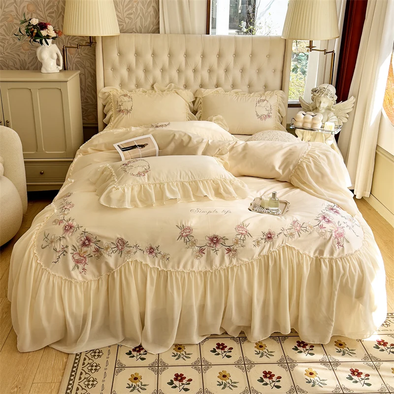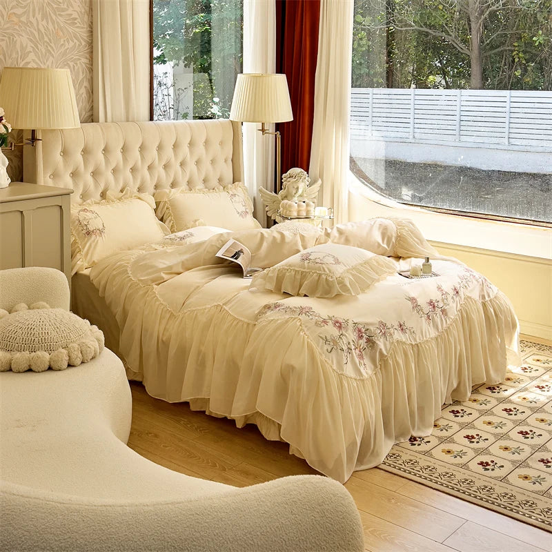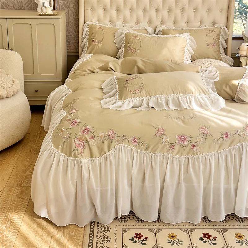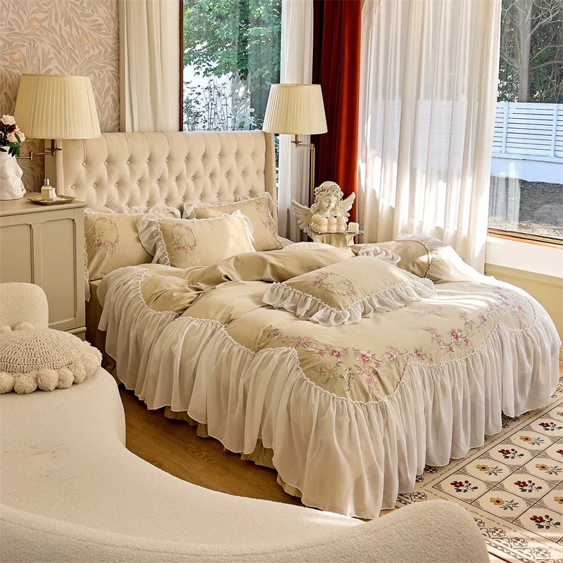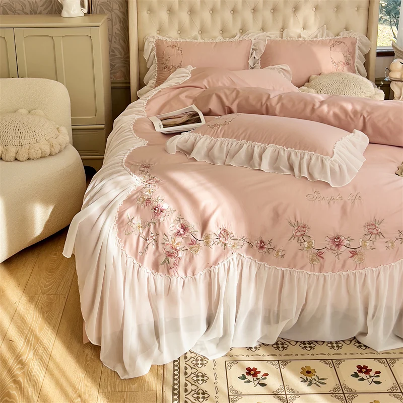 Purpdrank Vintage French Beige Pink Lace Ruffles Flowers Embroidery Bedding Set Egyptian Cotton Quilt/Duvet Cover Set Bed Sheet Pillowcase