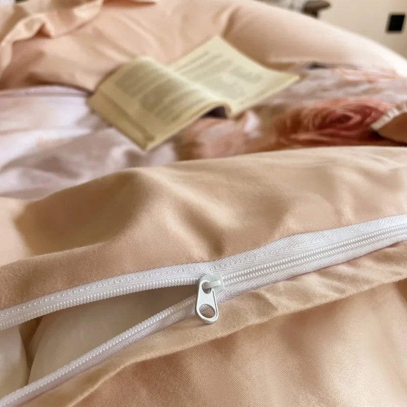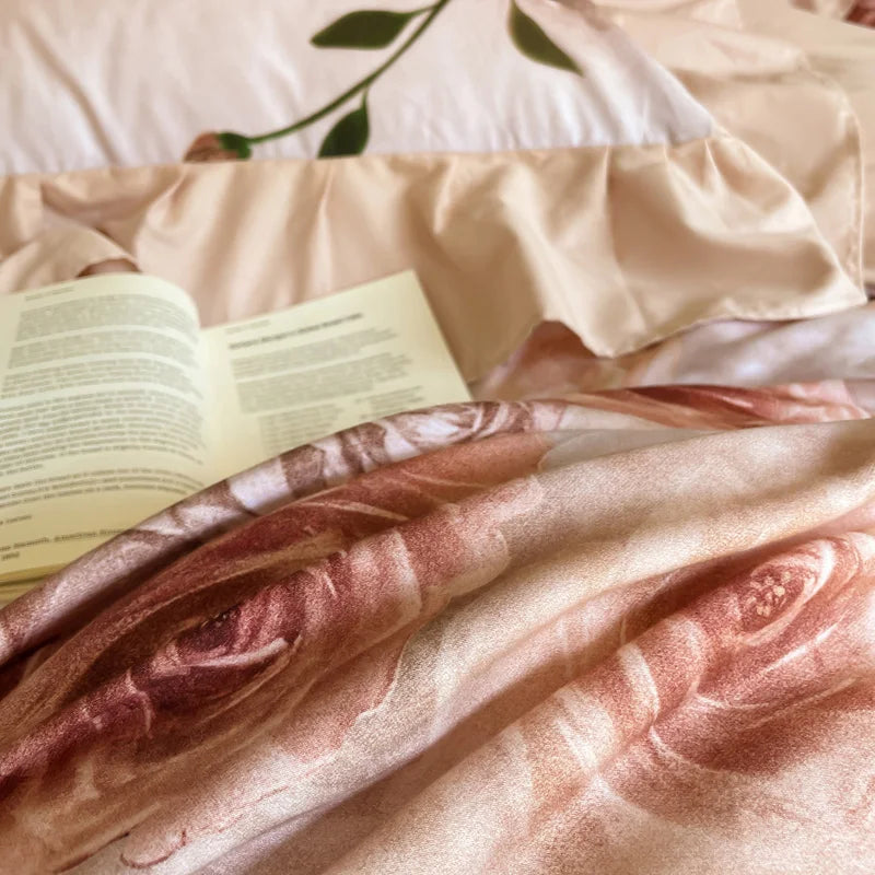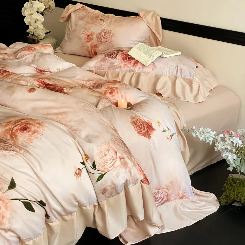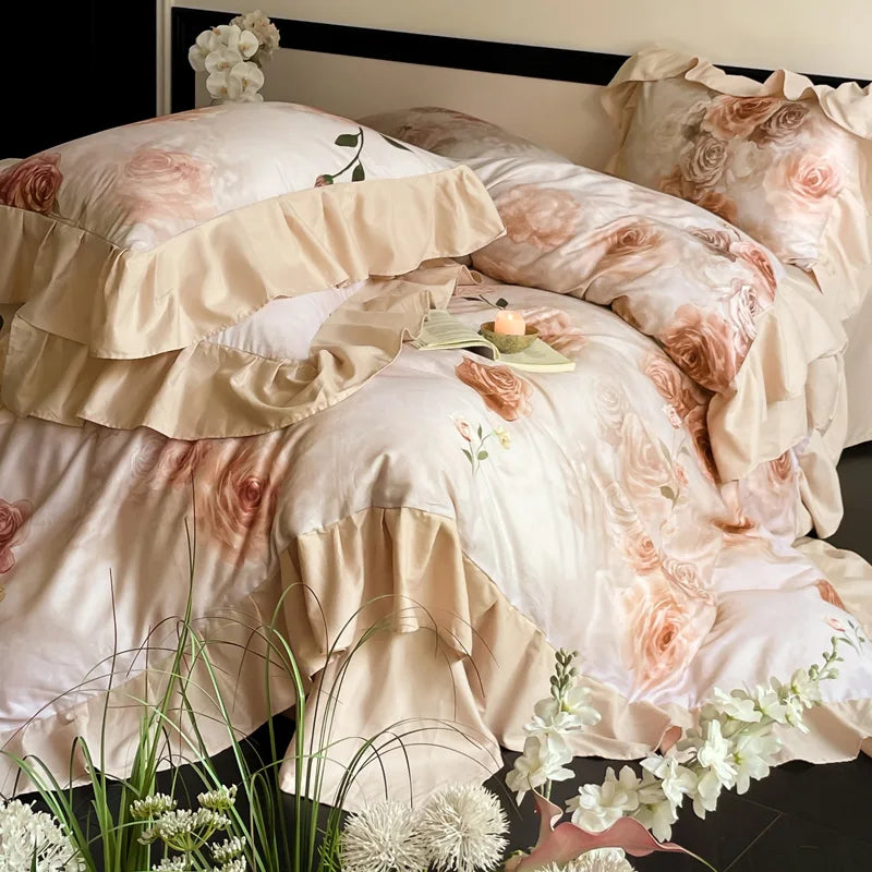 Purpdrank Vintage French Rose Flowers Prints Ruffles Bedding Set 100% Cotton Brushed Fabric Duvet Cover Set Bed Sheet Pillowcases 4Pcs
