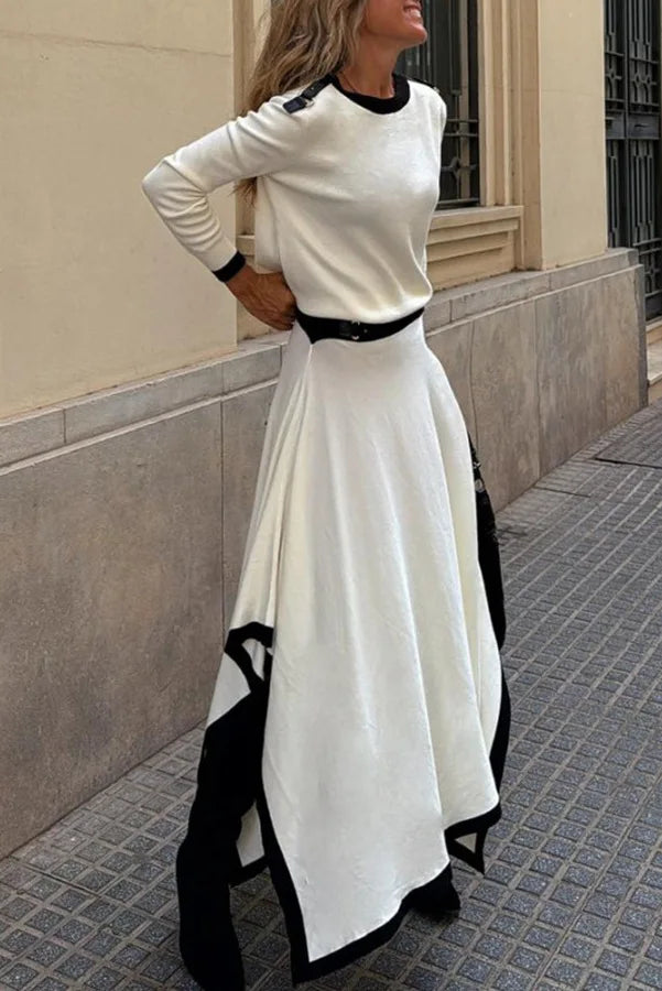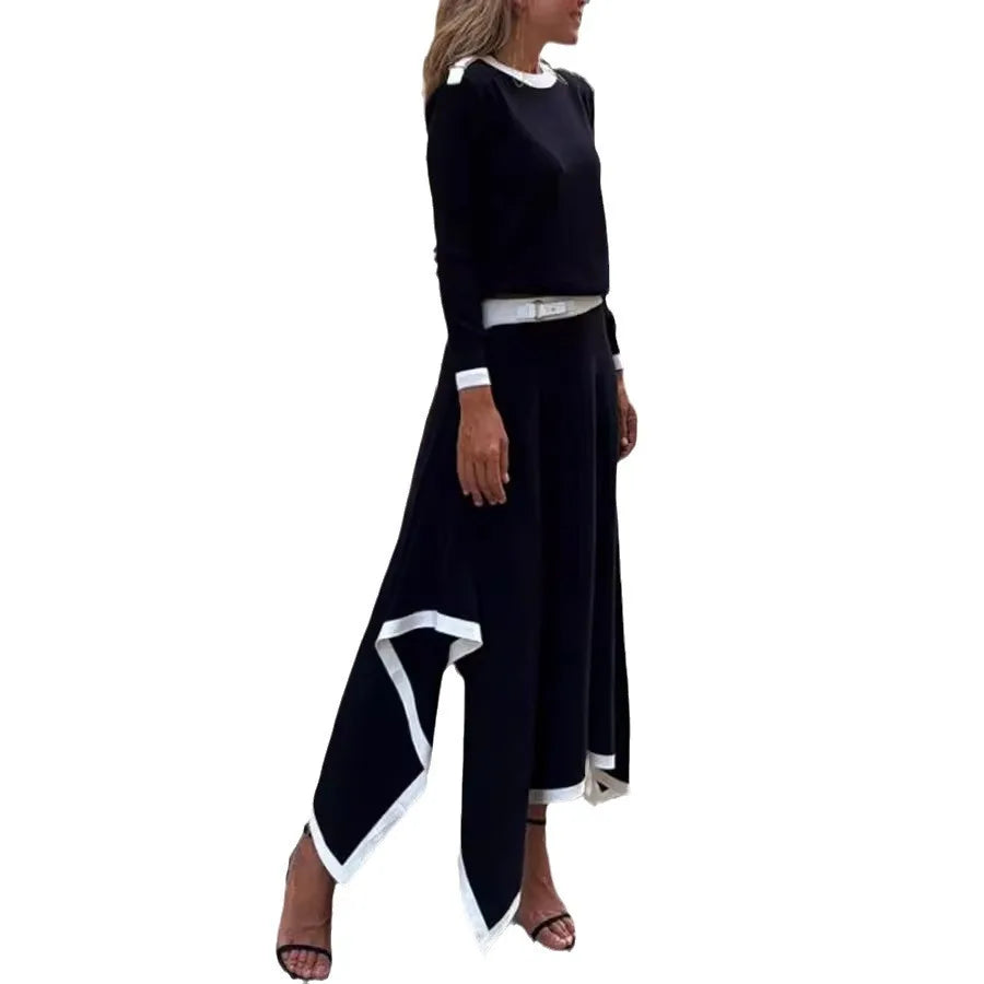 Purpdrank Women Casual Long Sleeve 2Pc Set Fashion Color Blocked Loose 2Pc Outfits Elegant O-neck Pullover Top & lrregular Long Skirt Suit