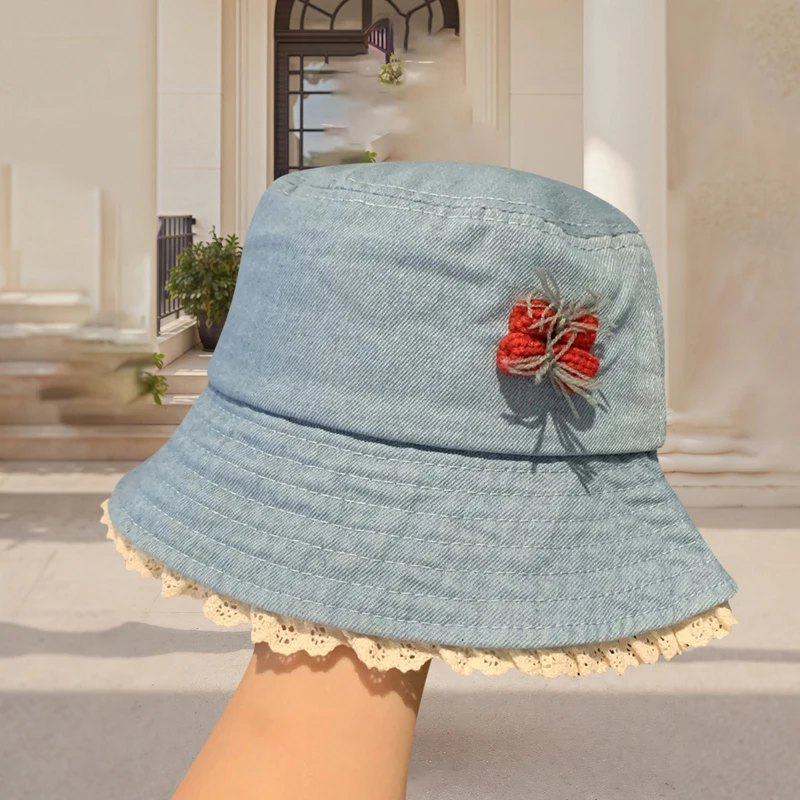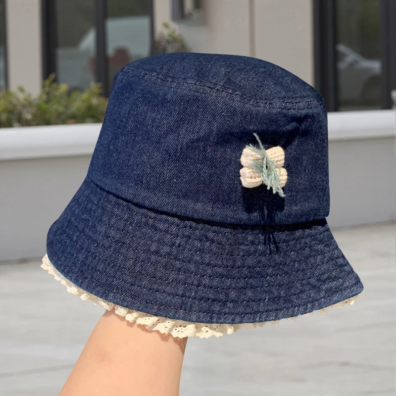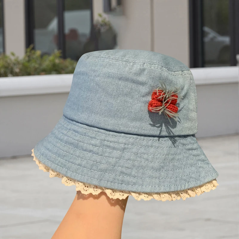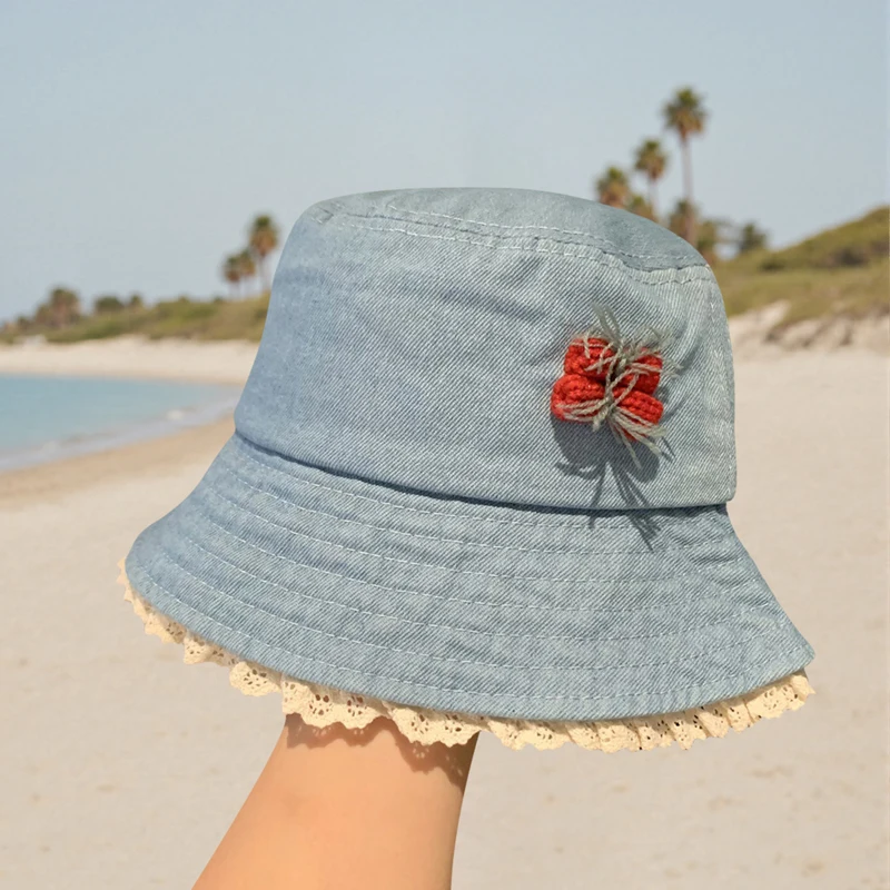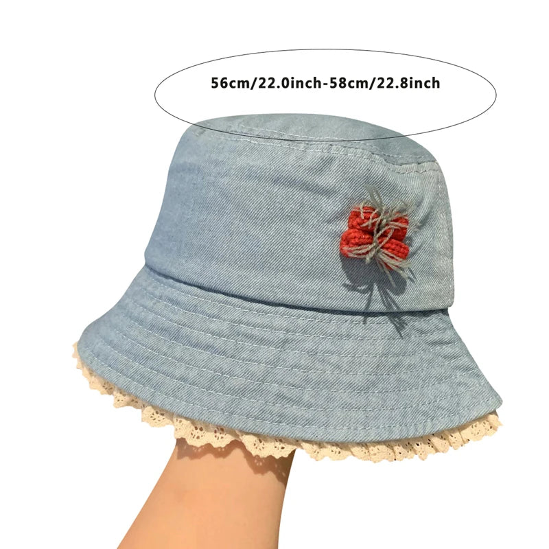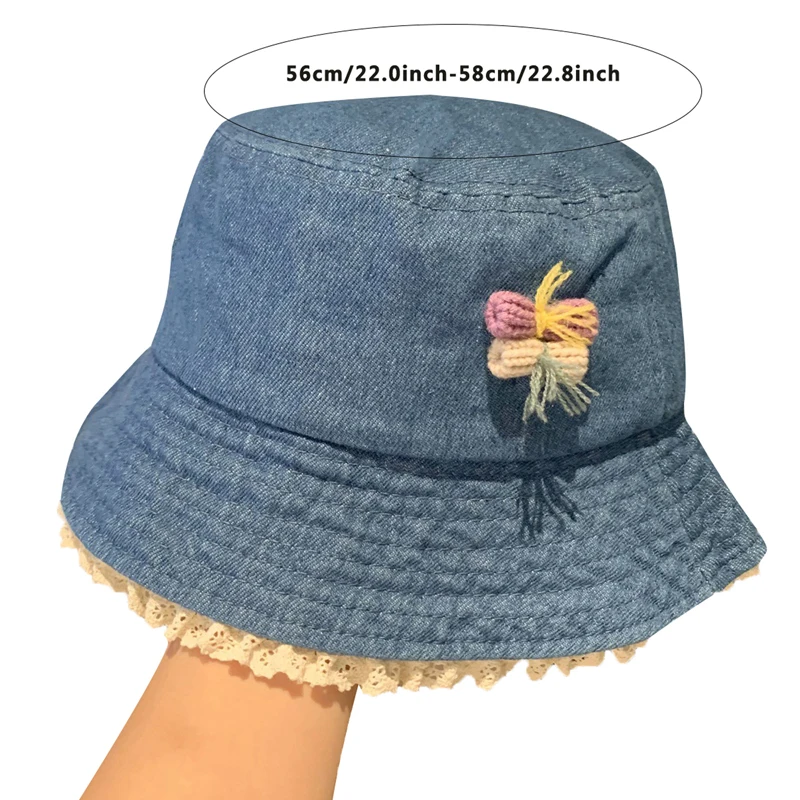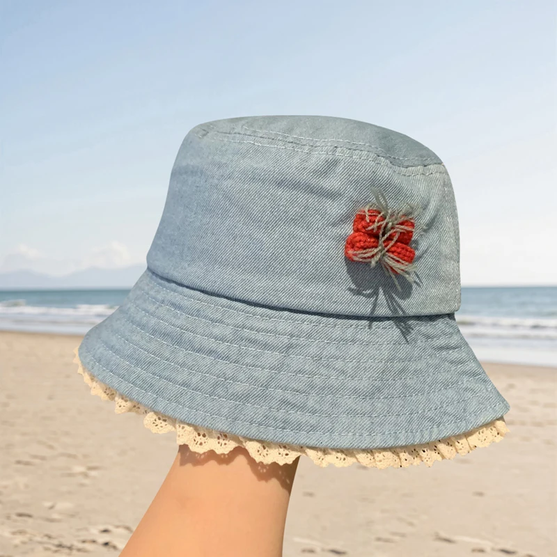 Purpdrank Women Girls Denim Bucket Hats Spring Summer Wide Brim White Lace Trim Sun Protection Cap for Outdoor Beach Fashion Fisherman Hat