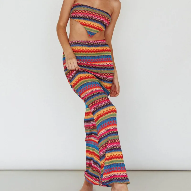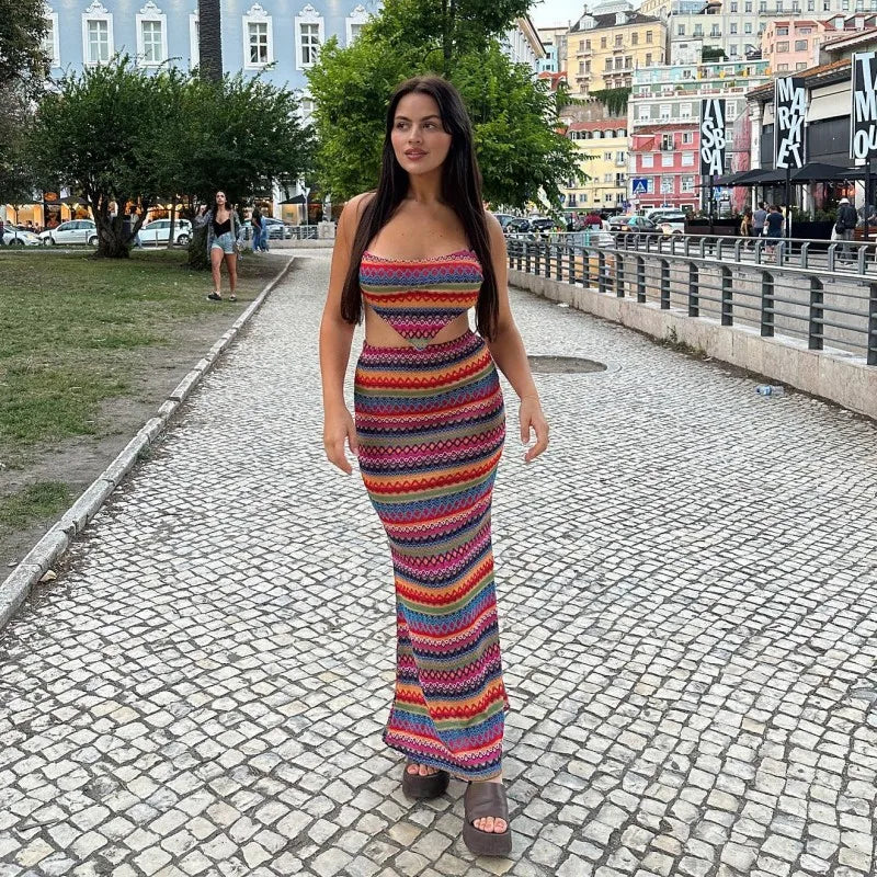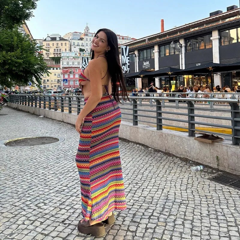 Purpdrank Women Sexy Colorful Stripe Printing 2-Piece Halter Top+New High Waist Slim Skirt Summer New Fashion Street Set Hot