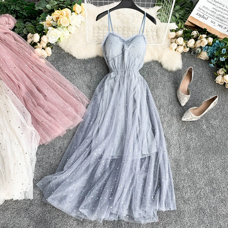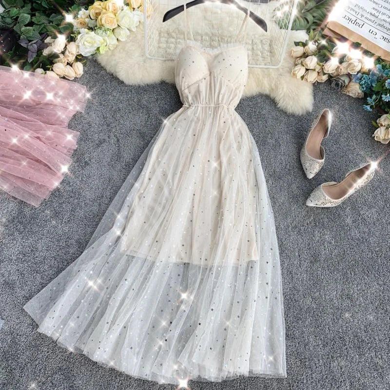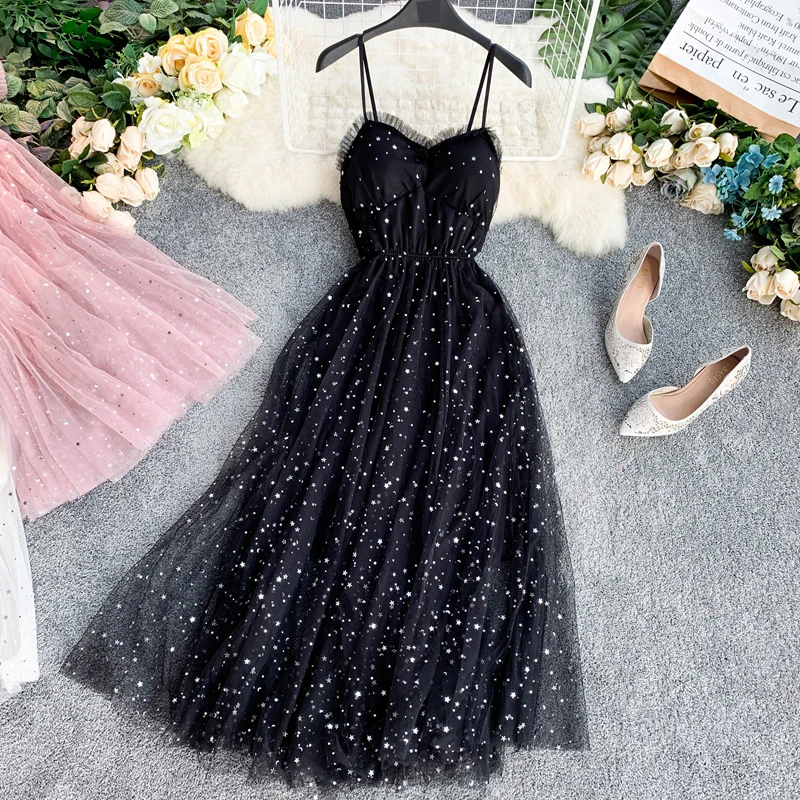 Purpdrank Women Stars Sequined Tulle Mesh Midi Dress Summer Sexy Strapless Fairy Elegant Party Prom Dresses Female Casual Vestidos