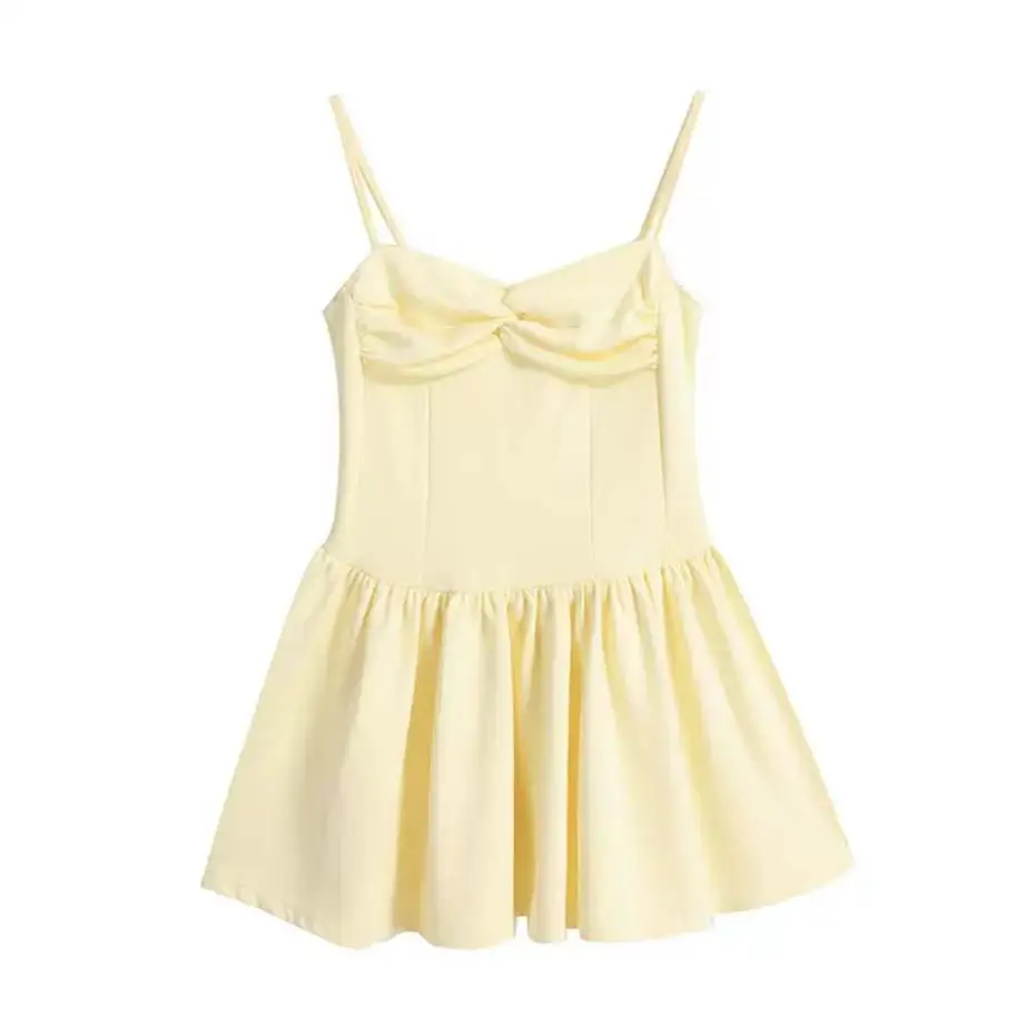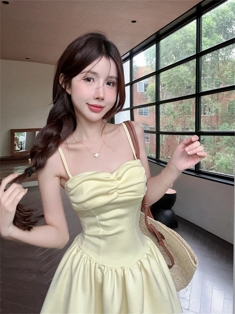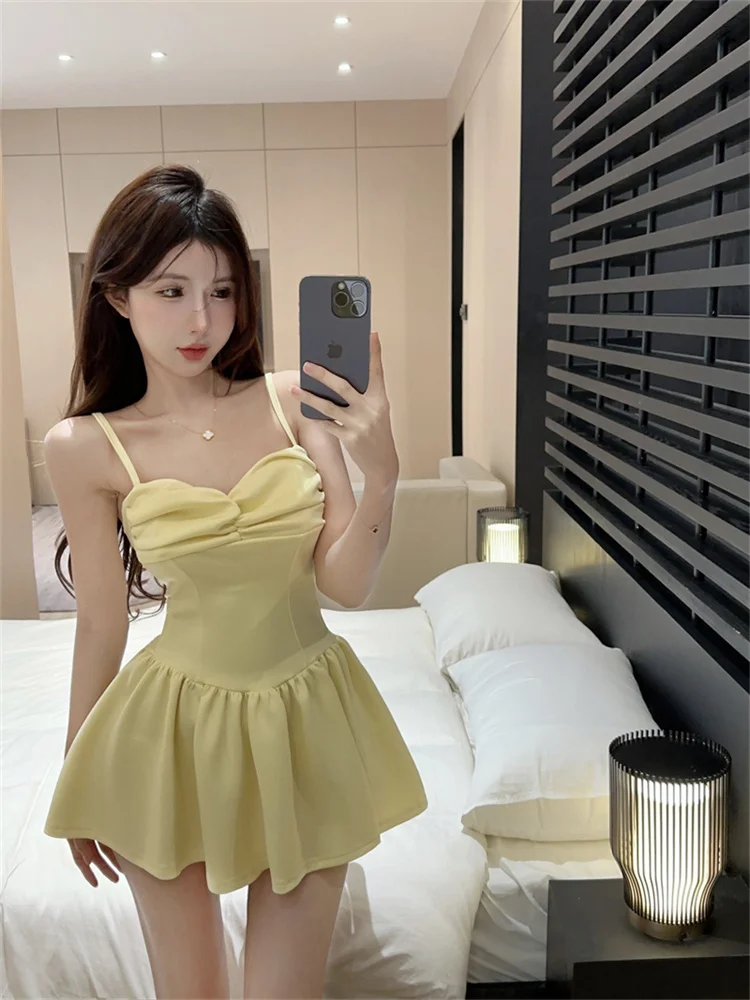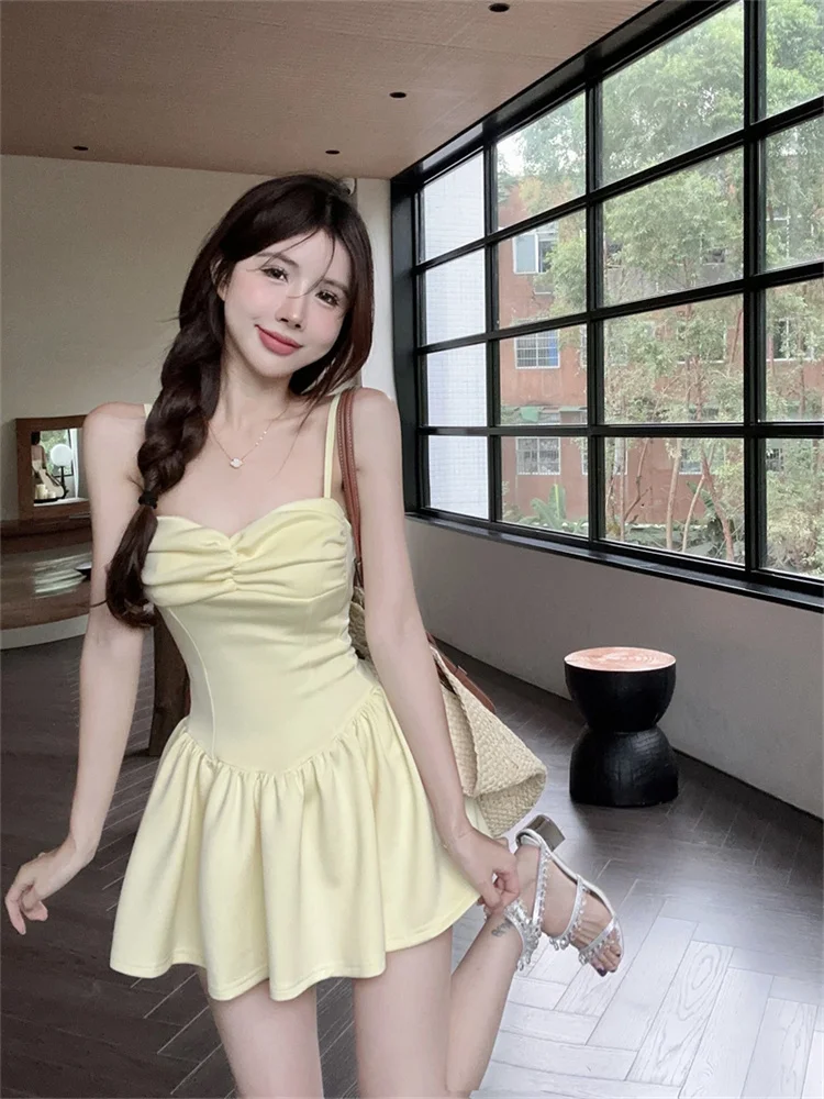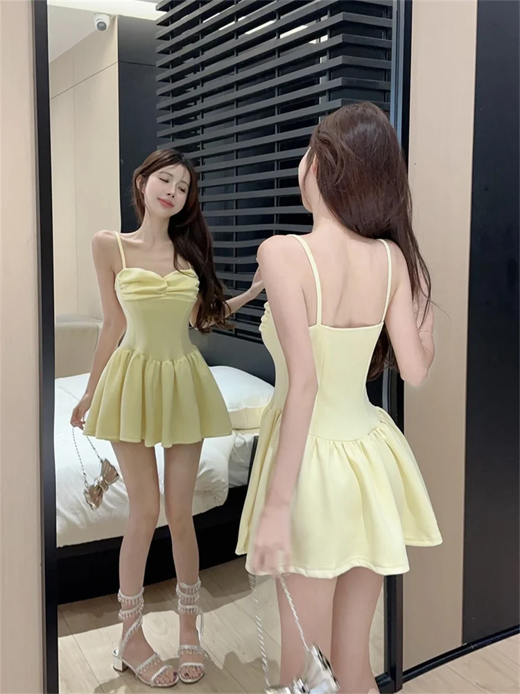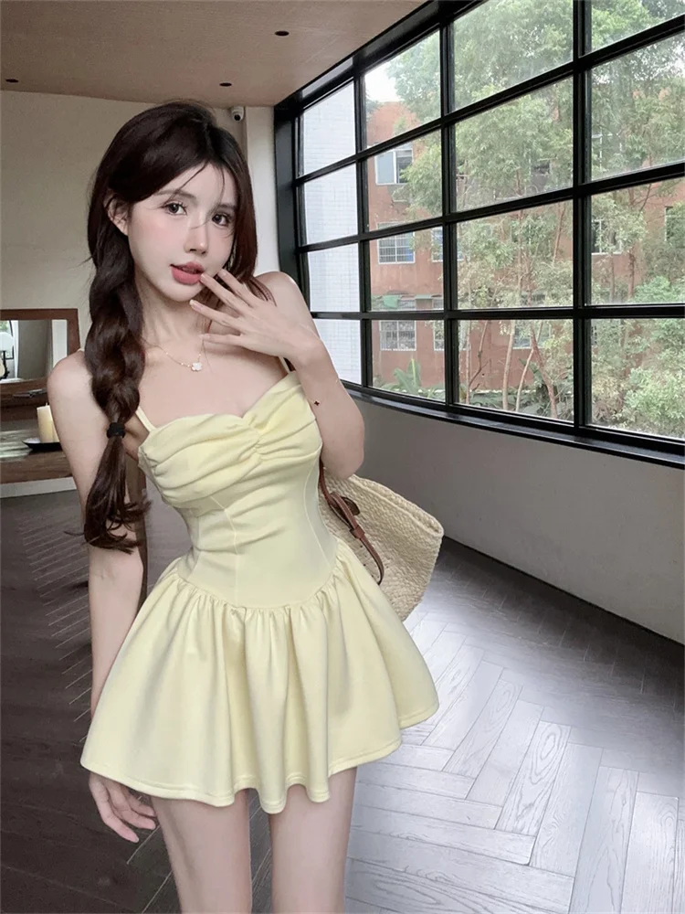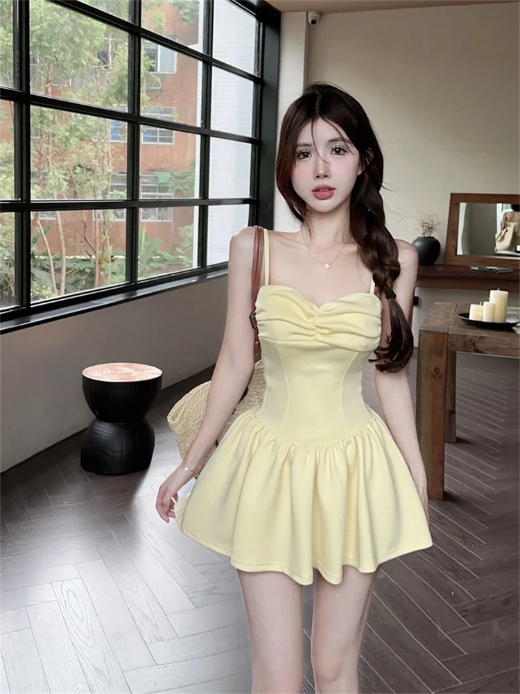 Purpdrank Women Sweet Suspender Dress Summer Spicy Girl Off Shoulder Pleated Sexy Sleeveless Suspender Dress Yellow Mini Sling Bud Dresses