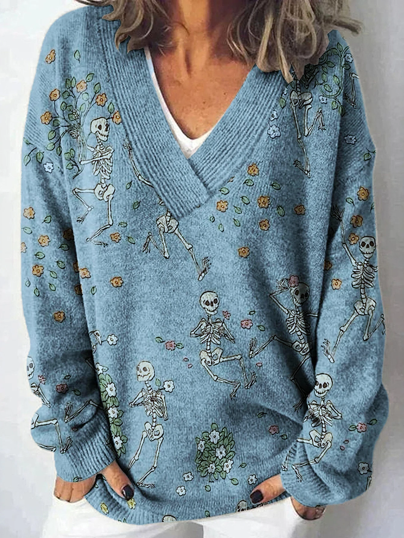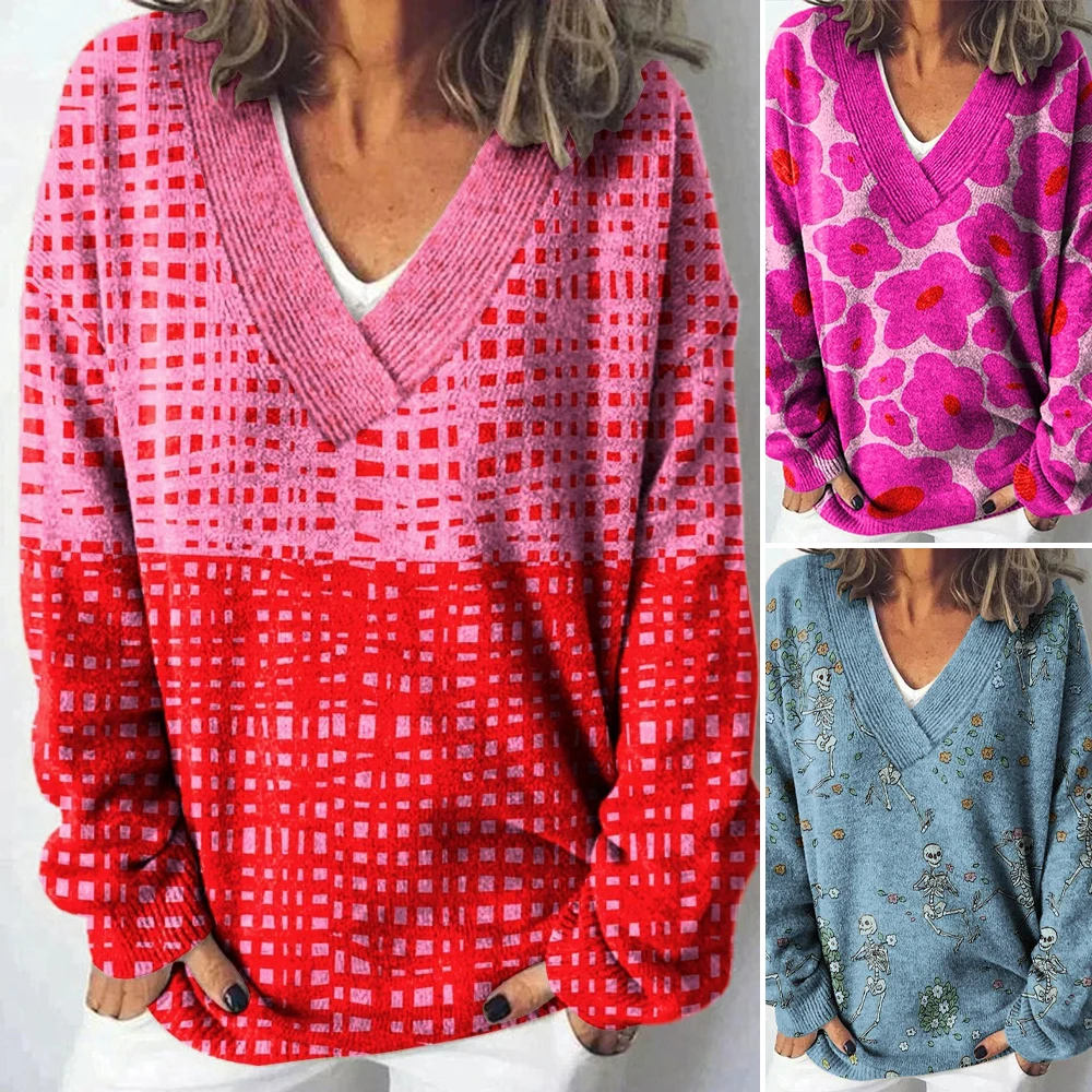 Purpdrank Women's Autumn Winter 2025 T-Shirts Fashion Casual Skull Floral Print Long Sleeve V-Neck Basic T-Shirts