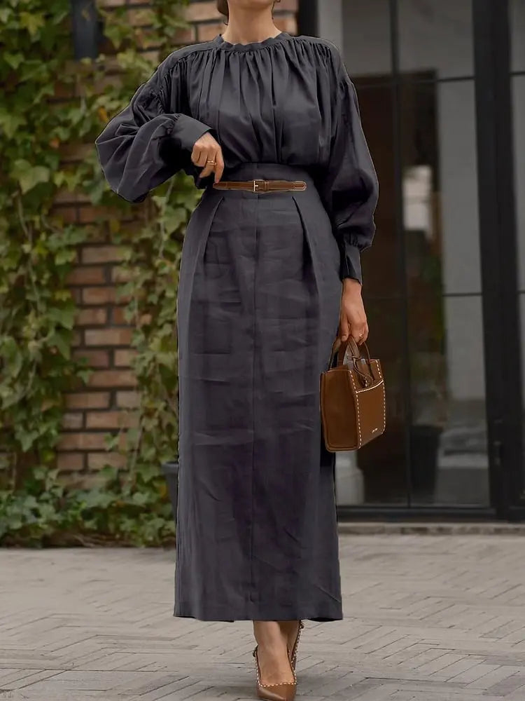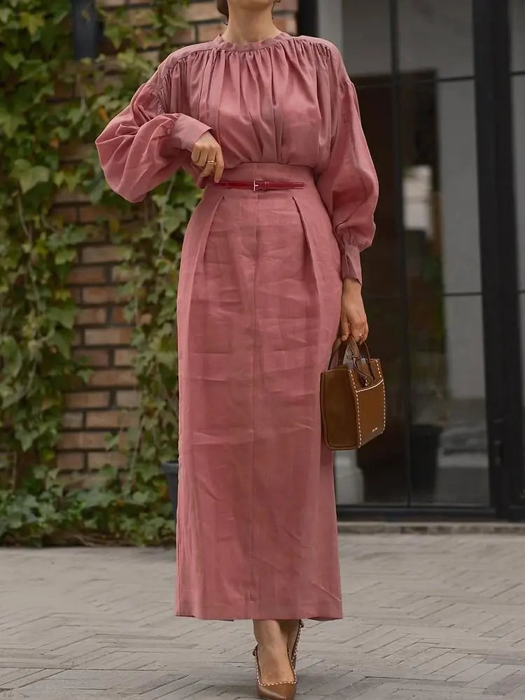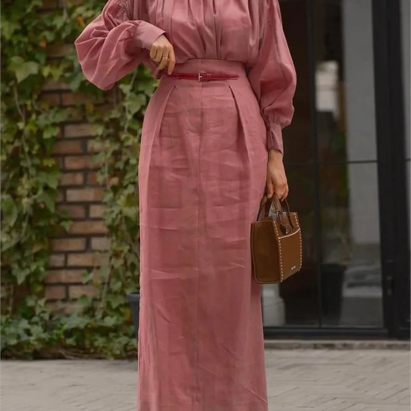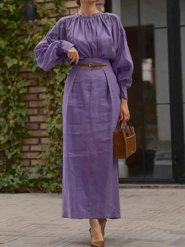 Purpdrank Women's Fashion Solid Skirt Set Elegant O-neck Full Sleeve Pleated Top Loose Maxi Skirt With Belted Lady 2025 Summer Chic Outfit