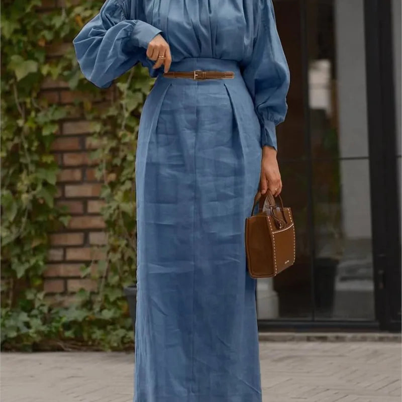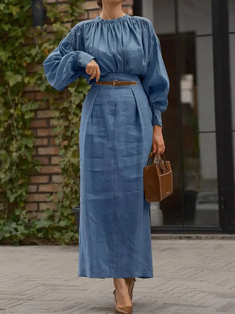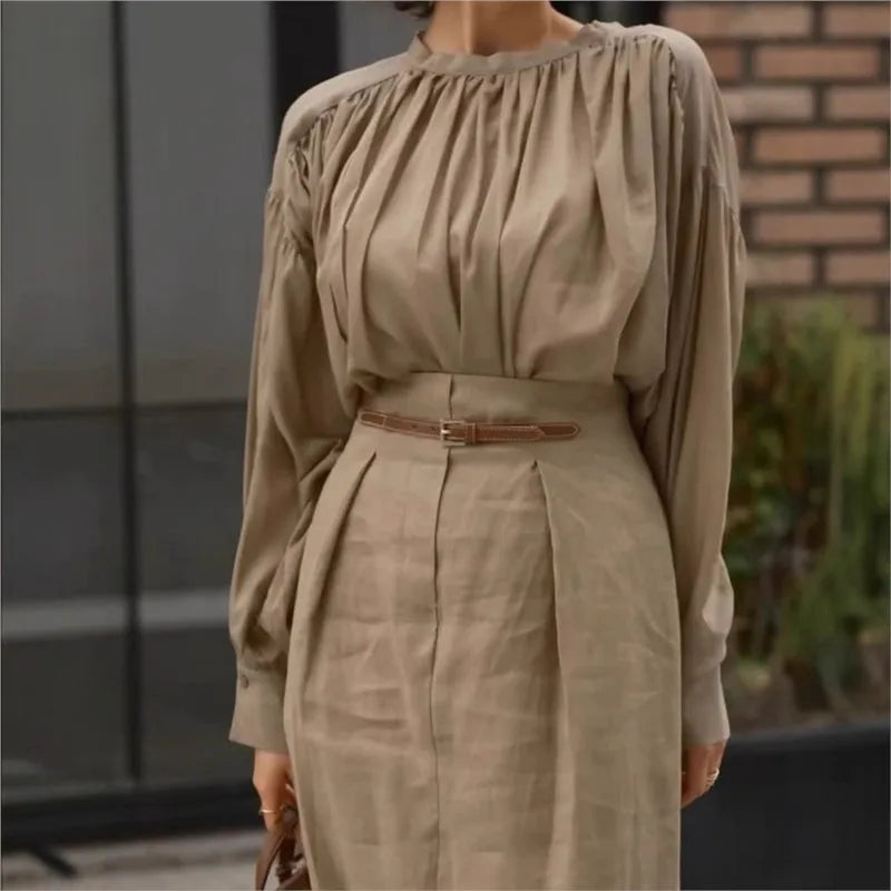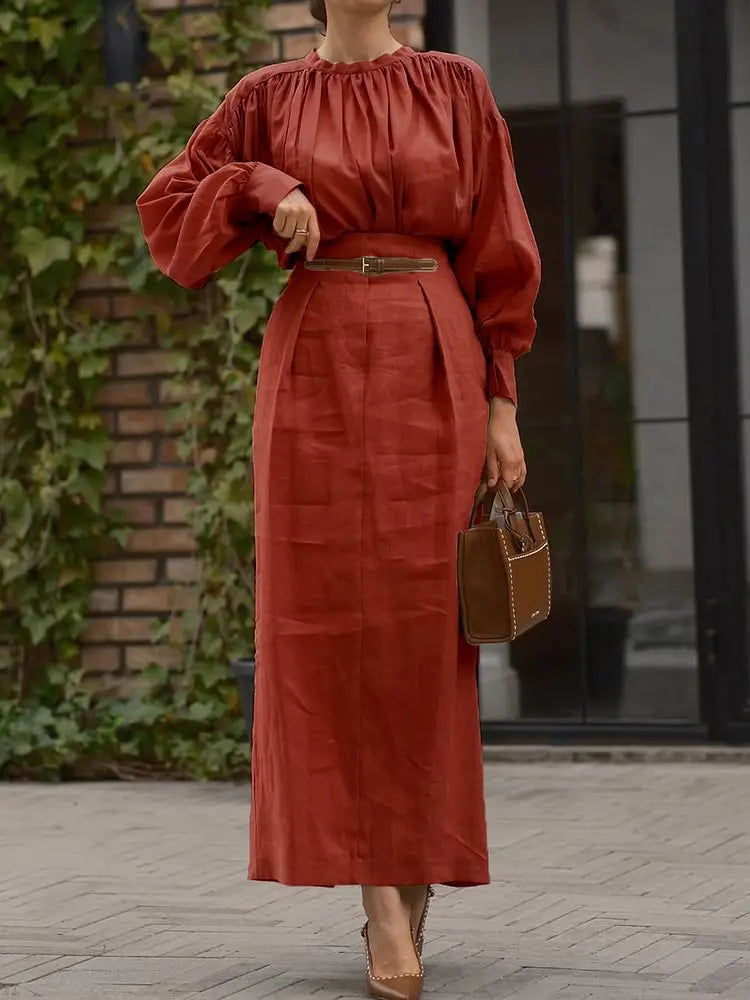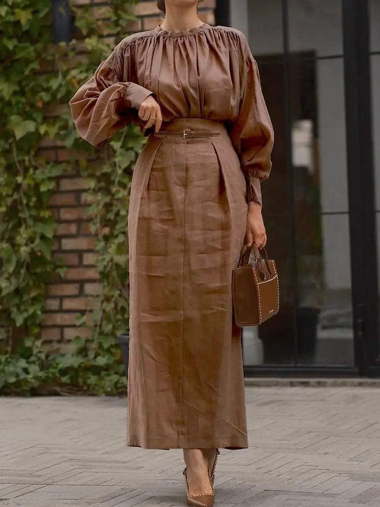 Purpdrank Women's Fashion Solid Skirt Set Elegant O-neck Full Sleeve Pleated Top Loose Maxi Skirt With Belted Lady 2025 Summer Chic Outfit