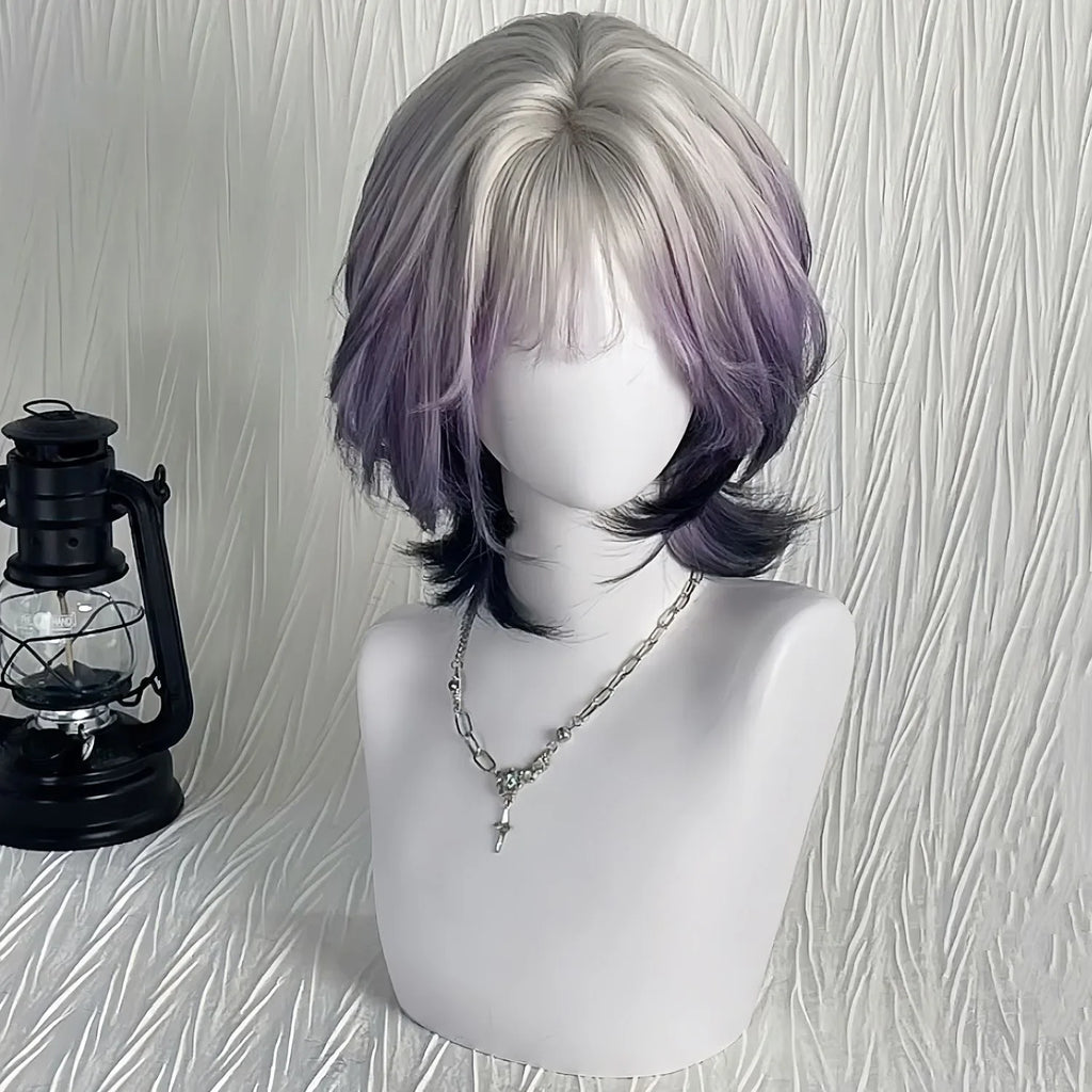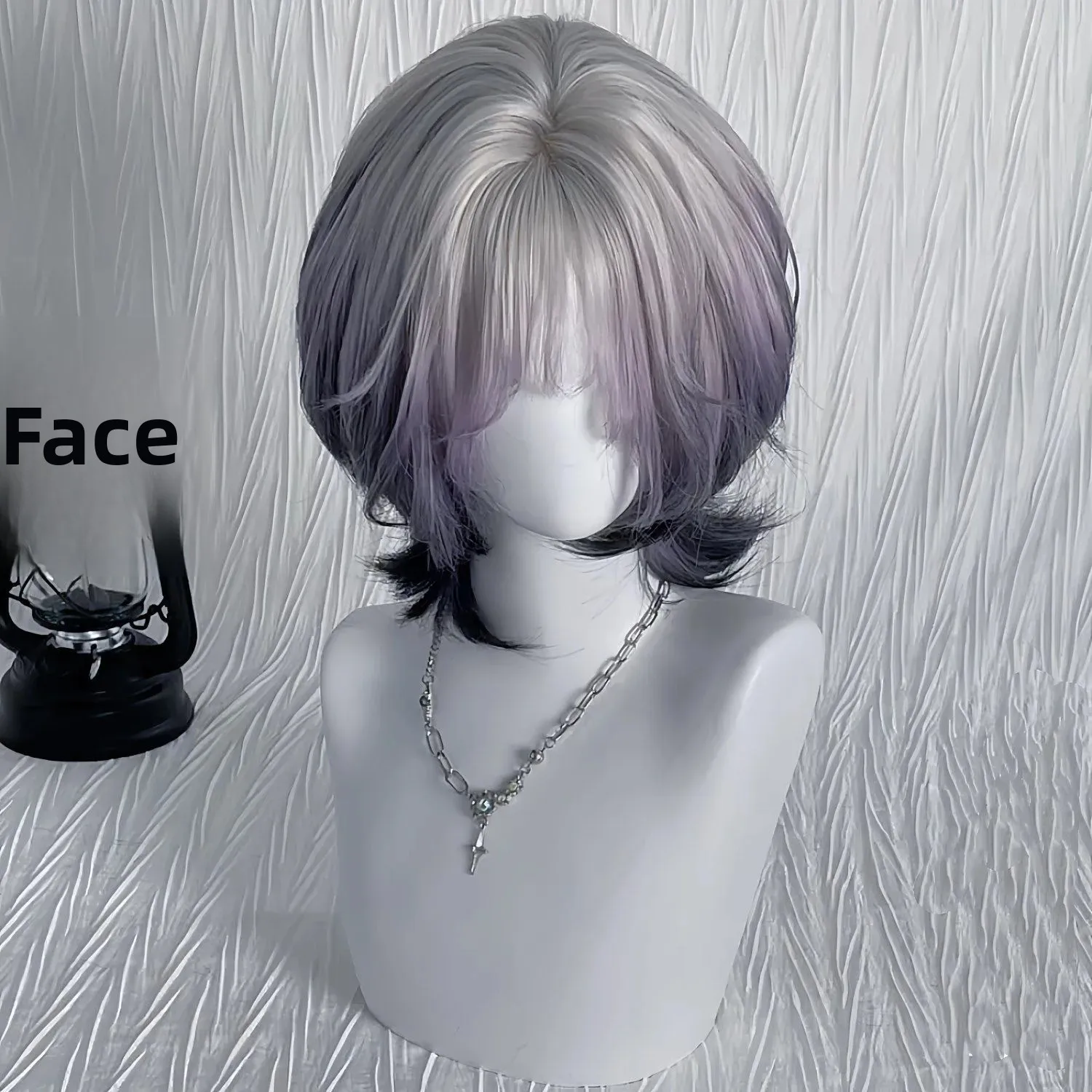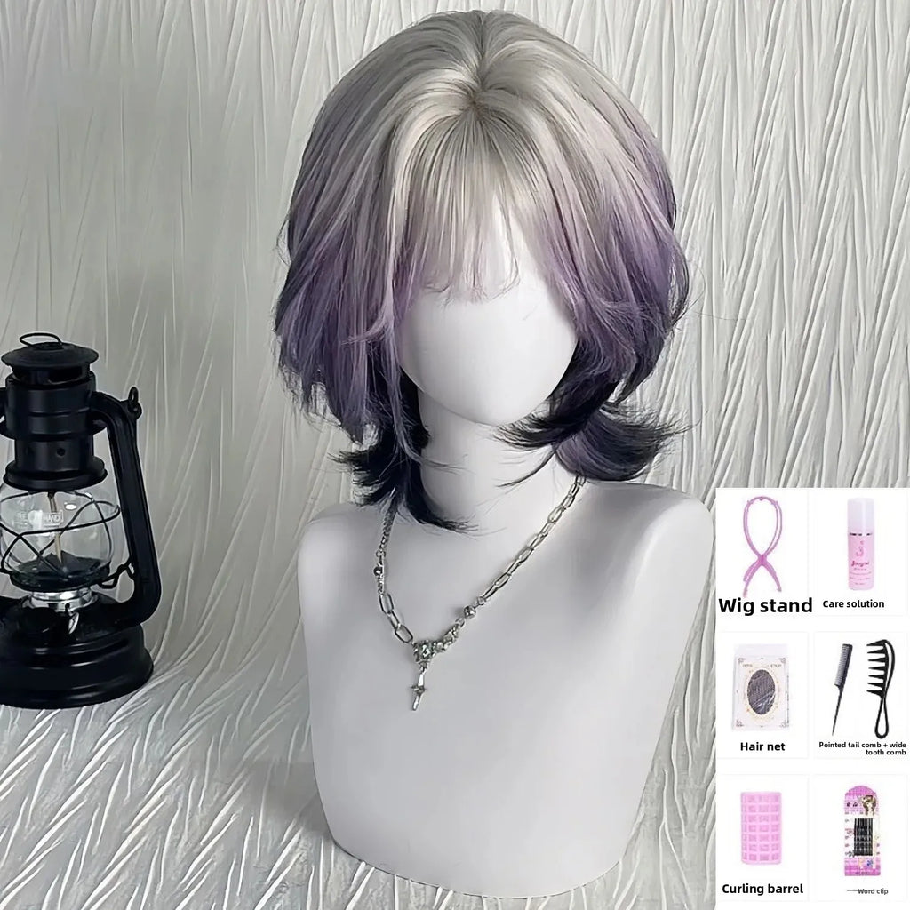 Purpdrank Women's Gradient Pink Purple Short Bob Wig with Bangs Highlighted Top Dyeing Full Head Cover Fiber Mechanism Hair Extension