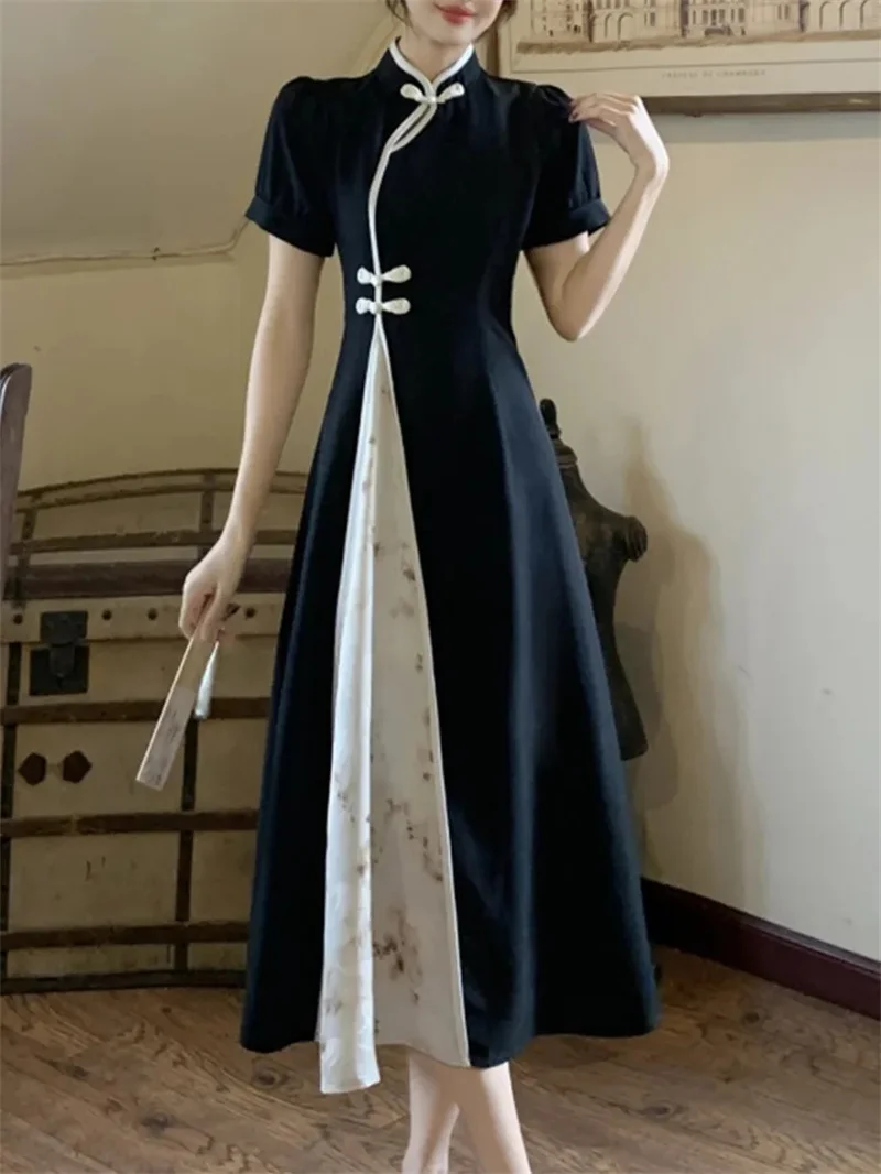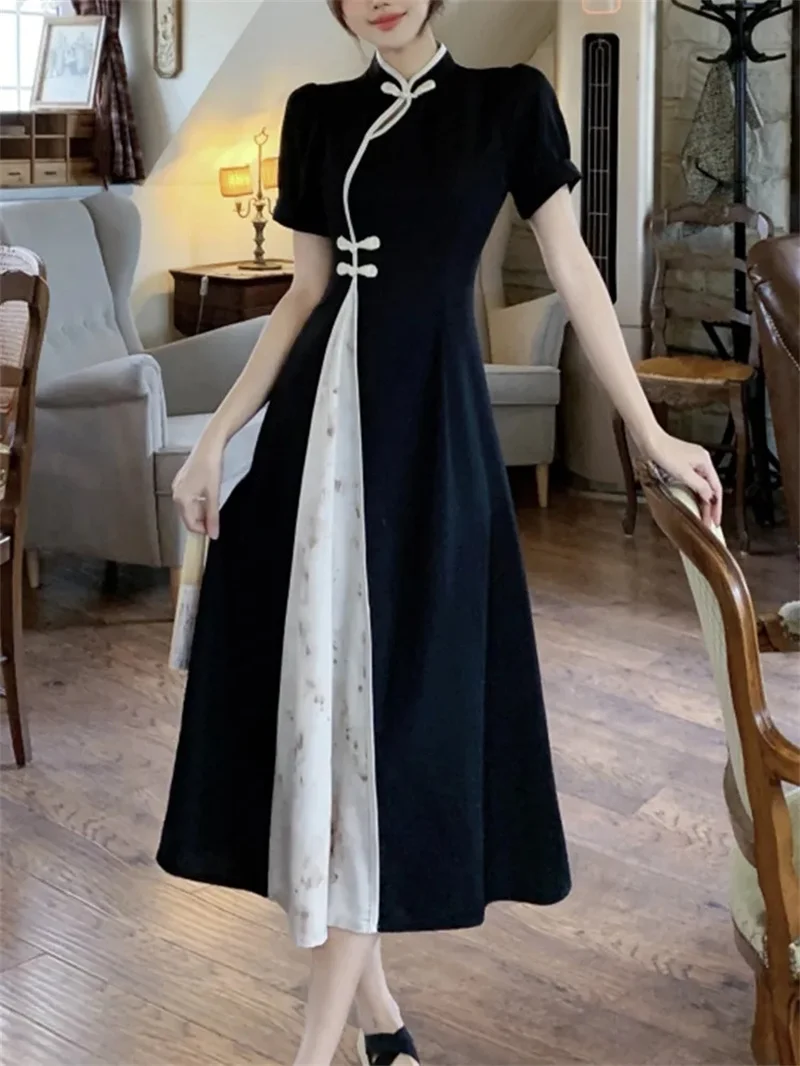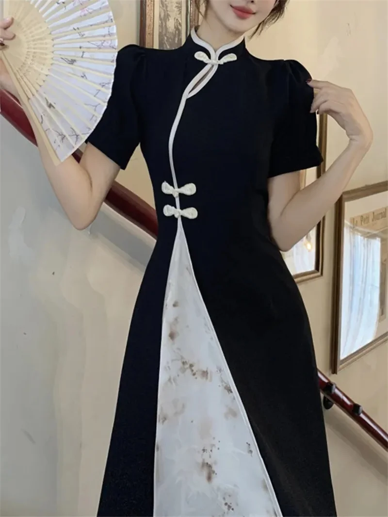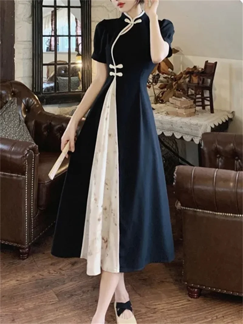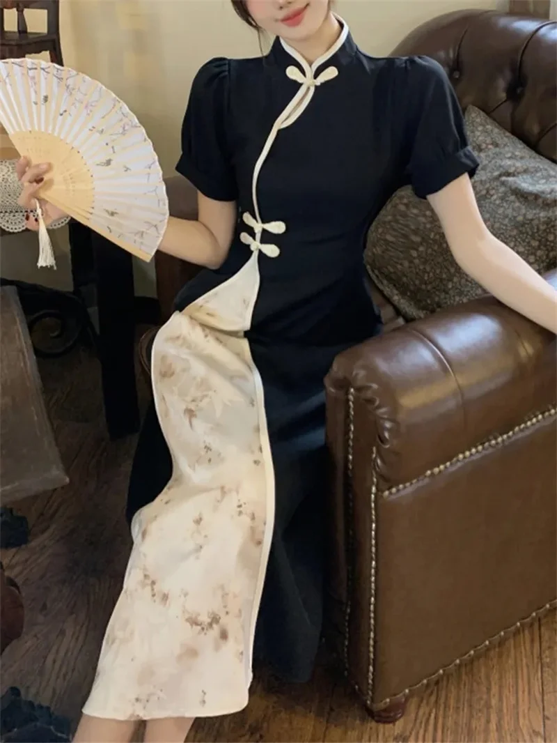 Purpdrank Women's New Chinese Style Retro and Improved Qipao Skirt Women Summer Fat mm Oriental Ink Fragmented Flower Dress Commuter