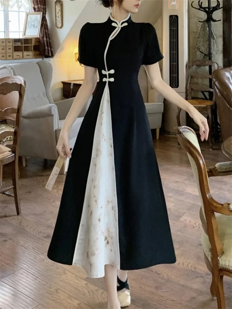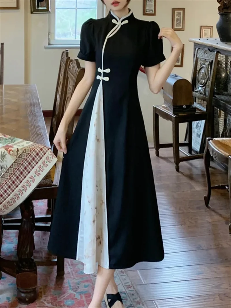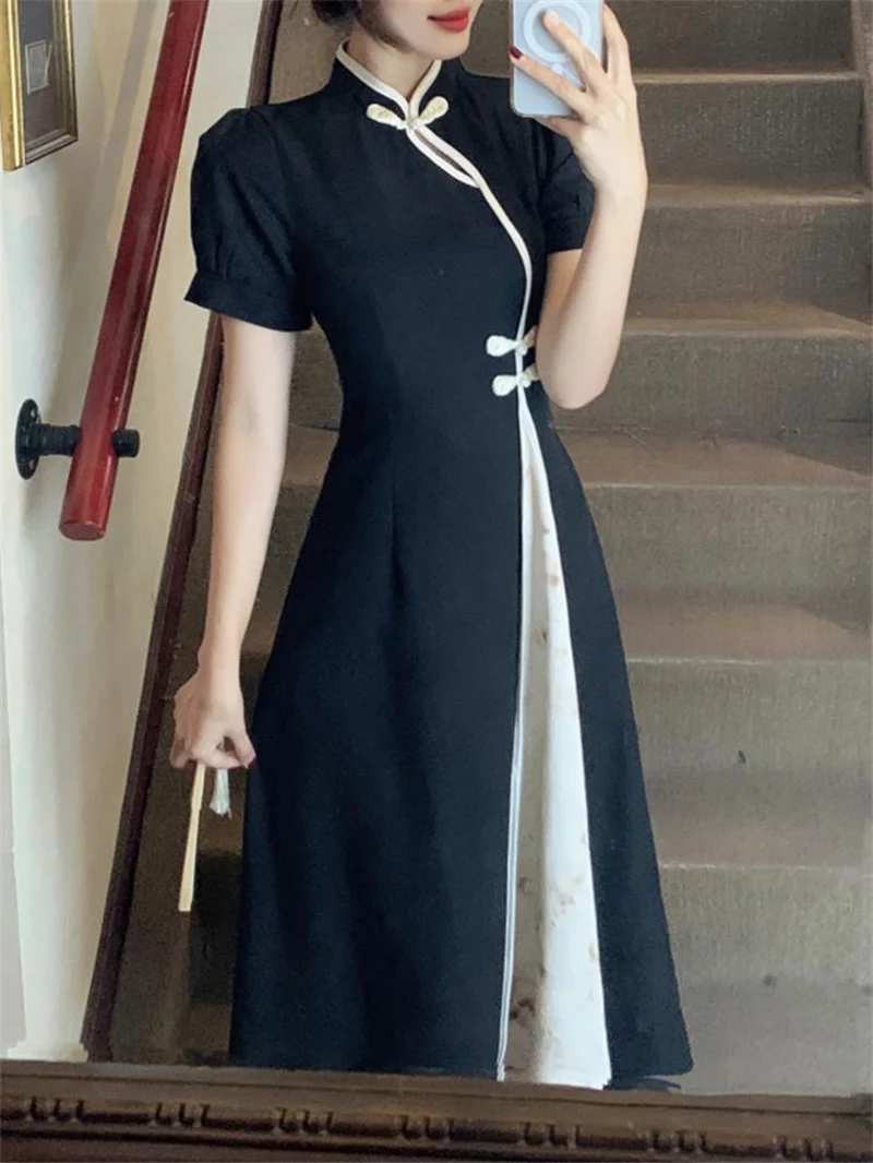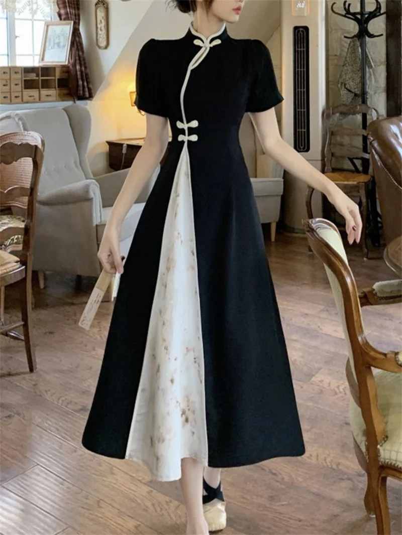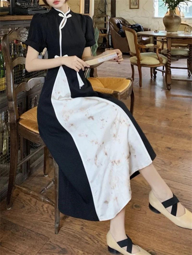 Purpdrank Women's New Chinese Style Retro and Improved Qipao Skirt Women Summer Fat mm Oriental Ink Fragmented Flower Dress Commuter