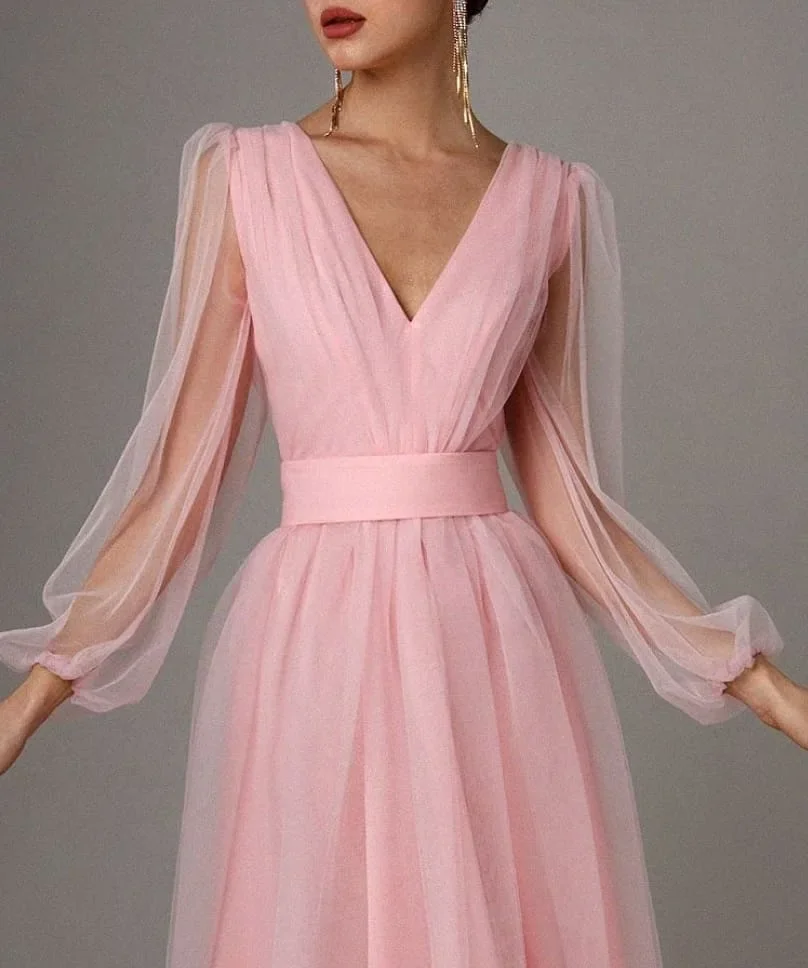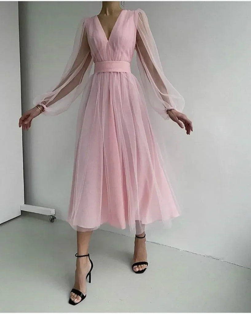 Purpdrank Women's Summer Mesh Lantern Sleeve V-neck Layer Dresses Elegant Party Formal Dress Mujer Vestido Plus Size