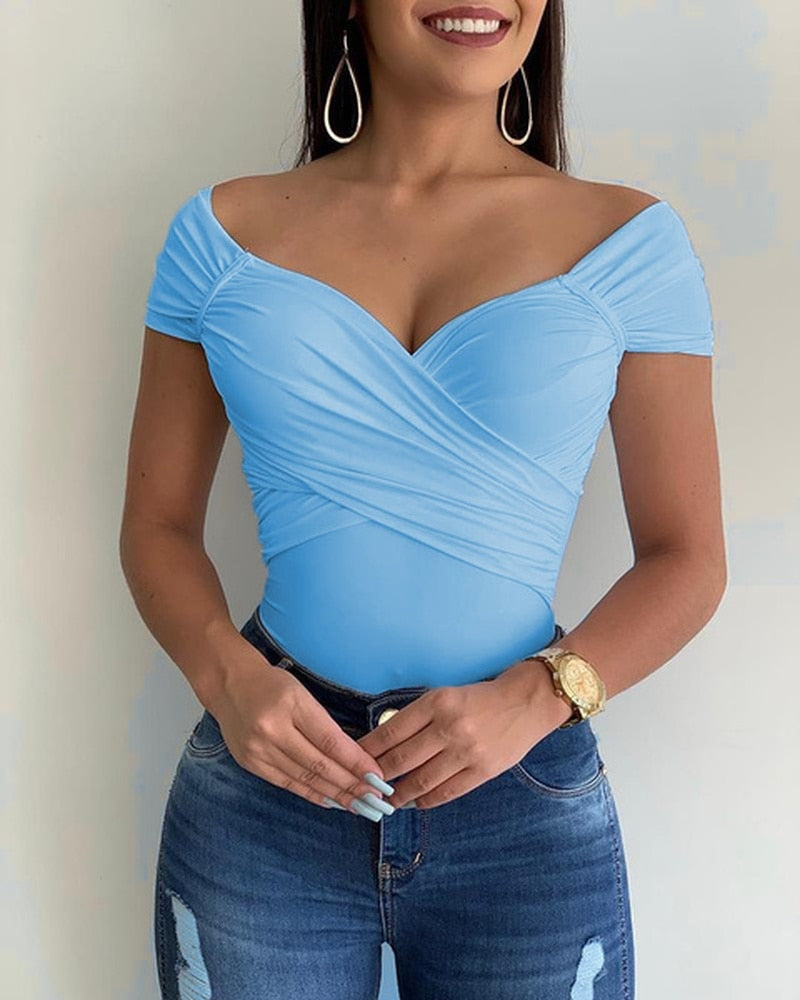 Blouse Women V Neck Shrot Sleeve Shirts Summer Elegant Office Ladies Slim Fit Off Shoulder Solid Color Womens Sexy Tops