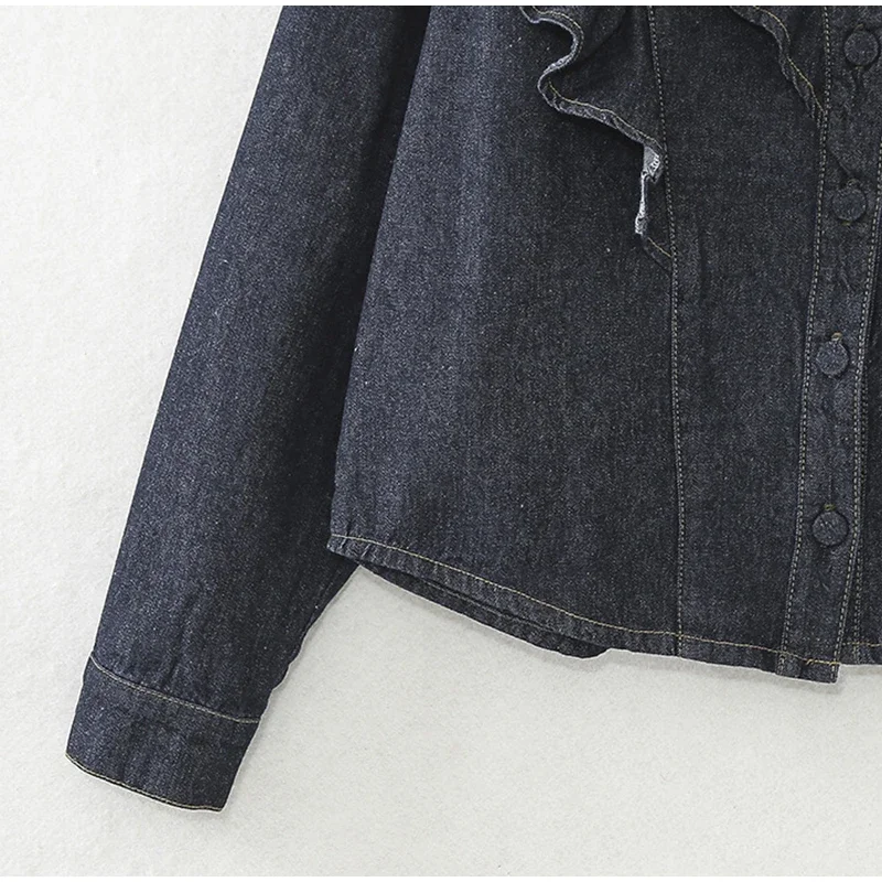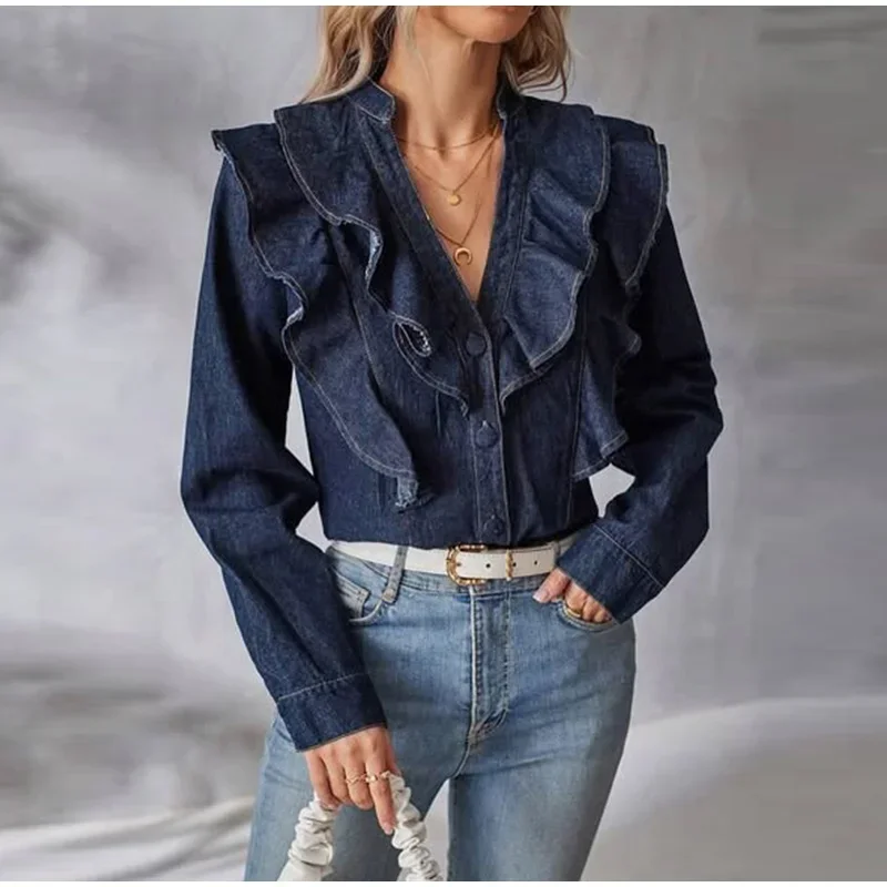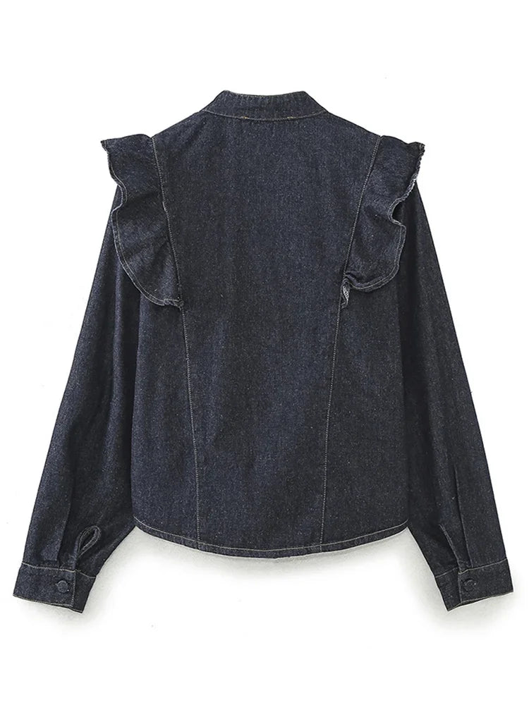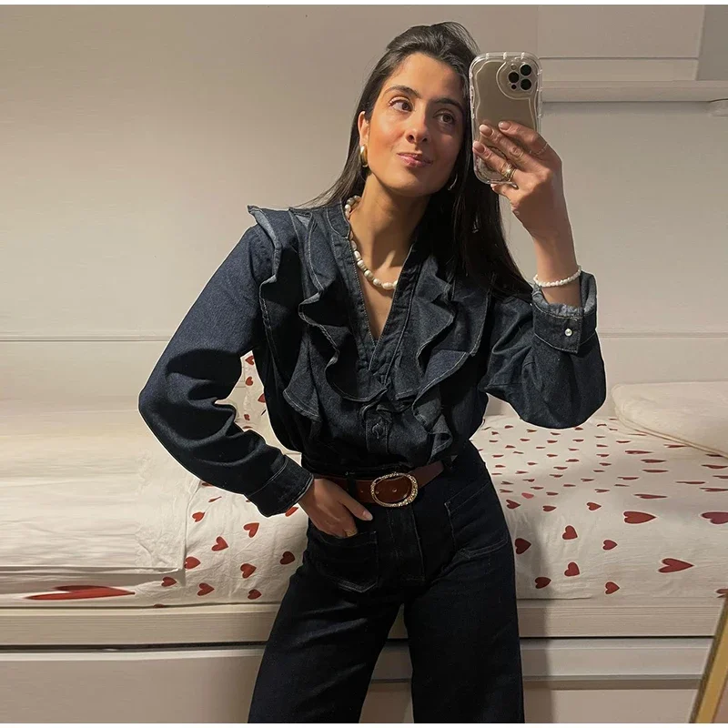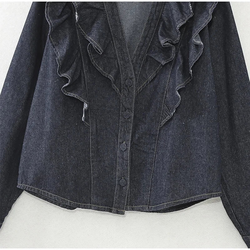 Purpdrank Fashion Ruffled Denim Shirt Jacket For Women Y2K V-neck Long Sleeve Single Breasted Jeans Blouse Female Chic Street Outerwear