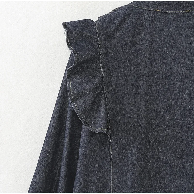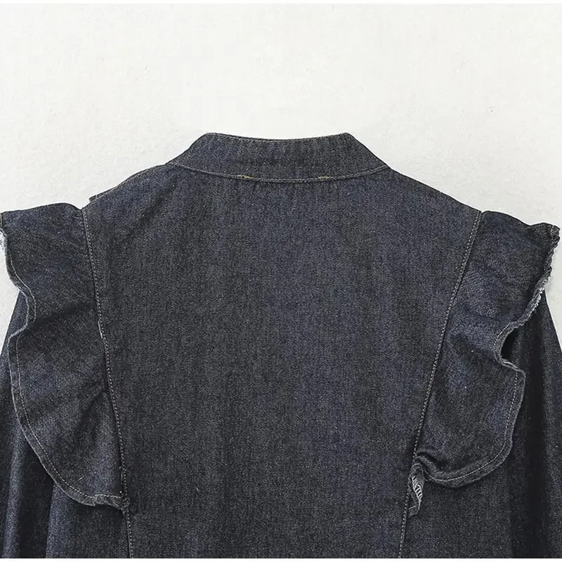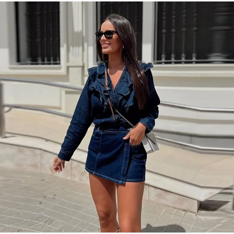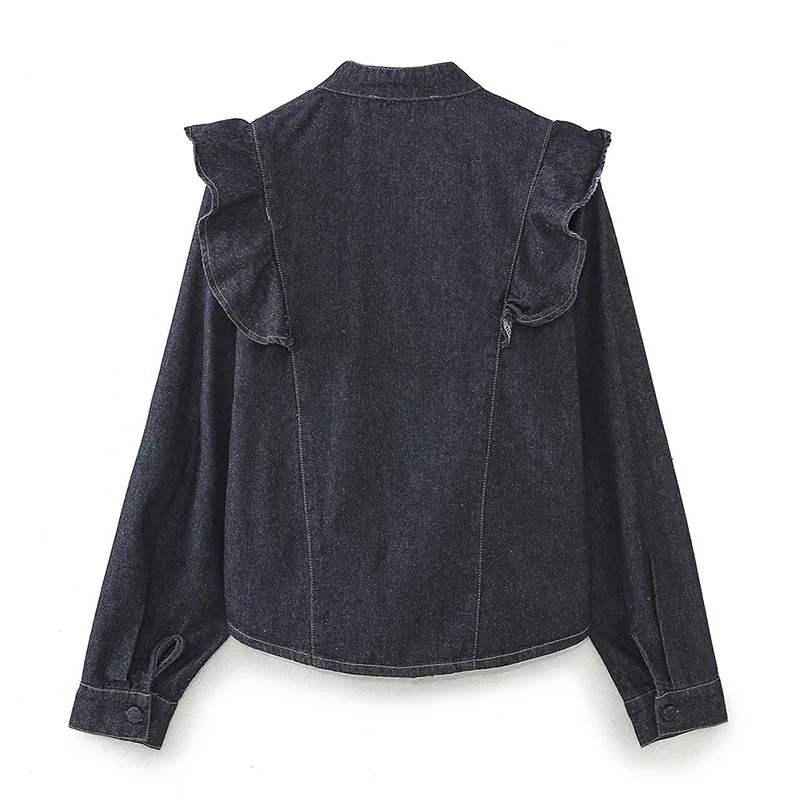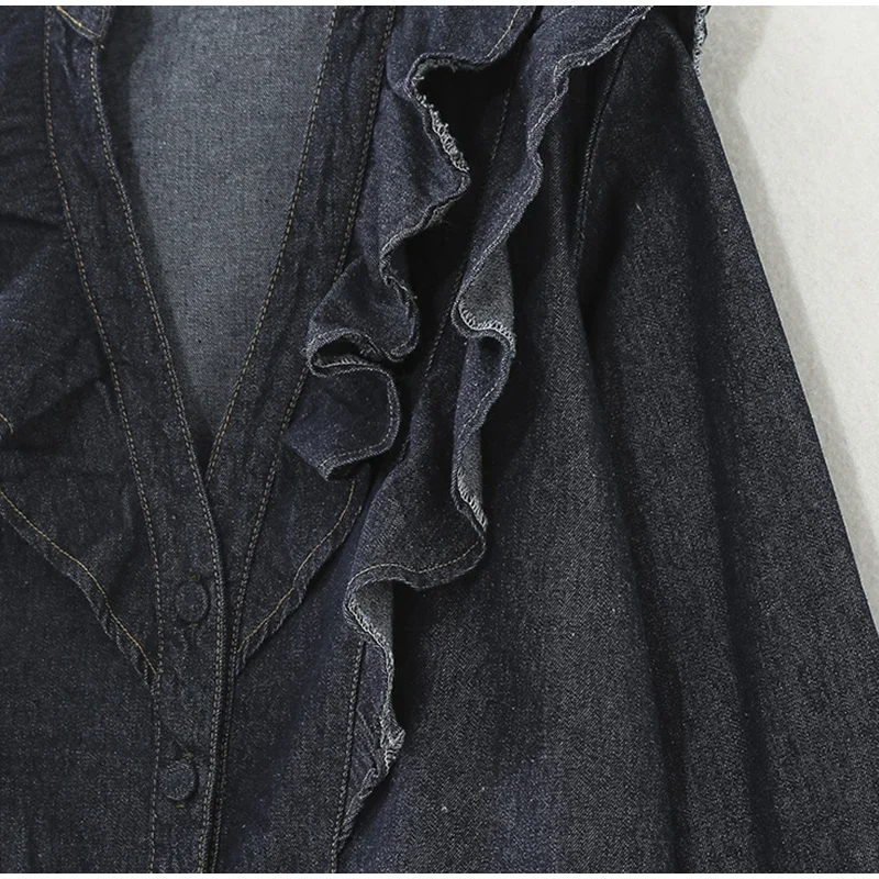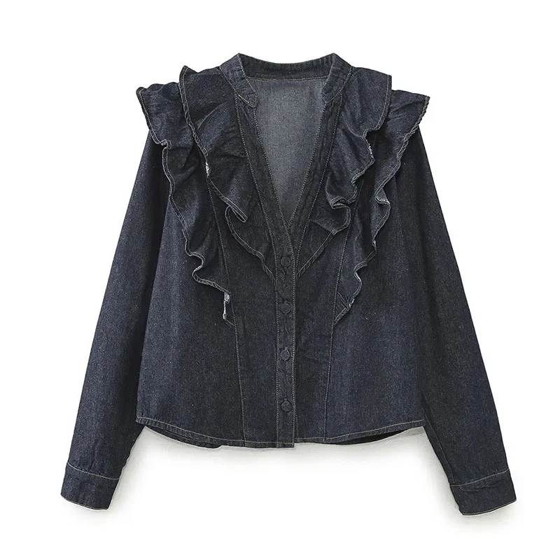 Purpdrank Fashion Ruffled Denim Shirt Jacket For Women Y2K V-neck Long Sleeve Single Breasted Jeans Blouse Female Chic Street Outerwear