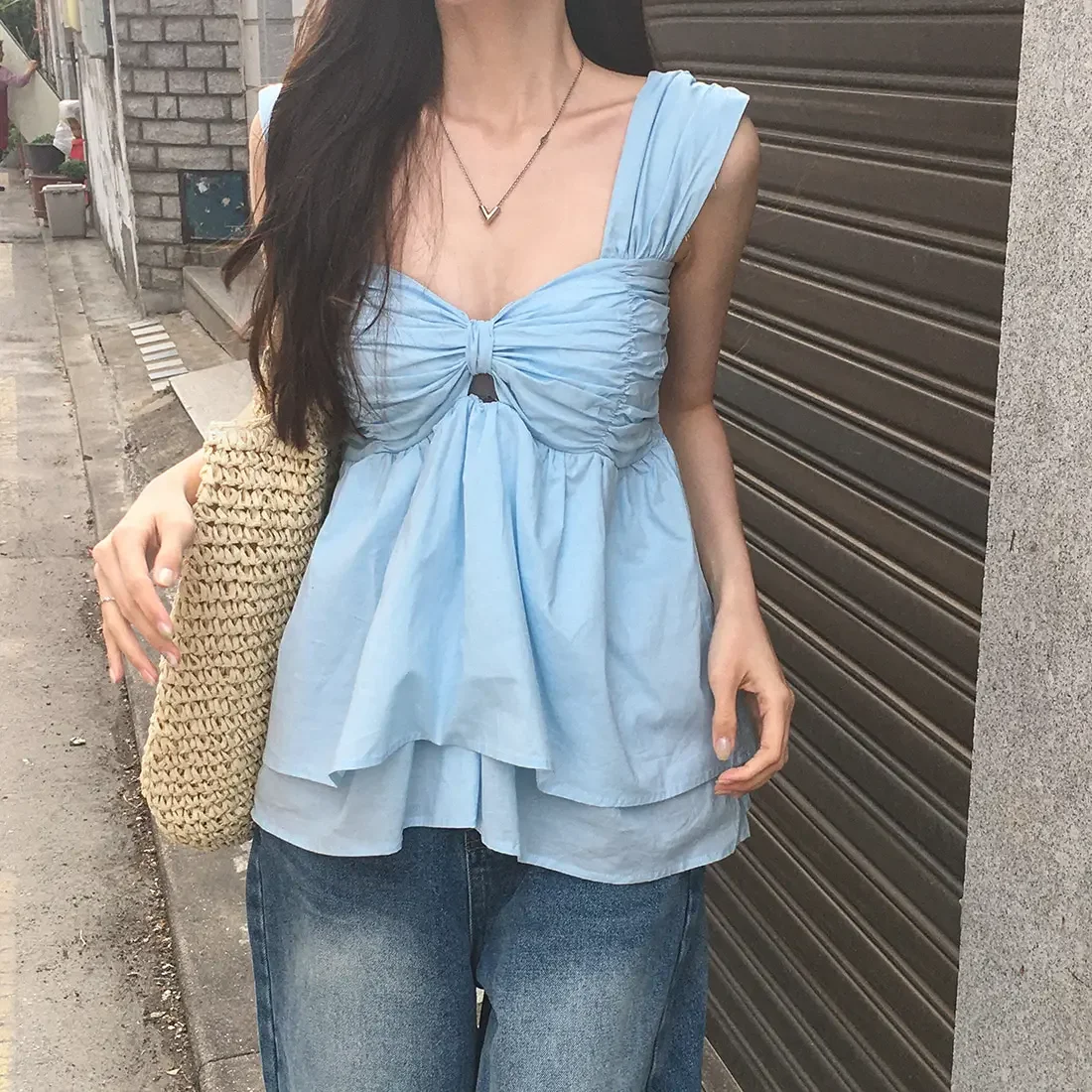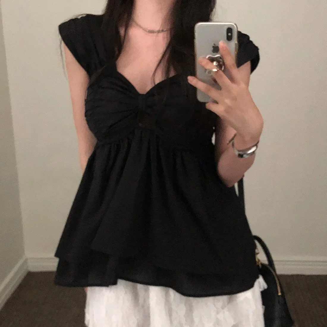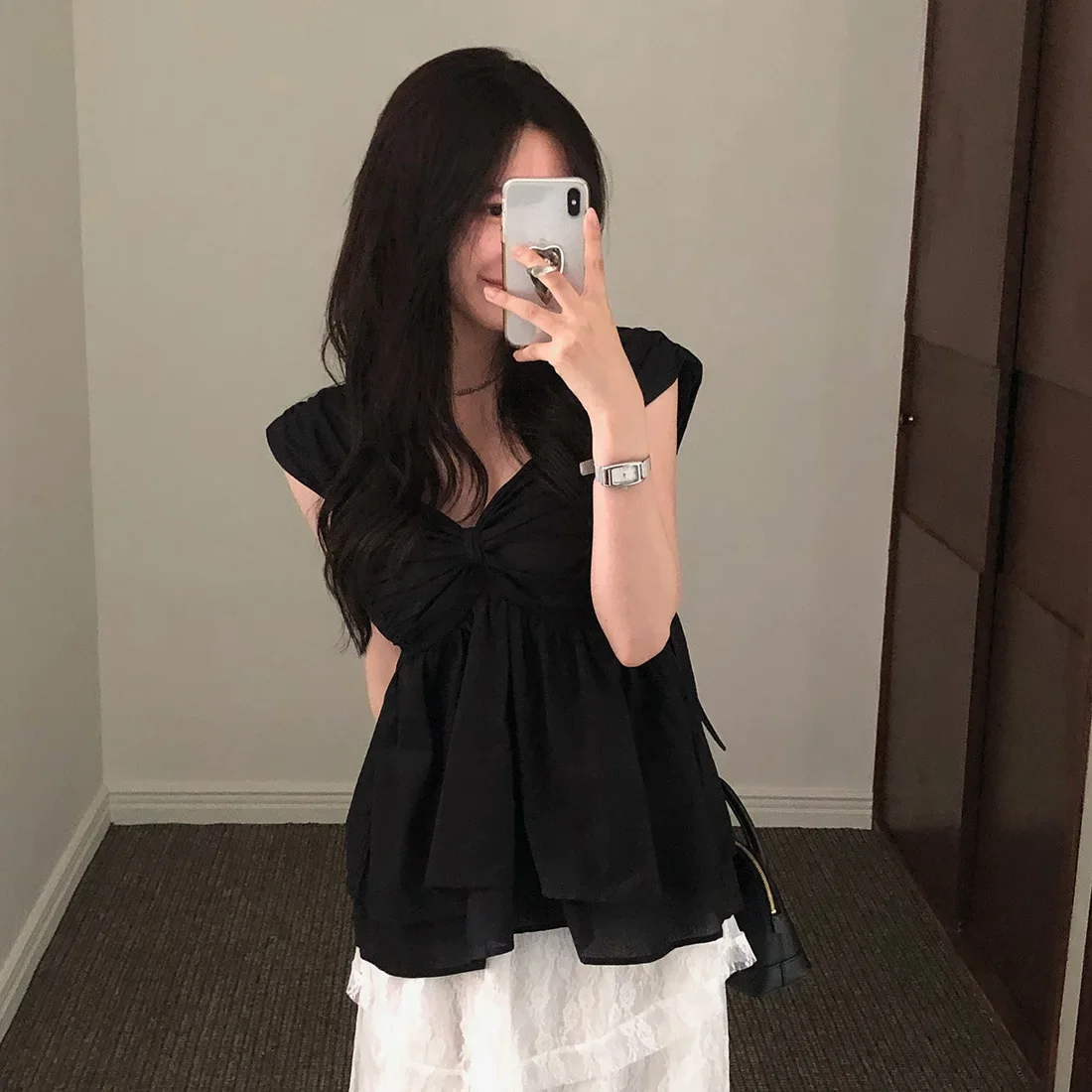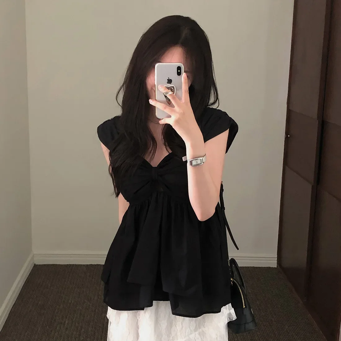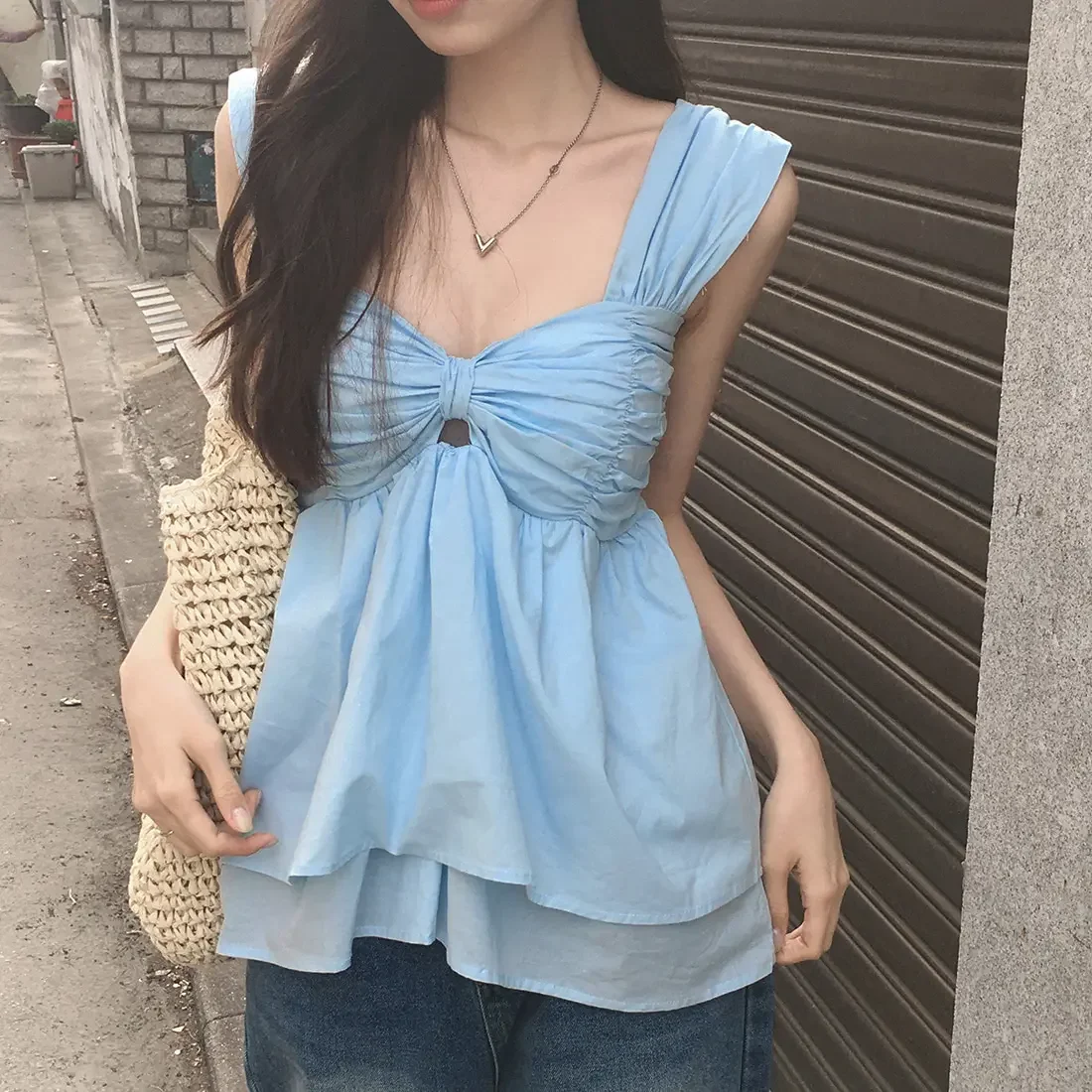 Purpdrank Summer Korean Cute Strapless Women's Bow Blouses 2025 New Sleeveless V-neck Ruffles Sexy Short Shirts Tank Top Female