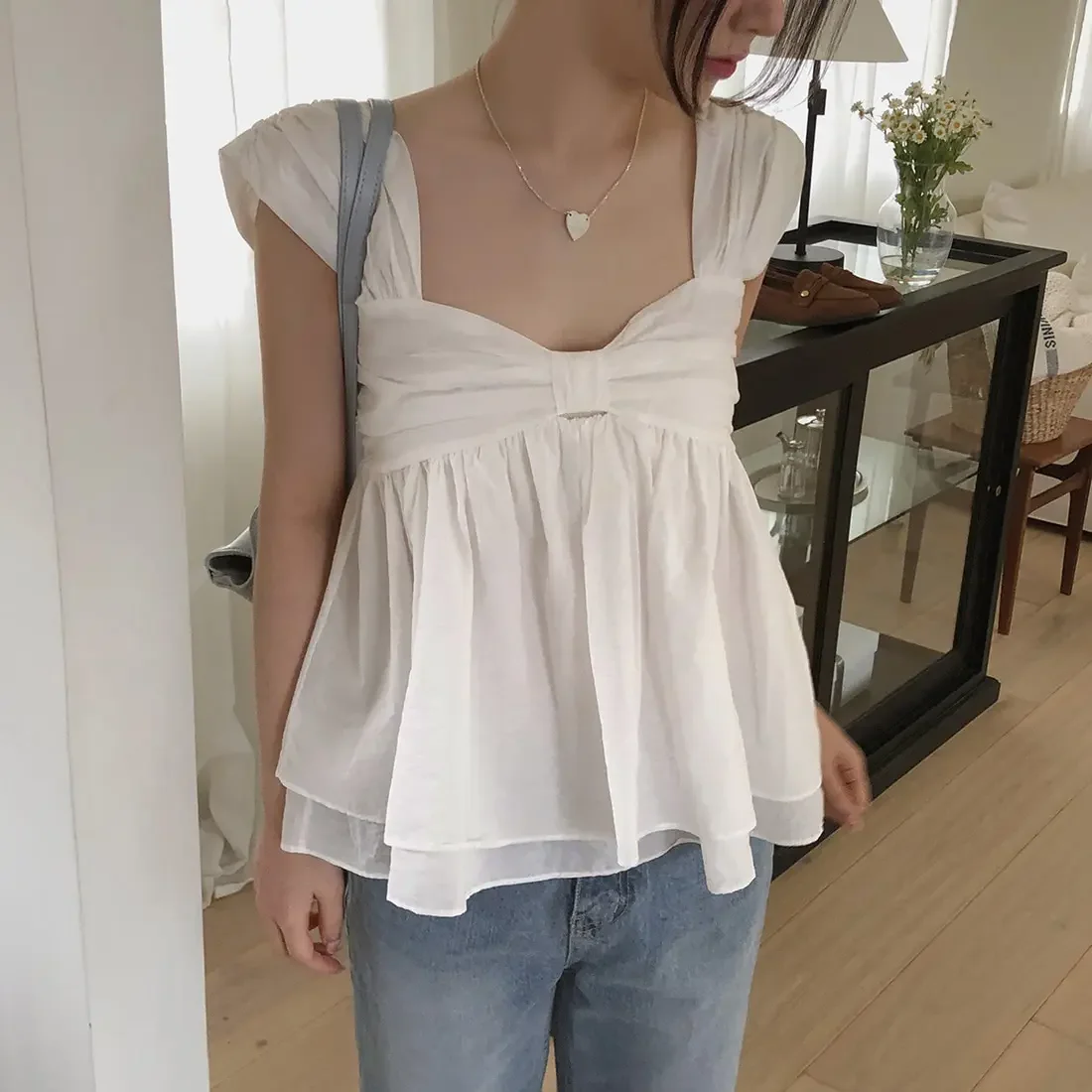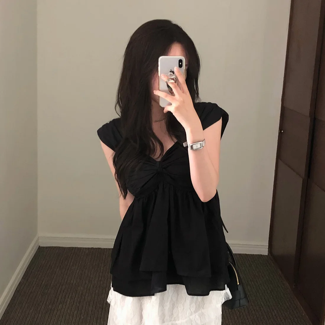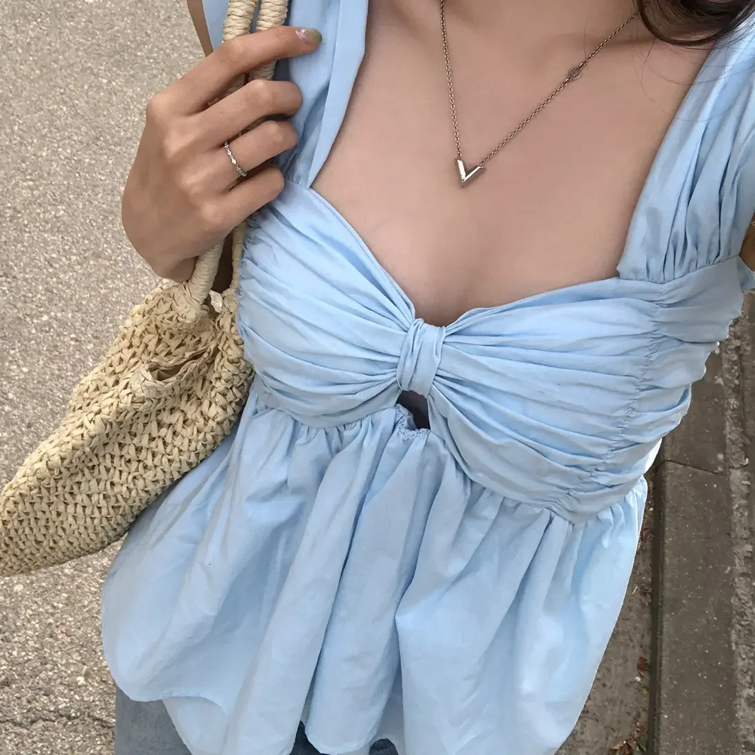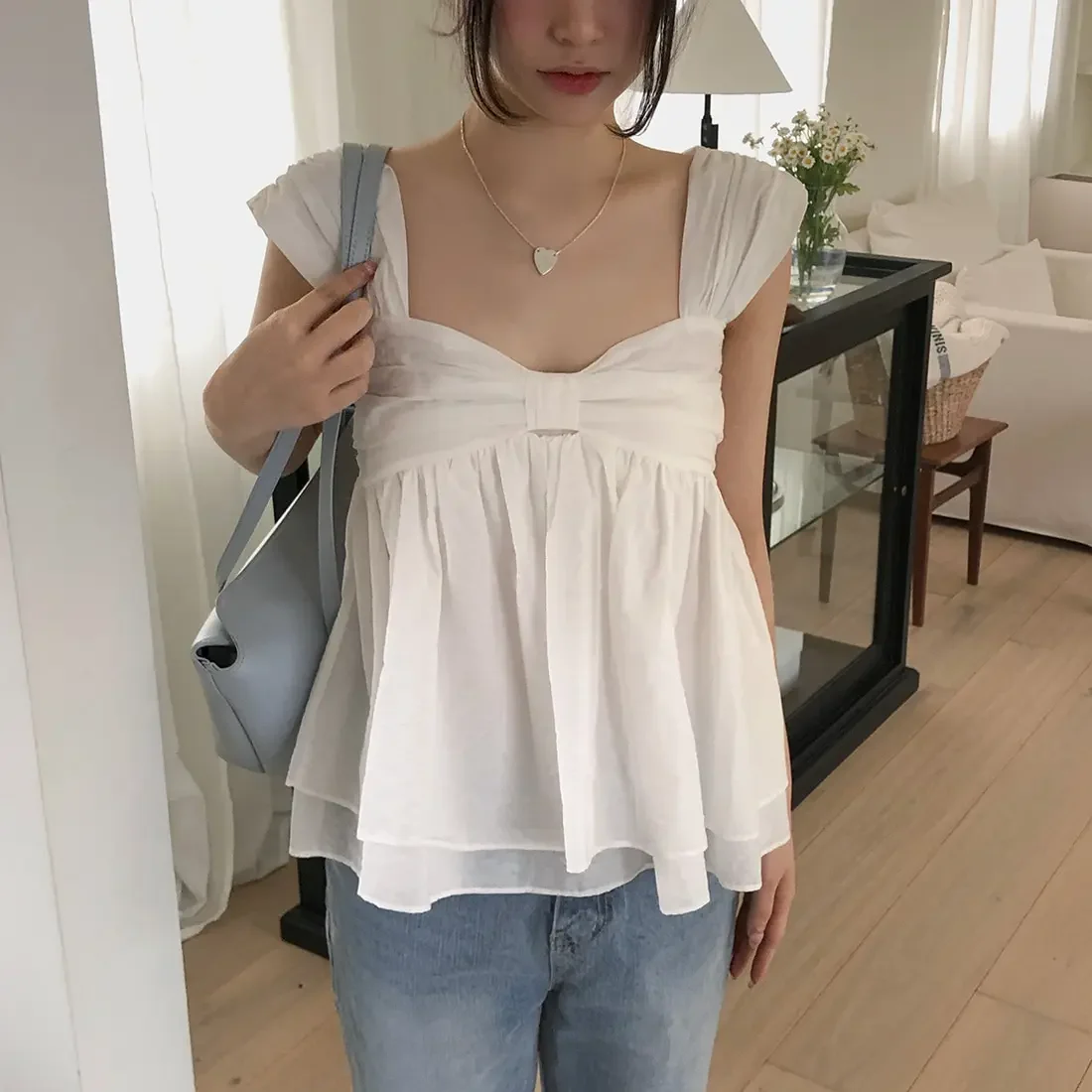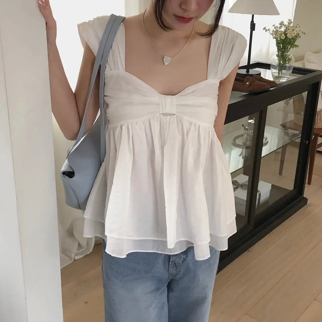 Purpdrank Summer Korean Cute Strapless Women's Bow Blouses 2025 New Sleeveless V-neck Ruffles Sexy Short Shirts Tank Top Female