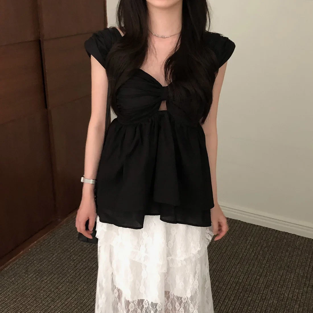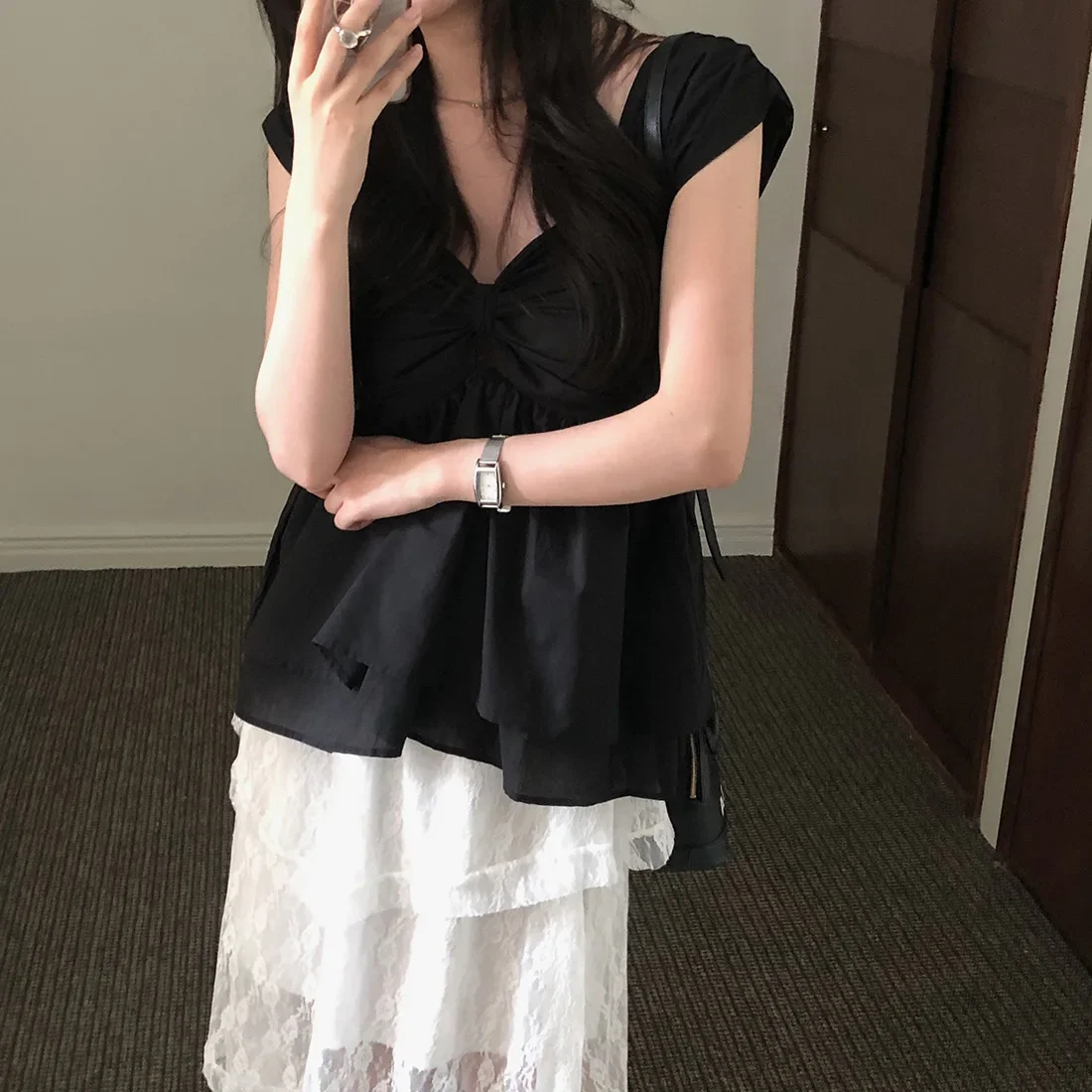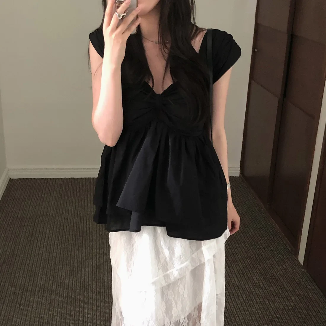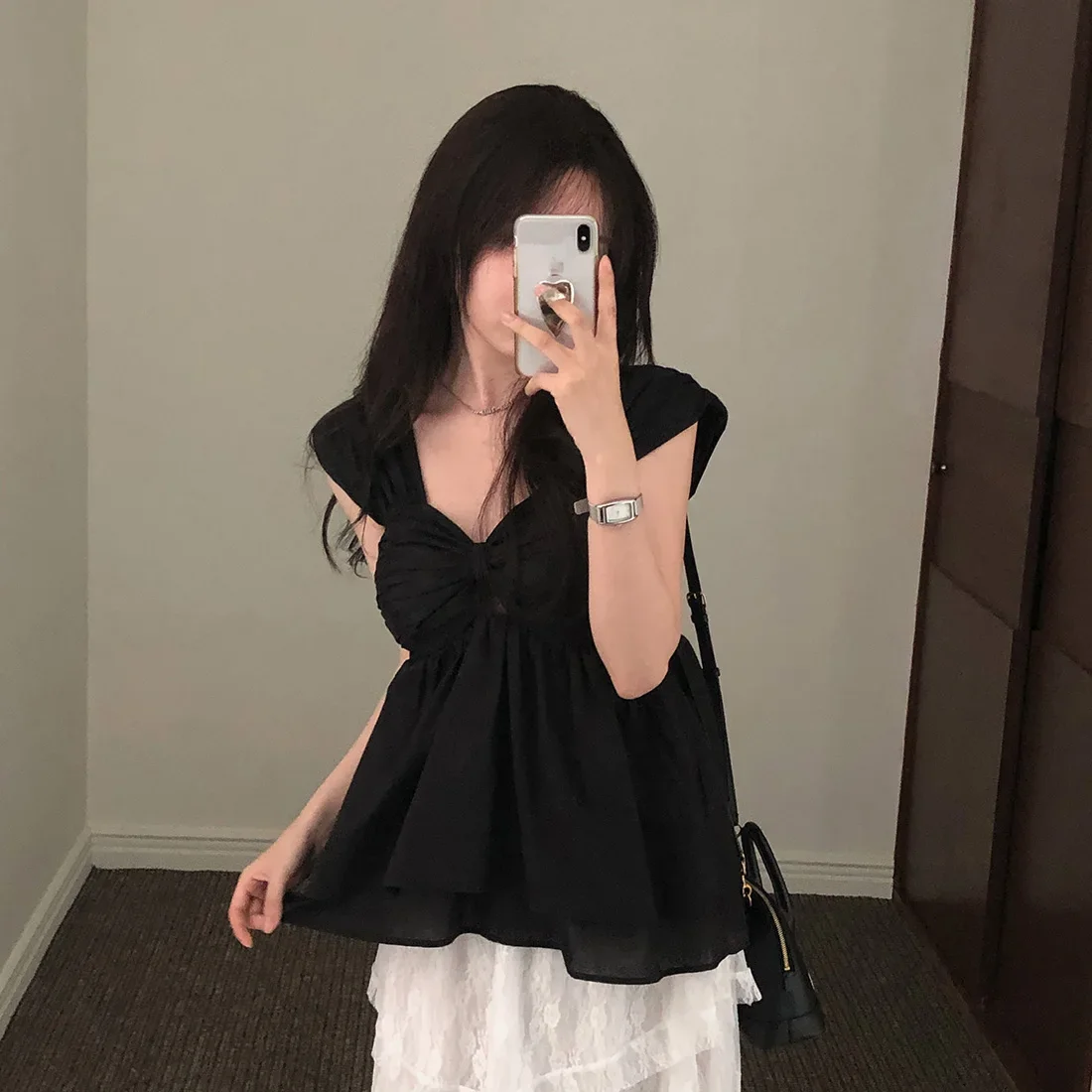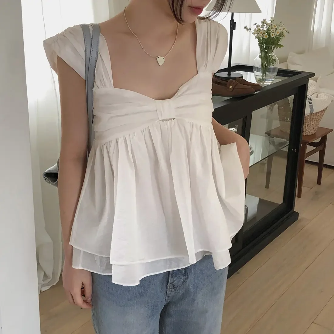 Purpdrank Summer Korean Cute Strapless Women's Bow Blouses 2025 New Sleeveless V-neck Ruffles Sexy Short Shirts Tank Top Female