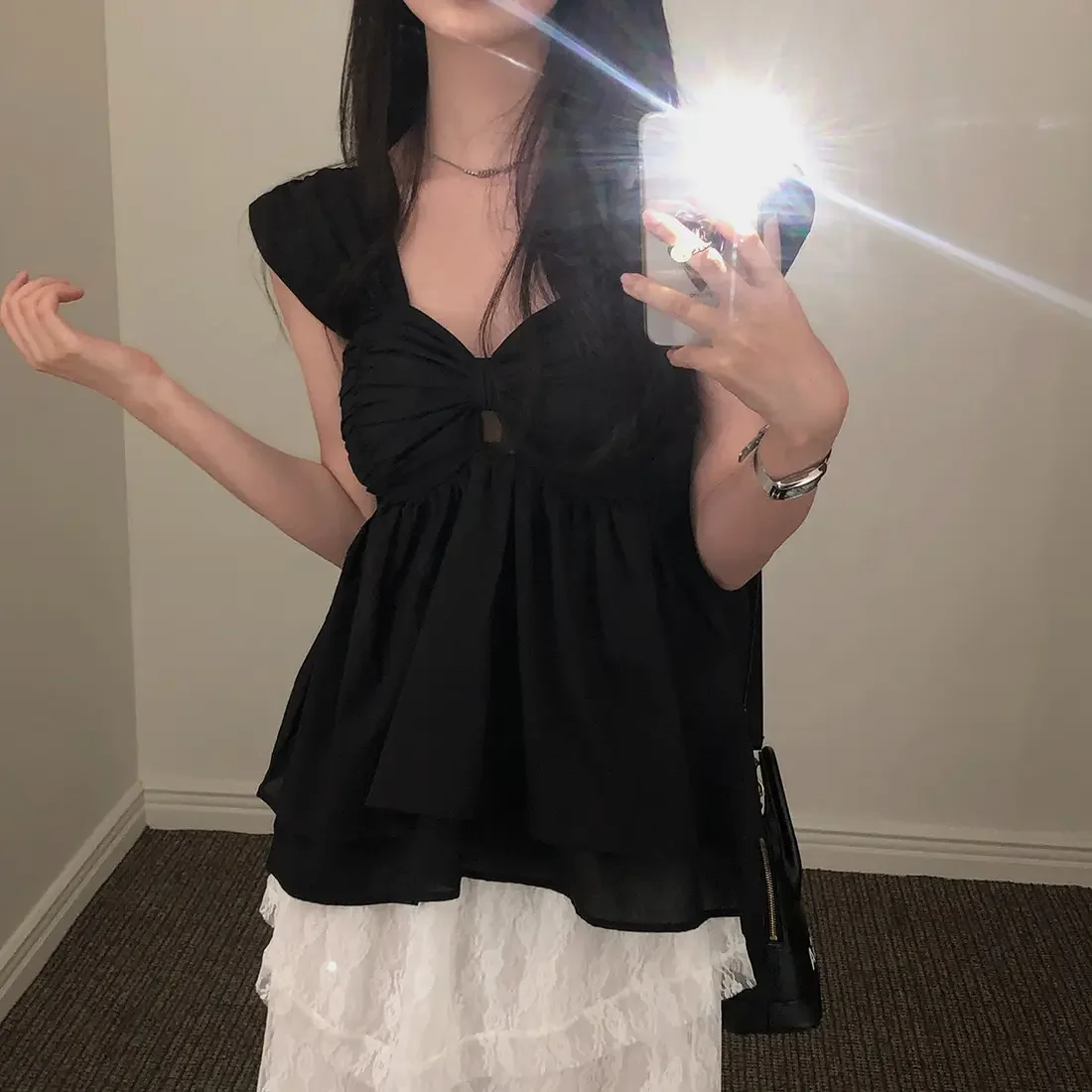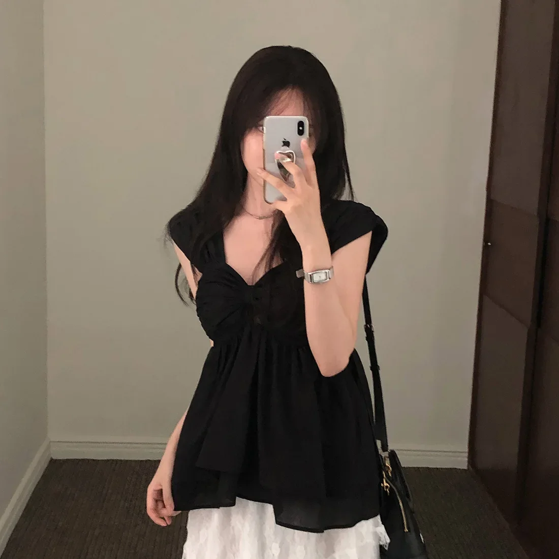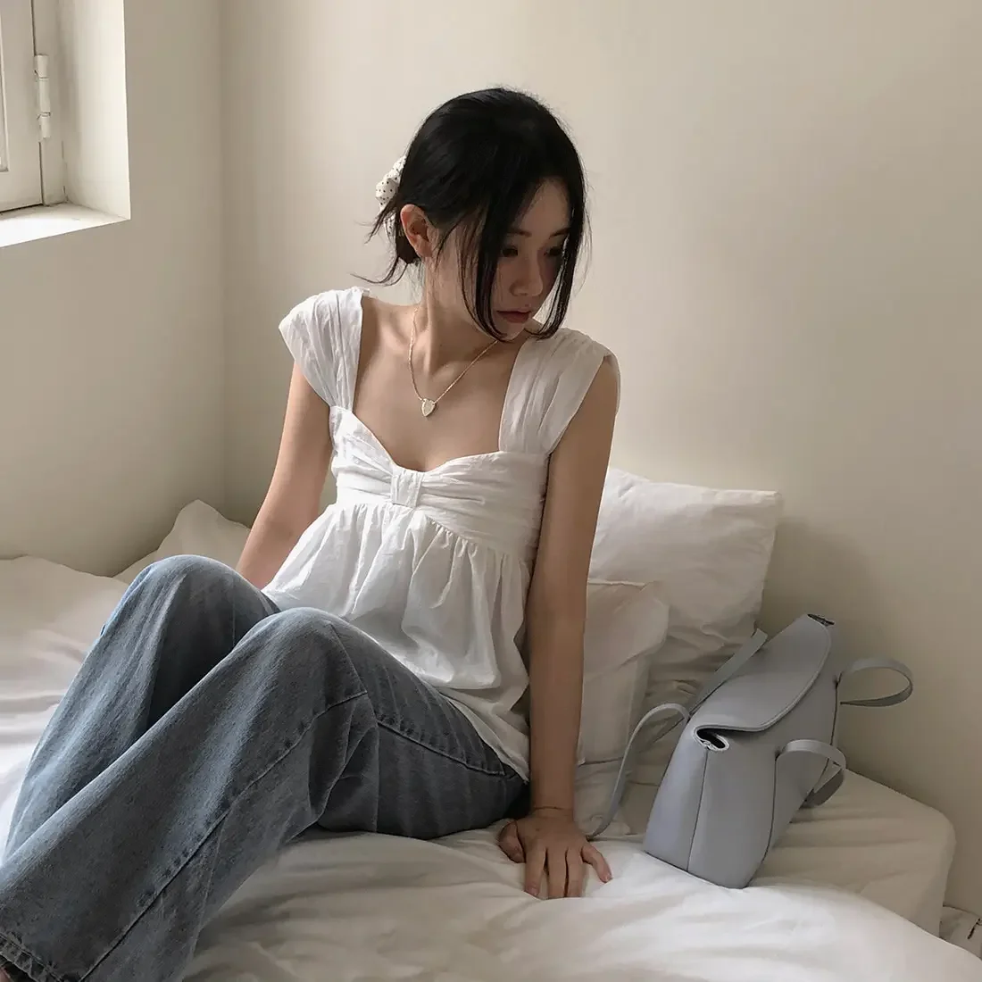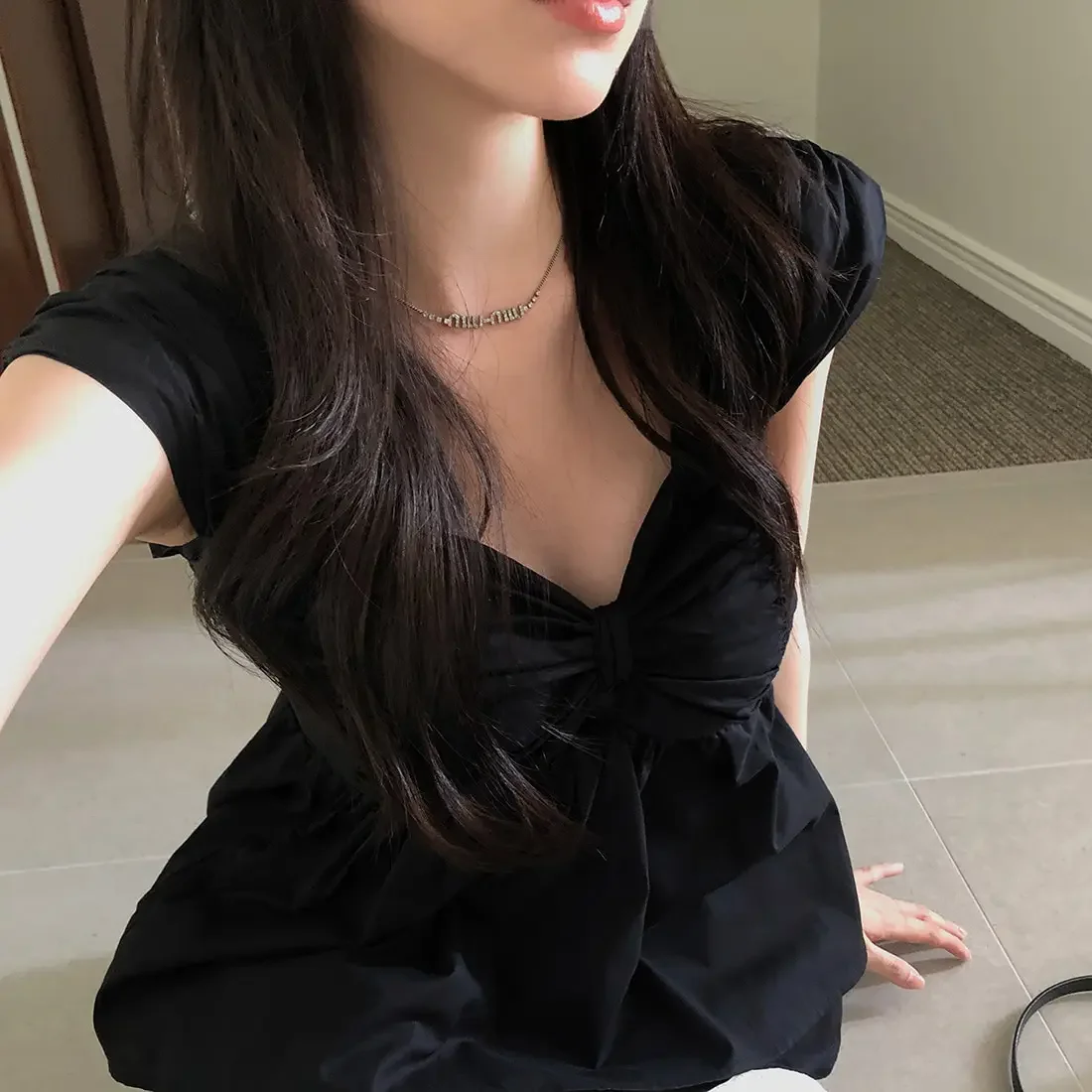 Purpdrank Summer Korean Cute Strapless Women's Bow Blouses 2025 New Sleeveless V-neck Ruffles Sexy Short Shirts Tank Top Female