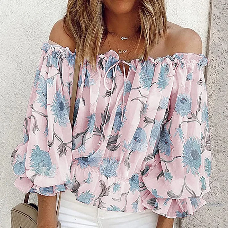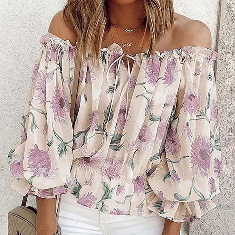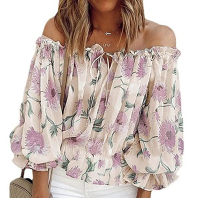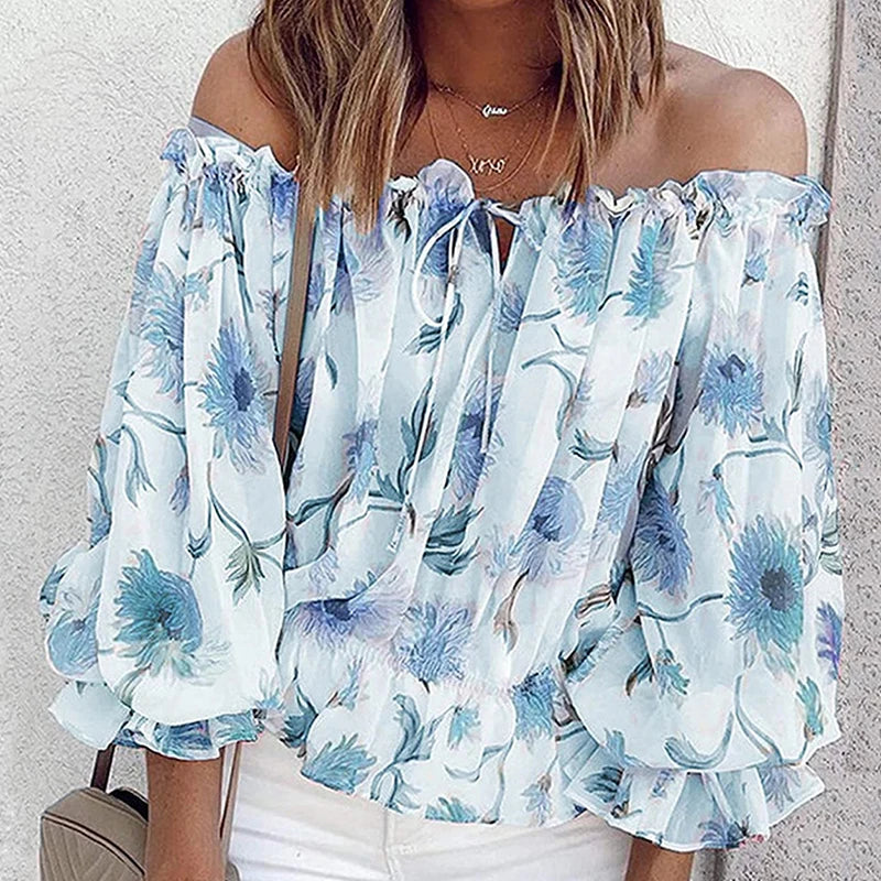 Purpdrank Women Long Sleeve Off Shoulder Floral Print Summer Causal Lace Up Blouse Tops Shirts Female Blouses Sexy Casual Blouse For Women