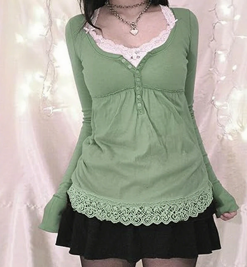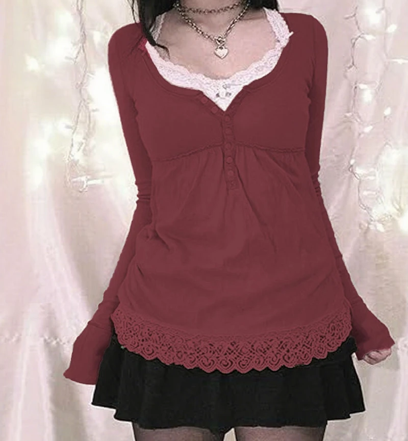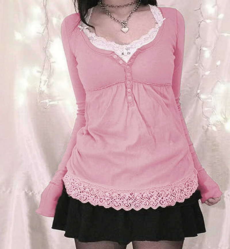 Purpdrank Y2k Cottage Lace Trim Babydoll T-shirt Autumn Button Up Long Sleeve Pullovers Tops Women Cyber Grunge Loose Fit Blouse Tees