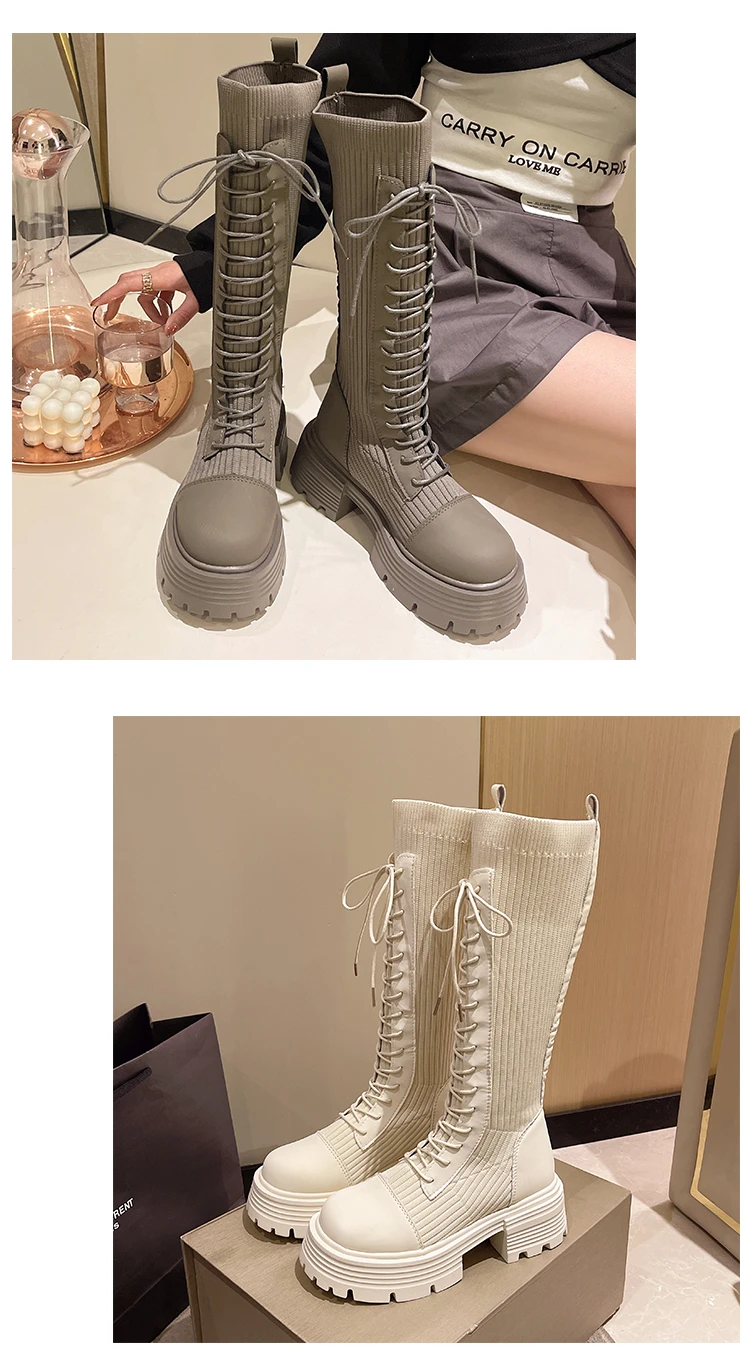 Chunky Platform Knitted Long Boots Women Autumn Thick Bottom Warm Sock Shoes Woman Lace Up Knee High Botas De Mujer