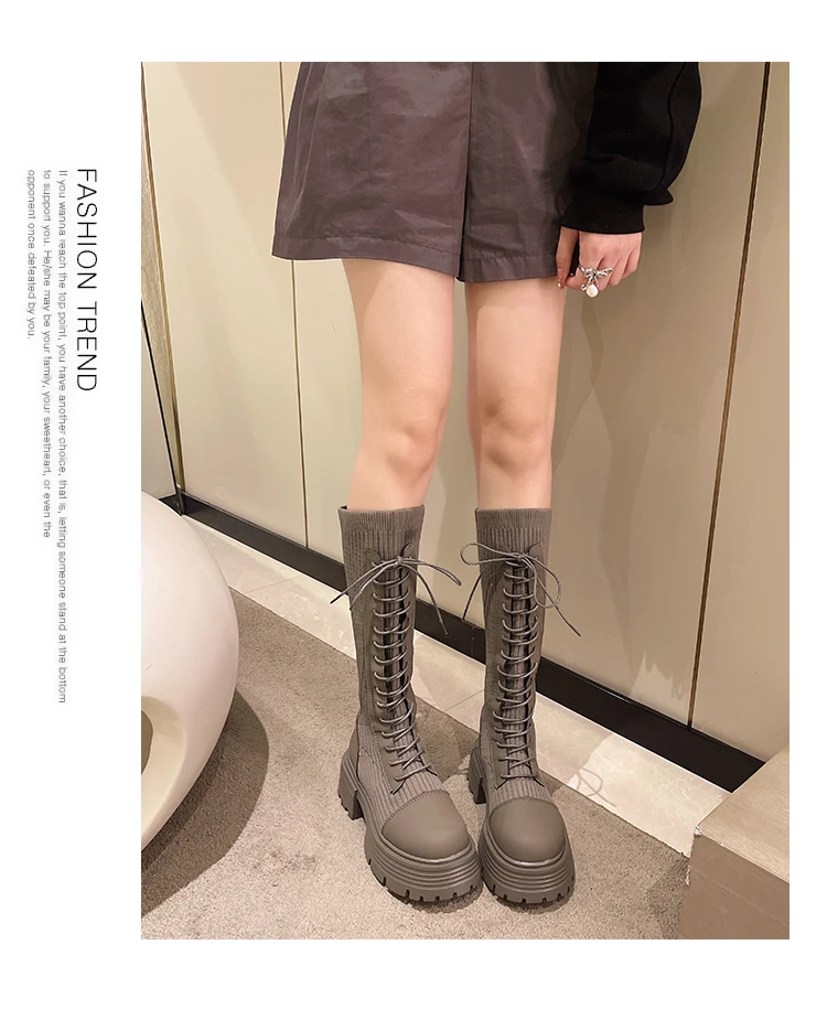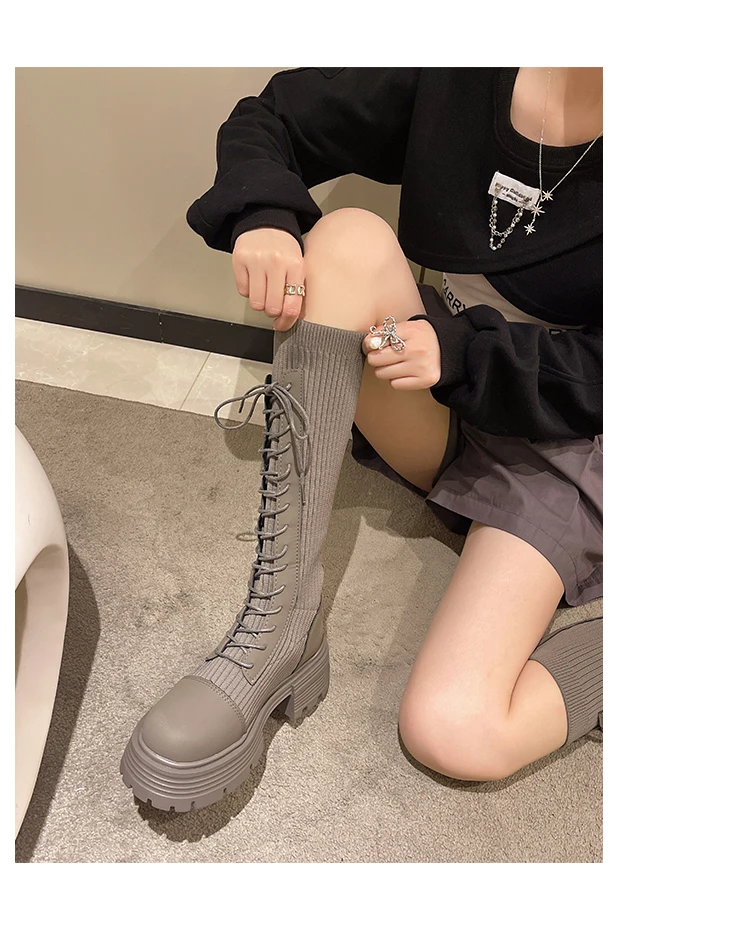 Purpdrank - Chunky Platform Knitted Long Boots Women Autumn Thick Bottom Warm Sock Shoes Woman Lace Up Knee High Botas De Mujer