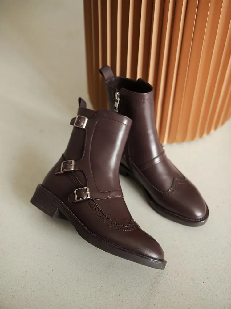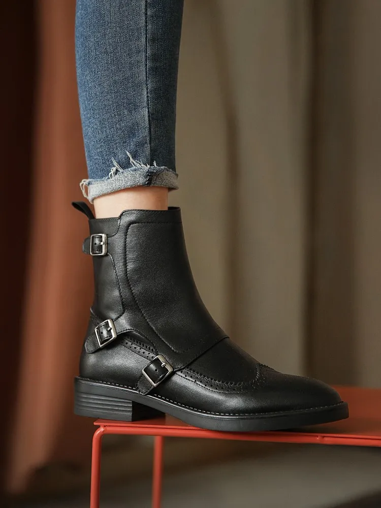 Purpdrank - winter new full leather low-heeled women's boots retro fashion all-match essential women's short boots pointed ankle boots