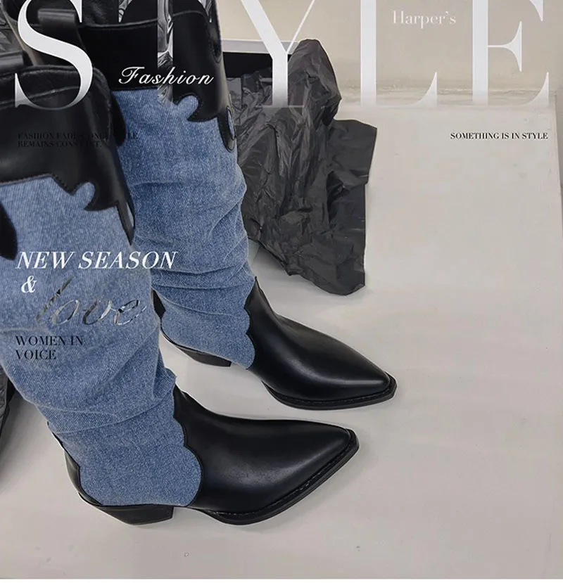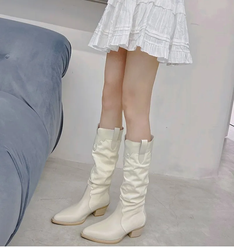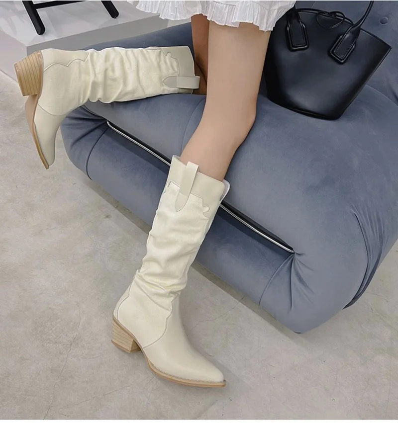 Purpdrank - Winter Pointed Toe Woman Western Cowgirl Boot Fashion Slip On Square Mid Heel Shoes Ladies Elegant Long Booties