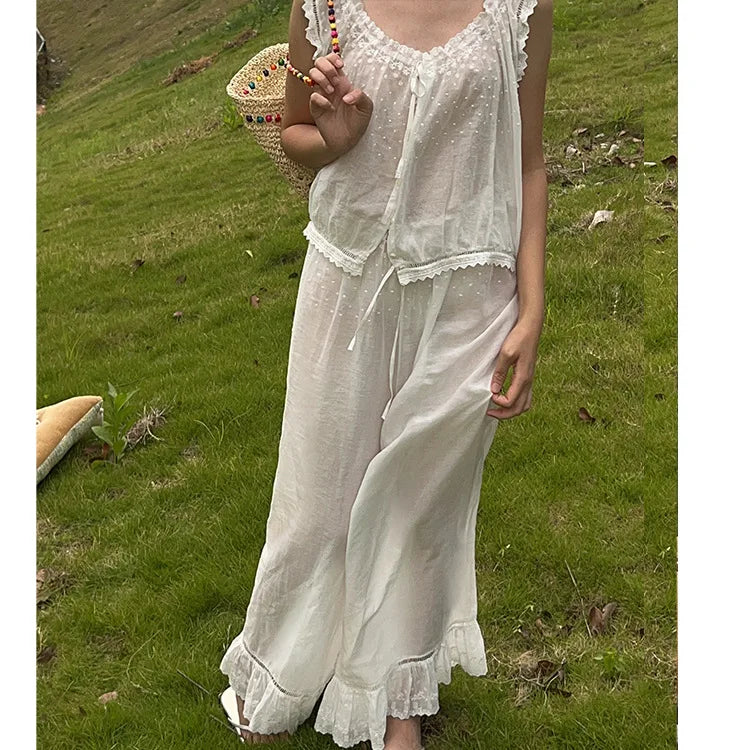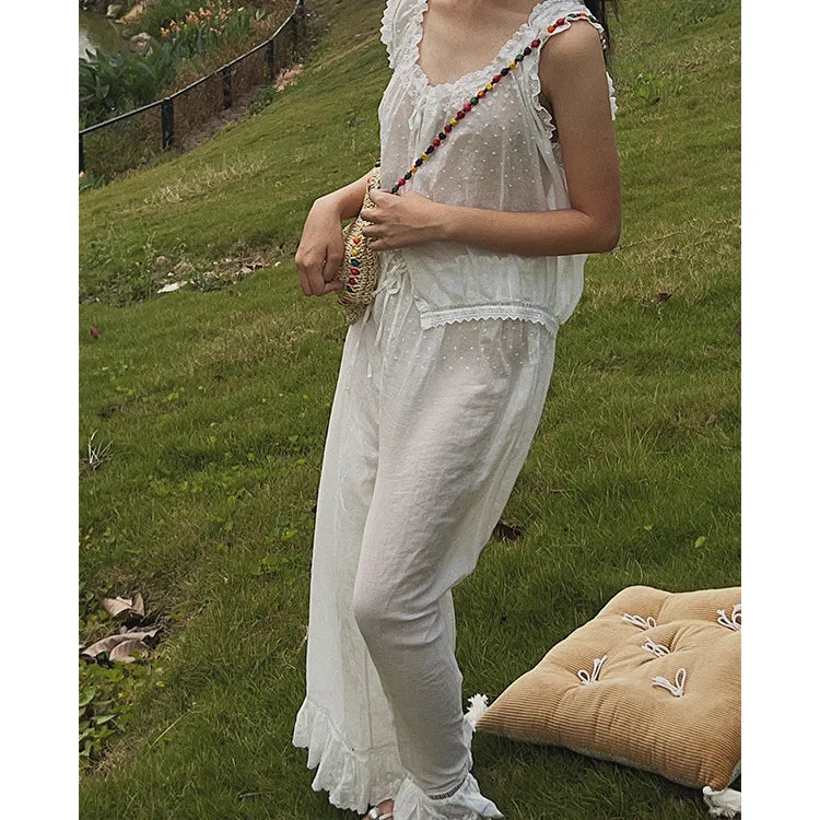 Purpdrank 100% Cotton Embroidered Fairy Pajama Set Retro French All Cotton Summer Thin Edition sleepwear women Sleeveless pants