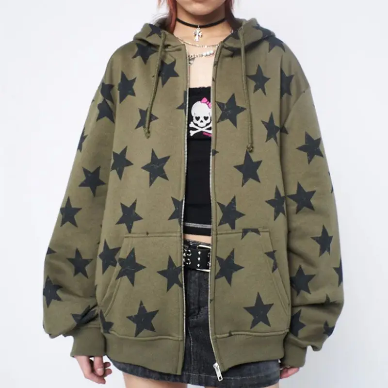 Purpdrank Y2k Clothes Jacket Women Autumn American Retro Zipper Cute Star Printed Cardigan Green Coat Hoodie Ins Jaquetas