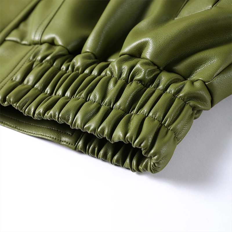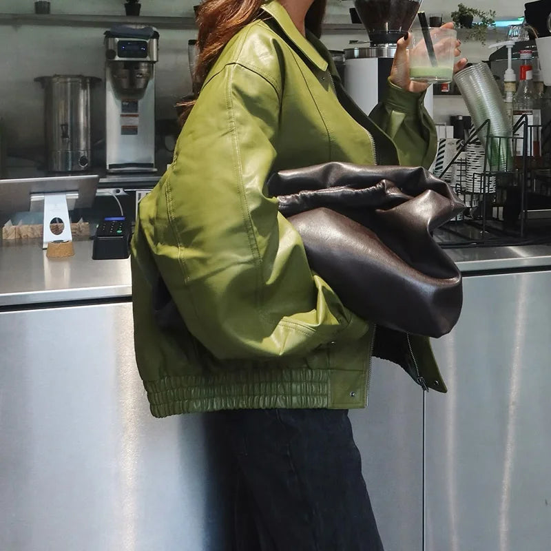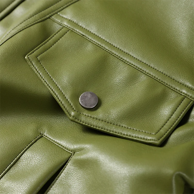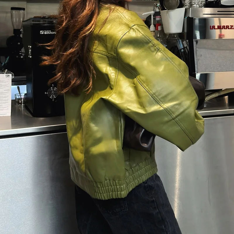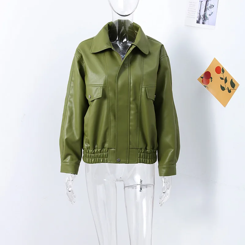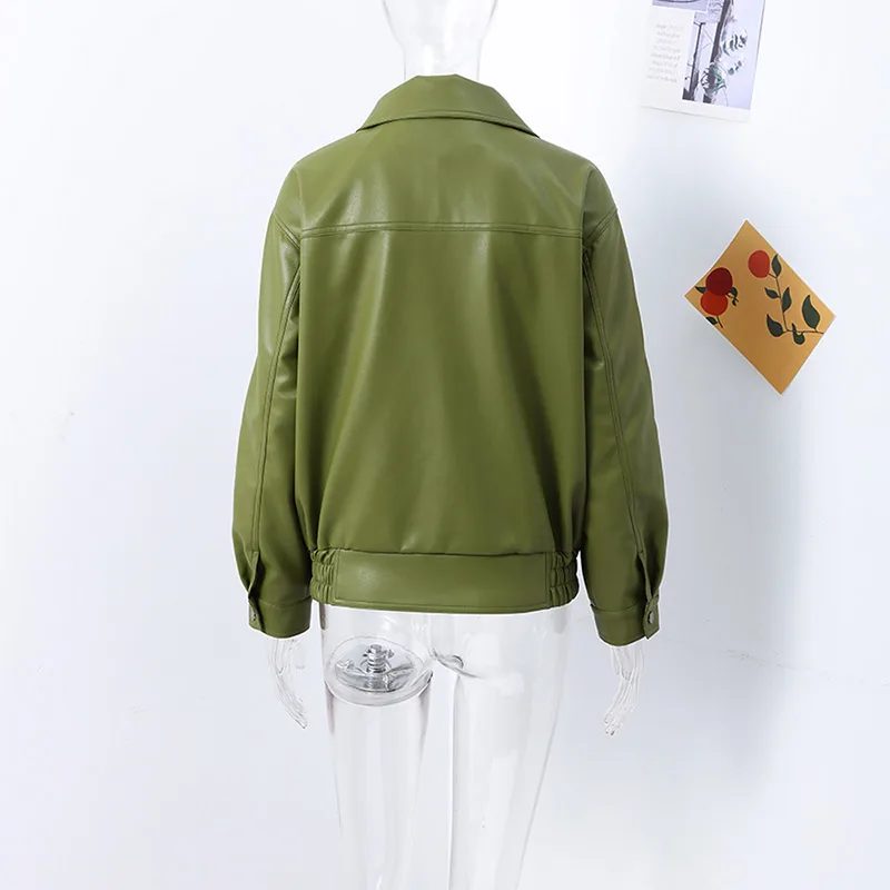 Purpdrank Fashion Green Leather PU Jacket Women Loose Laple Zipper Long Sleeve Single Breasted Pocket Coat 2025 Autumn New Lady Streetwear