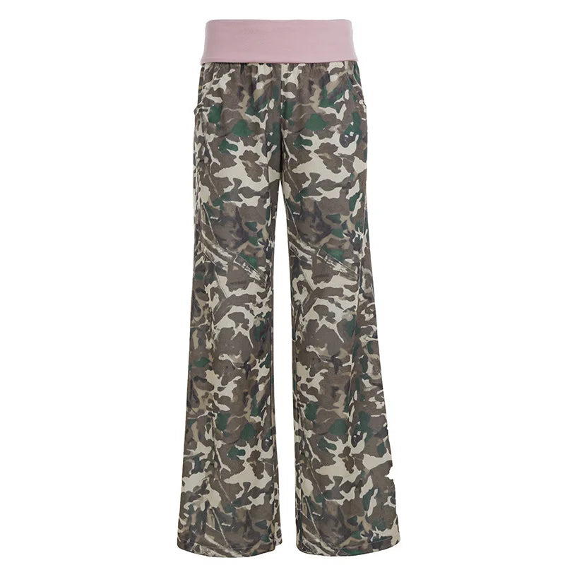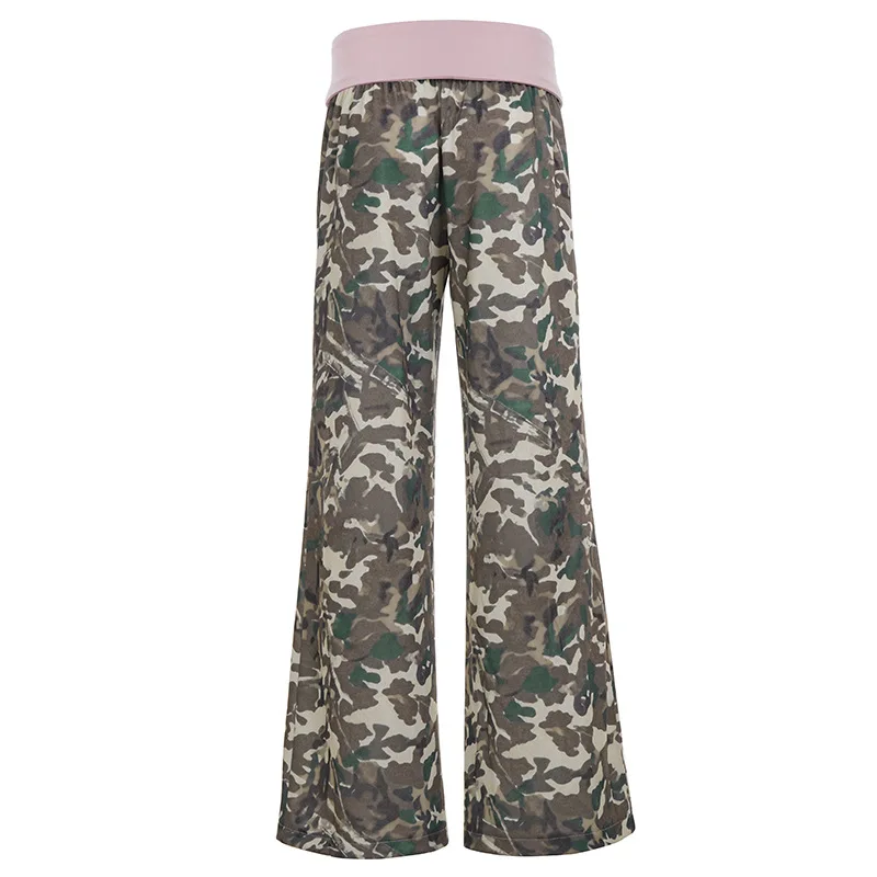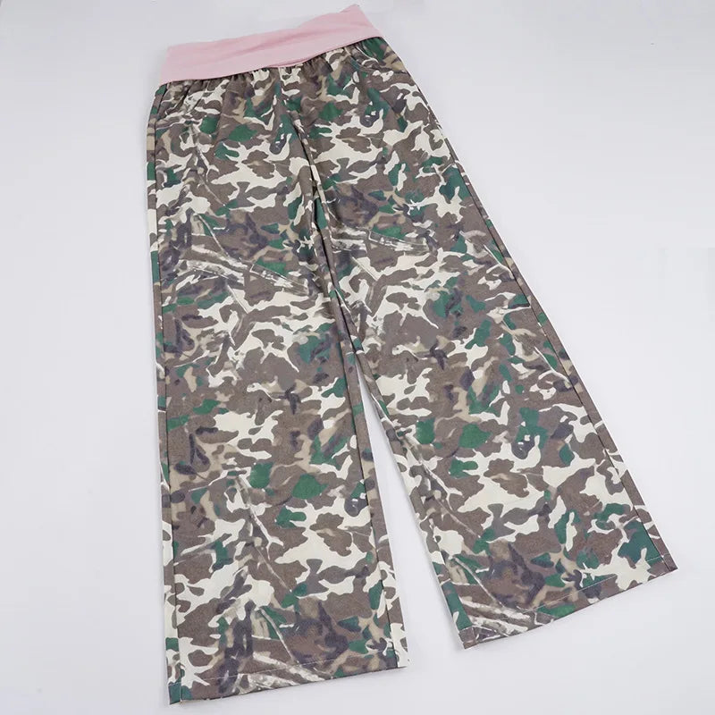 Purpdrank American Retro Camouflage Print Wide Leg Pants Women's Color Match Loose Straight Casual Streetwear Trousers with Pockets